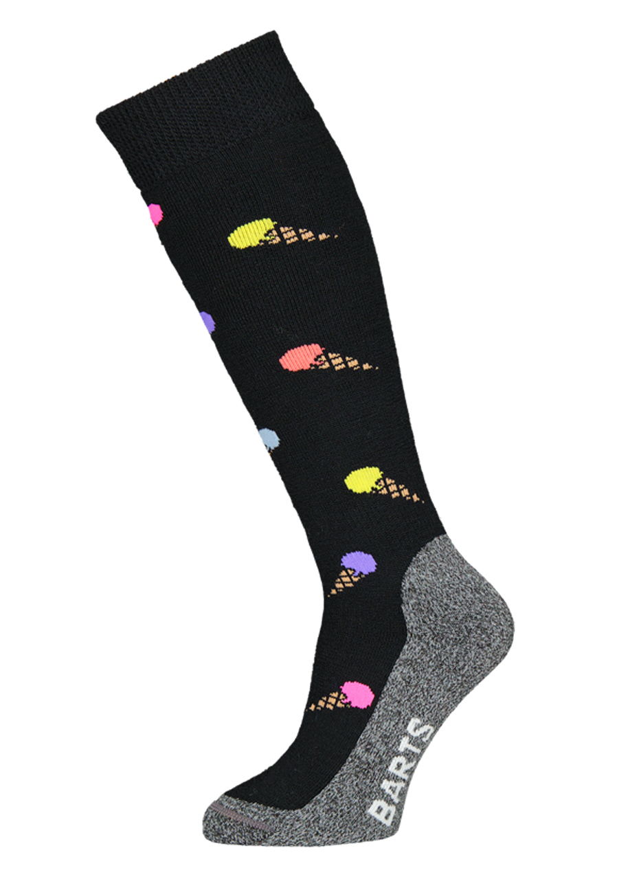 Parametry: Materiał : 75% bawełna, 22% poliamid, 3% elastan Cięcie : wysokie - do kolan Cechy : ciepły, miękki, oddychający, z elastycznym brzegiem Projekt : Lody (motyw lodów) Kolor : czarny Nadaje się do : jazdy na nartach, sportów zimowych, noszenia na co dzień