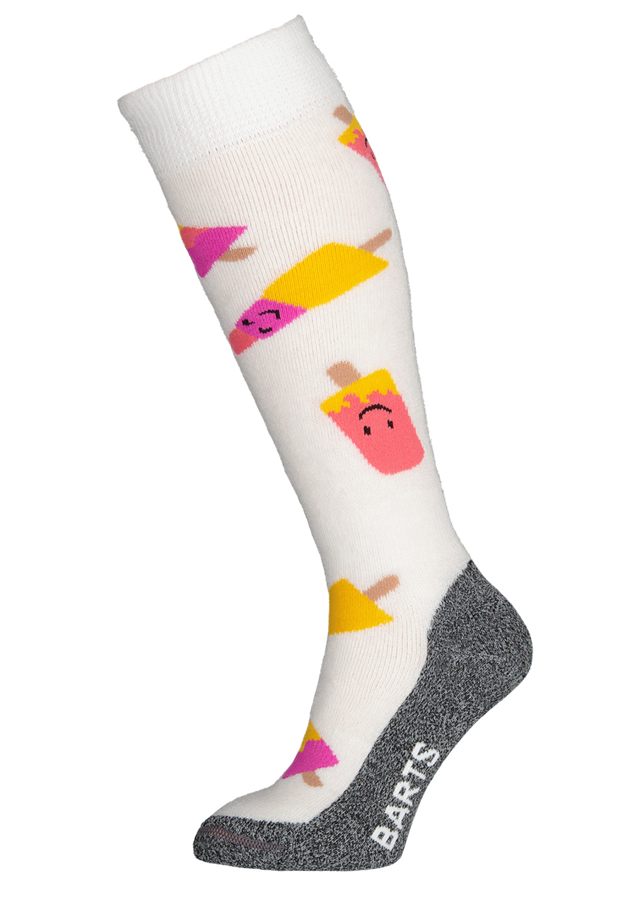 Białe skarpetki Barts Skisock Popsicle Kids z wesołym motywem lodów na patyku uprzyjemnią dzieciom każdy dzień w górach i podczas zimowych zabaw. Elastyczny i ciepły materiał utrzymuje stopy w cieple, zapewnia komfort w butach narciarskich i chroni przed otarciami. Dzięki oryginalnemu wzornictwu staną się popularnym dodatkiem do zimowej garderoby dzieci.