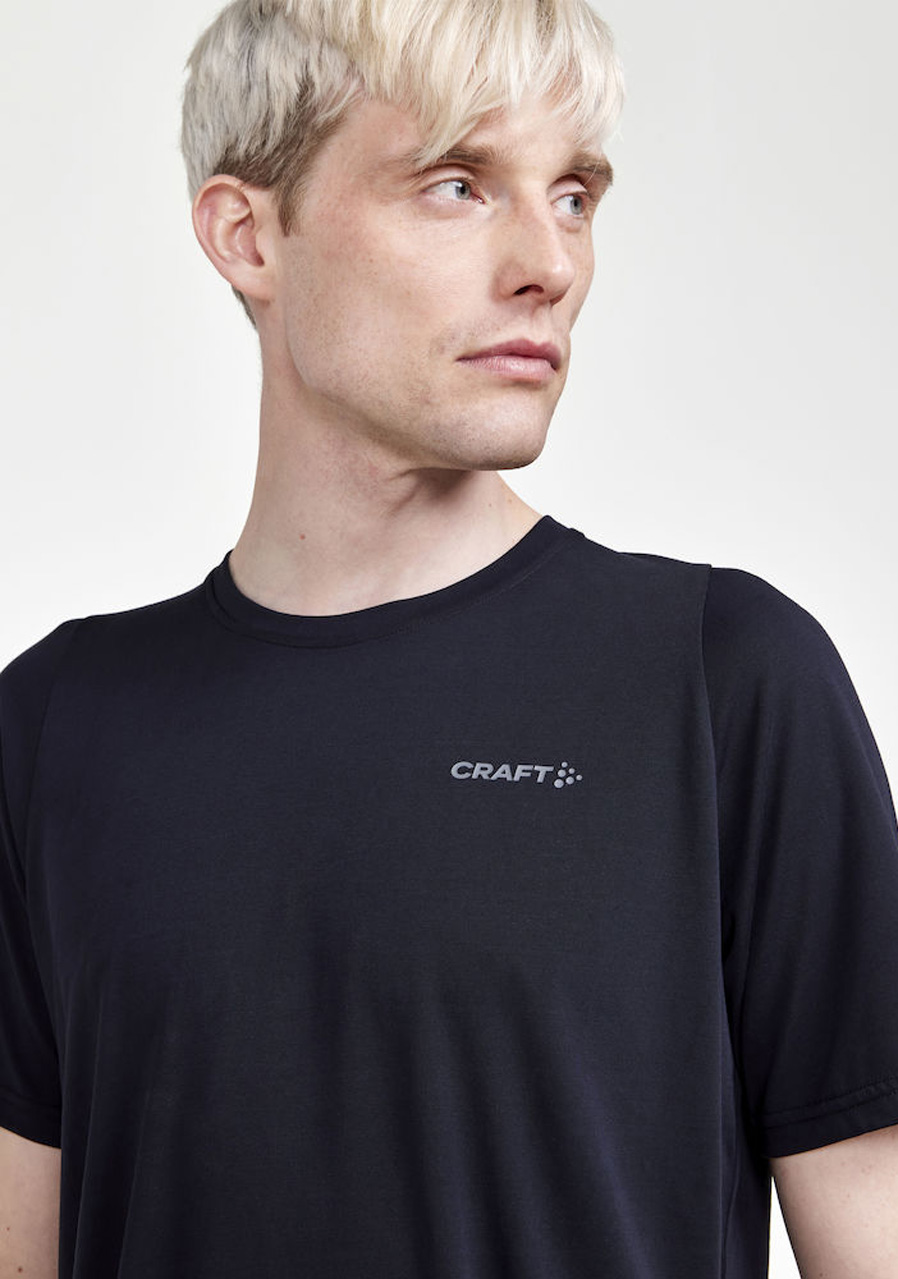 Męska koszulka Craft CORE Essence Bi-Blend w uniwersalnym czarnym kolorze łączy swobodny styl z funkcjonalnością. Dzięki połączeniu włókien technicznych i naturalnych jest miękka w dotyku, oddychająca i idealna do codziennego noszenia, lekkiej aktywności fizycznej oraz relaksu. Klasyczny krój z subtelnym logo Craft zapewnia ponadczasowy wygląd i maksymalny komfort.