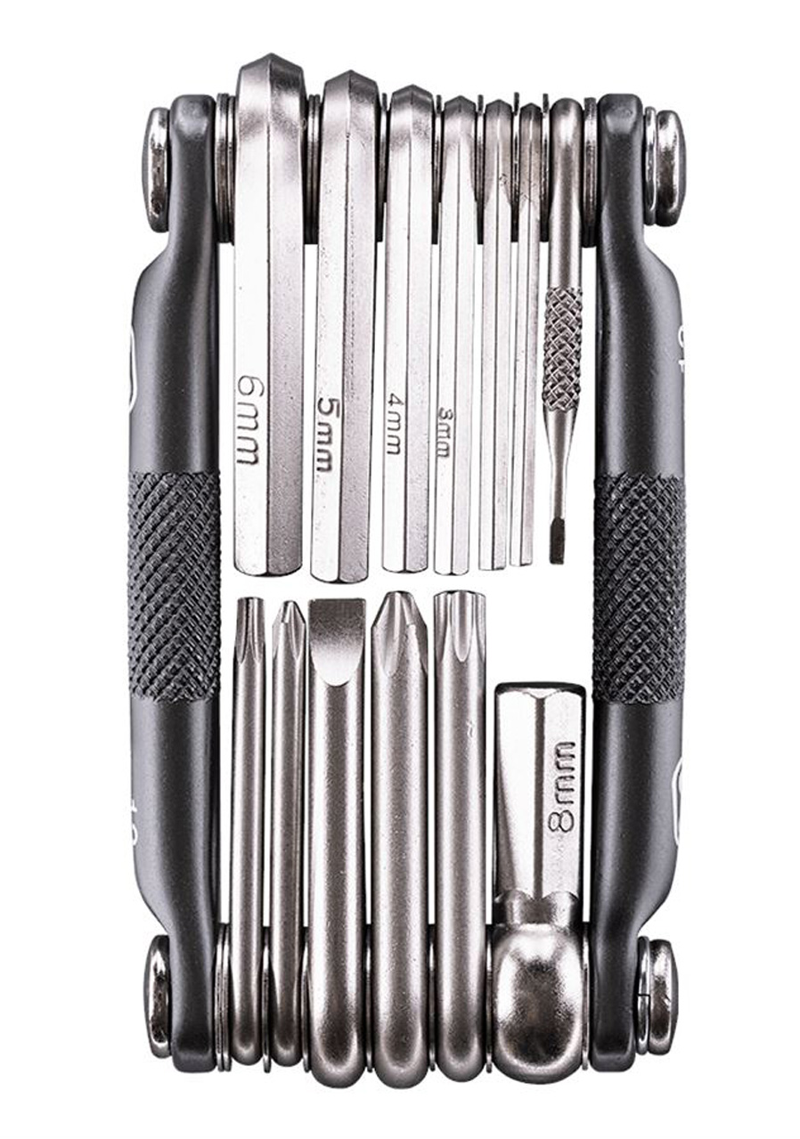 Główne cechy: Zintegrowany aplikator do naprawy opon bezdętkowych Przestrzeń do przechowywania wkładów i spinki do łańcucha Lekka i wytrzymała konstrukcja z aluminium 6061 T6 Siedem kluczy imbusowych 2 / 2,5 / 3 / 4 / 5 / 6 / 8 mm Trzy śrubokręty dwa krzyżakowe i jeden płaski Torx T10 i T25 Waga 164 g