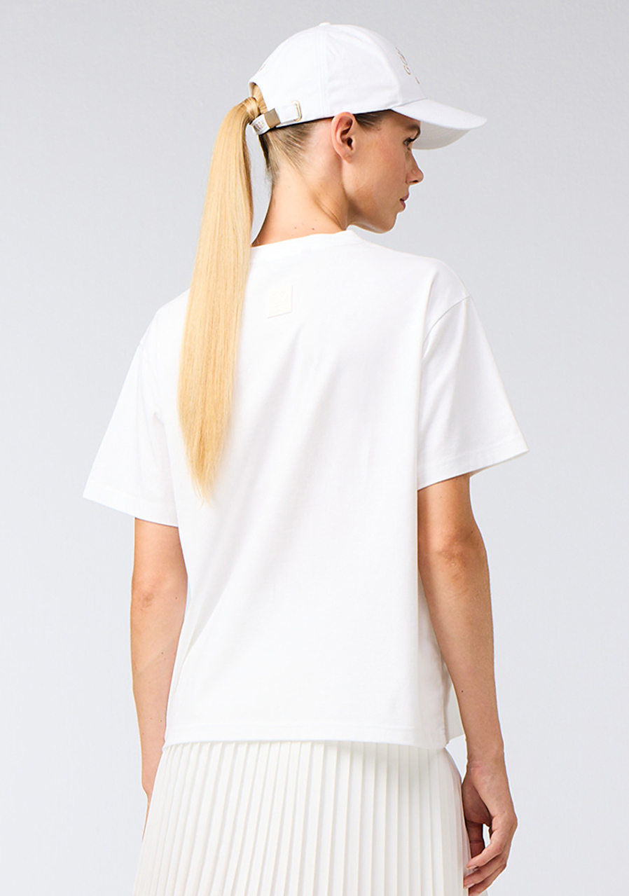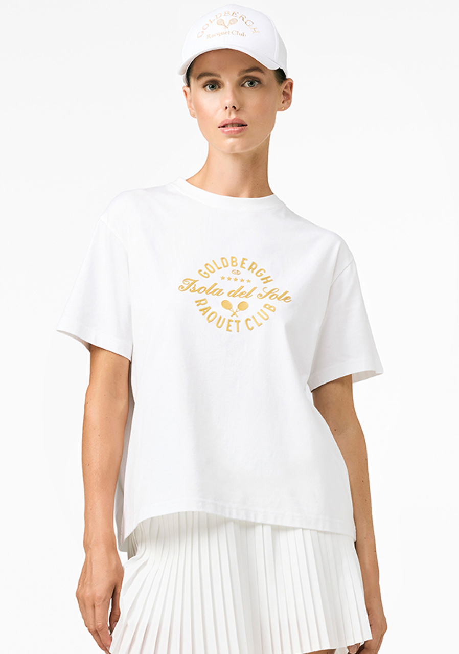 Prosty krój regular zapewnia wygodę noszenia i naturalnie dopasowuje się do sylwetki, a miękka bawełniana dzianina jest przyjemna w dotyku i przewiewna, idealna do codziennego użytku. Okrągły dekolt z elastycznym ściągaczem utrzymuje kształt i zachowuje czysty, minimalistyczny wygląd. Kontrastowa grafika Isola del Sole Raquet Club z motywem rakiet tenisowych podkreśla sportowy charakter koszulki, a subtelne gumowe logo Goldbergh na plecach dodaje prestiżu marki.
