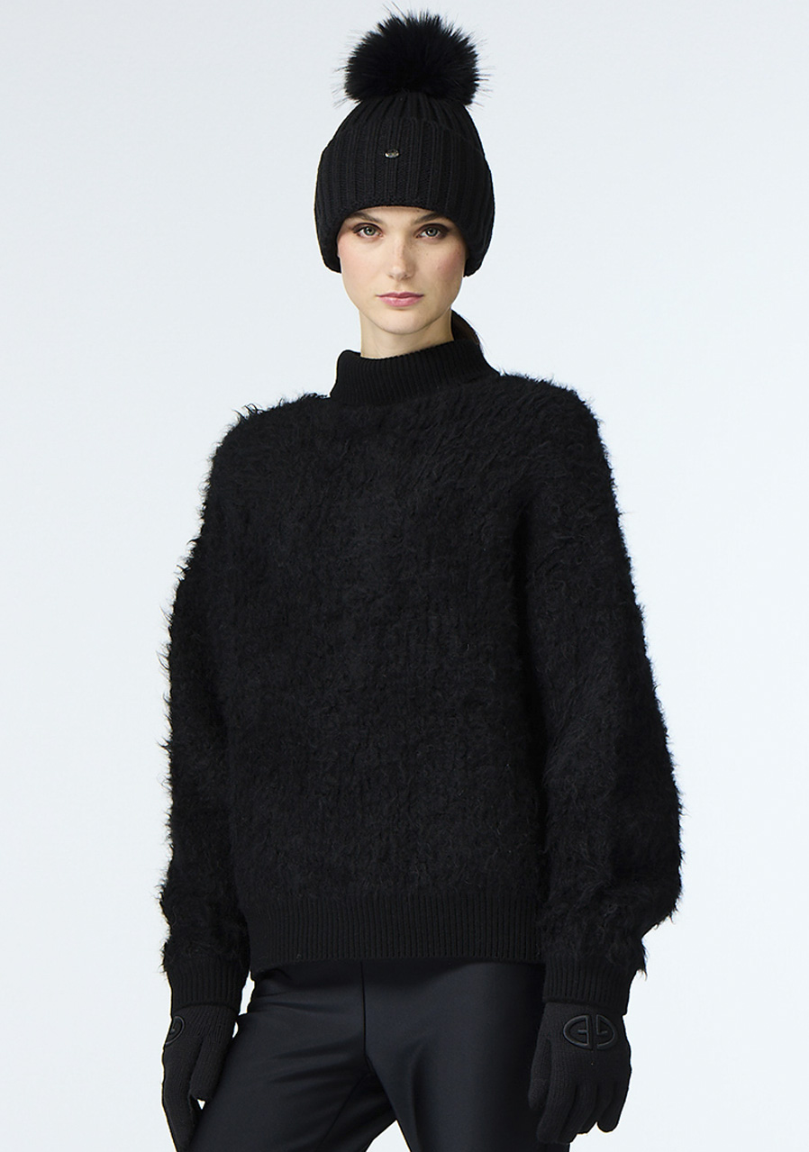 Ten sweter w wygodnym kroju oversize wykonany jest z miękkiego, puszystego dzianego materiału, który zapewnia ciepło i nadaje stylowy, lekko luźny wygląd. Proste rękawy oraz składany prążkowany kołnierz podkreślają prostą elegancję tego modelu. Na rękawie znajduje się subtelna metalowa naszywka, a na boku tkana metka, które podkreślają markowy charakter. Sweter odpowiada standardowemu rozmiarowi, jednak ze względu na oversize fason zalecamy wybór swojego normalnego rozmiaru.