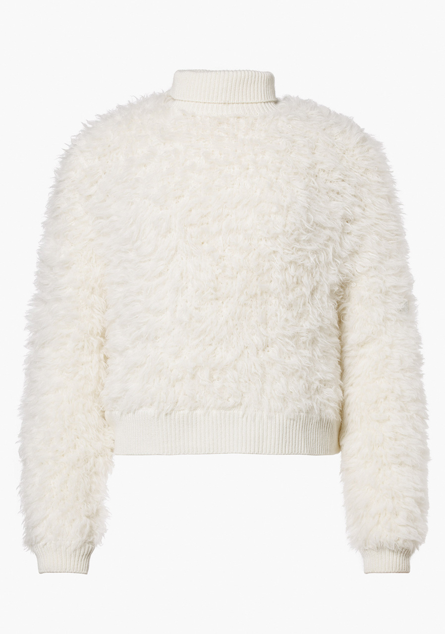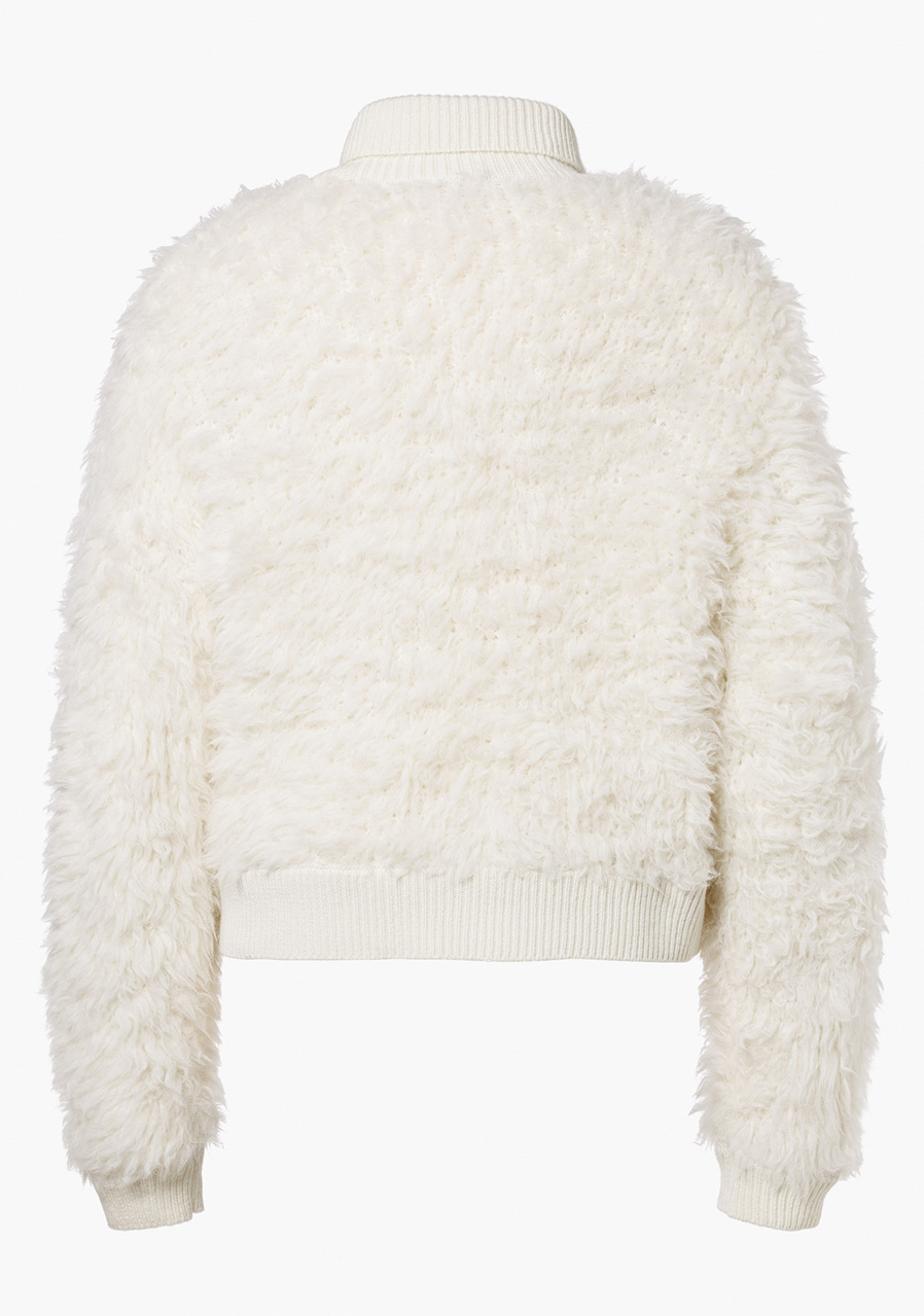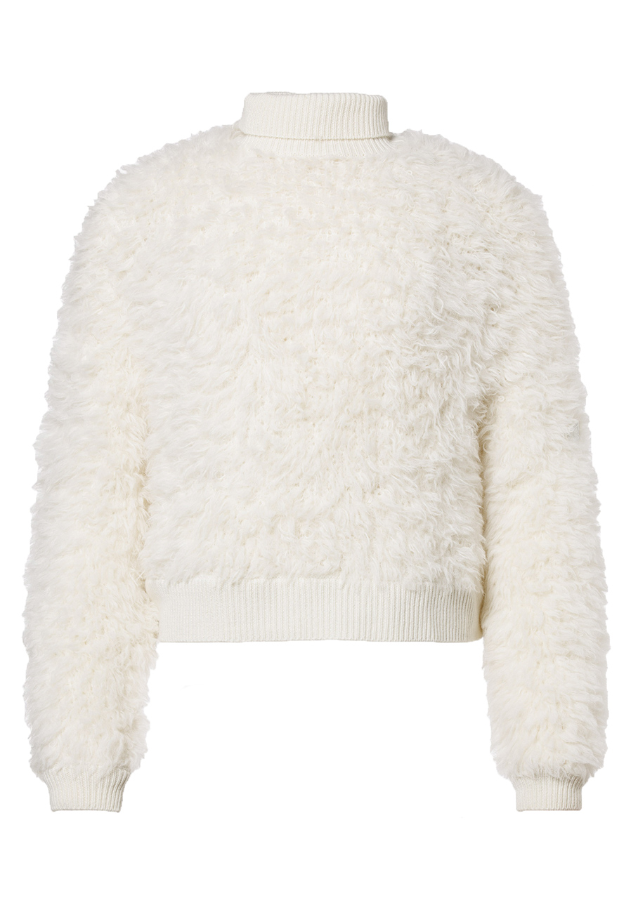 Parametry: Materiał: 87% alpaka, 13% poliester Długość: 55 cm (mierzone od środka pleców, rozmiar M) Krój: oversize fit Detale: proste rękawy, składany prążkowany kołnierz, metalowa naszywka na rękawie, tkana metka na boku Zalecenie dotyczące rozmiaru: odpowiada standardowemu rozmiarowi, oversize fit