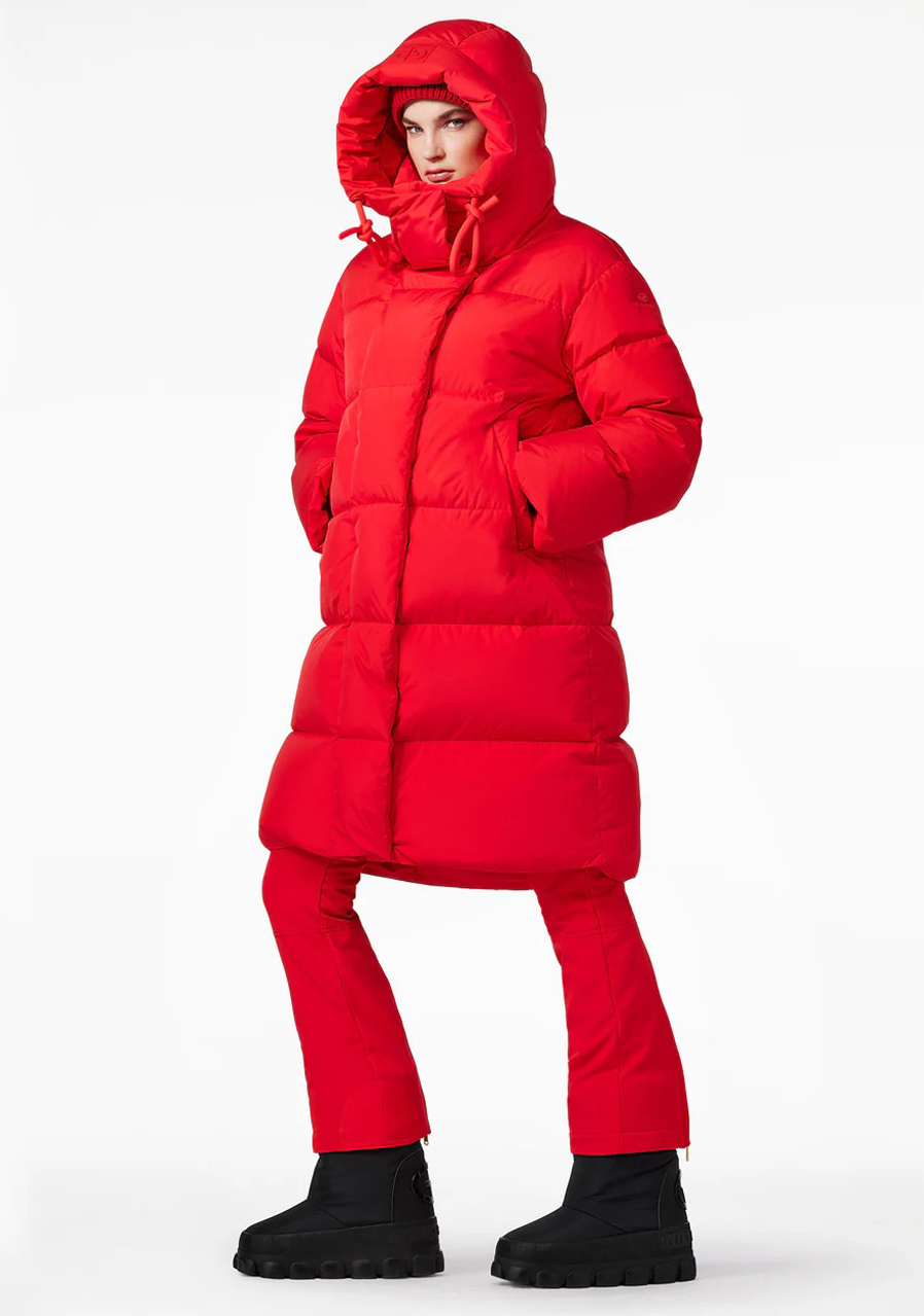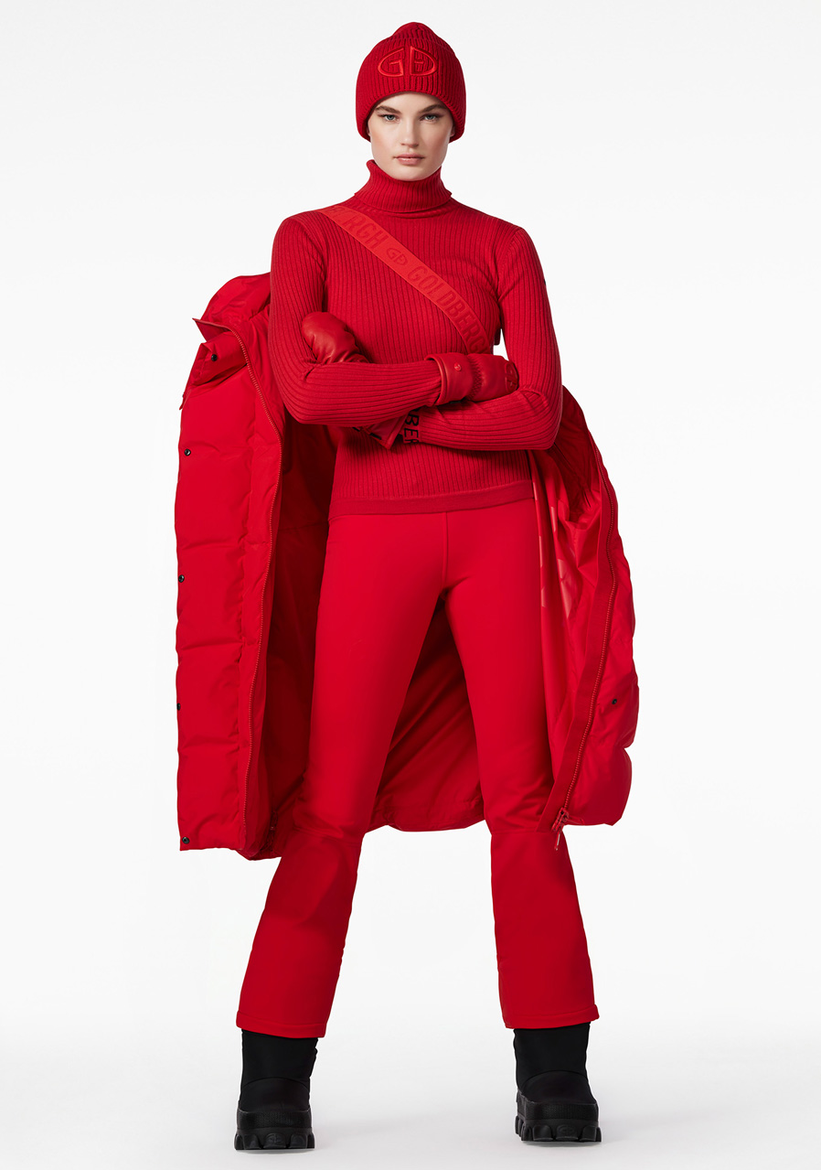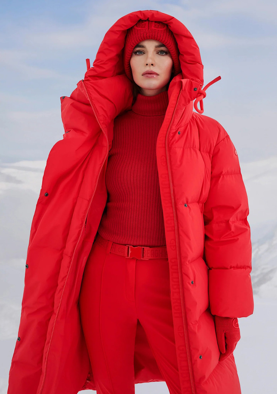 Goldbergh Chaleur Jacket w czerwonym kolorze to luksusowy puchowy płaszcz idealny na zimowe aktywności rekreacyjne i sportowe. Płaszcz ma luźny krój, co zapewnia wygodę i możliwość noszenia warstw. Wyposażony jest w dwie kieszenie zewnętrzne, dwie kieszenie wewnętrzne oraz kieszeń na rękawie na skipass. Ma stały kaptur, dzianinowe mankiety wewnątrz rękawów dla lepszej ochrony przed zimnem oraz stylowy wewnętrzny pasek do noszenia płaszcza na ramieniu.