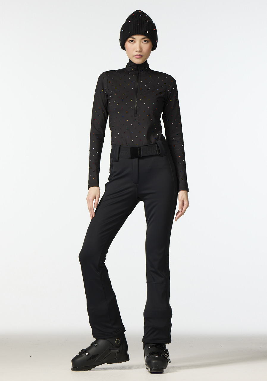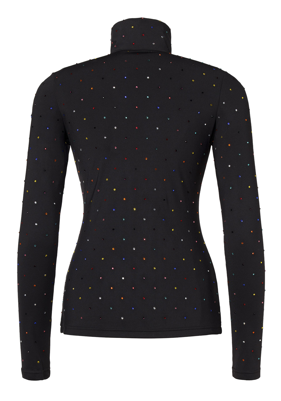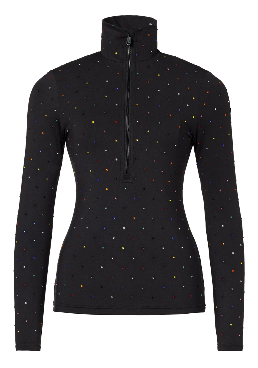 Ta koszulka o kroju slim fit wykonana jest z materiału powerstretch z miękką, drapaną wewnętrzną stroną, która zapewnia maksymalny komfort noszenia. Przedłużony ½ zamek i wąska stójka nadają sportowy wygląd, a rozmieszczone na całej powierzchni kolorowe kryształki strass dodają unikalnego i luksusowego charakteru. Dzięki funkcjonalnym właściwościom, takim jak szybkie schnięcie, kontrola wilgoci oraz wykończenie anti-odor, koszulka jest idealnym towarzyszem zarówno na sporty zimowe, jak i na czas wolny.