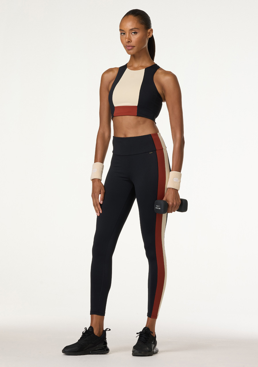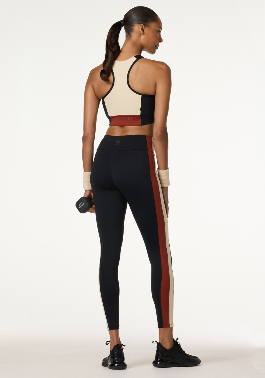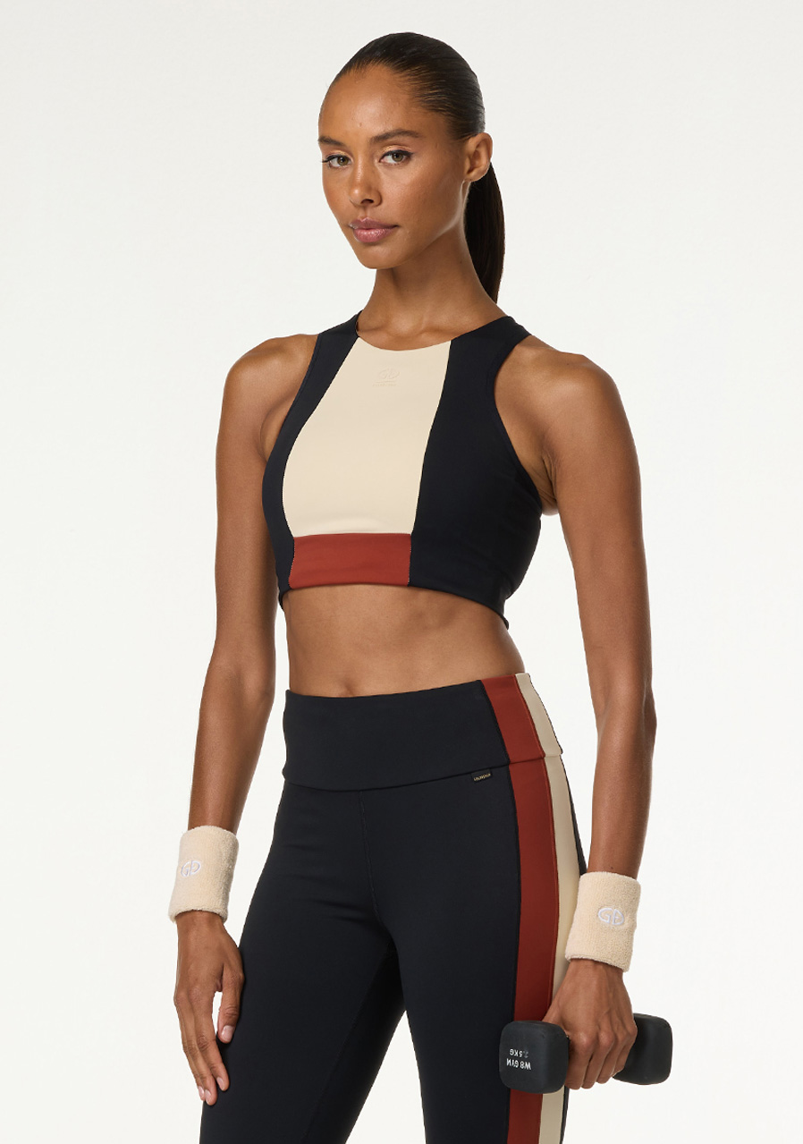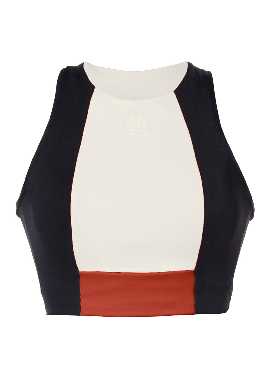 Biustonosz Goldbergh Facade w nowoczesnym sportowym stylu, ozdobiony kolorowymi panelami po bokach w stylu color-blocking. Biustonosz zapewnia średnie wsparcie podczas aktywnych dni. Atrakcyjny wygląd, który przyciąga uwagę. Szybkoschnący, elastyczny materiał PowerStretch skutecznie odprowadza wilgoć i zapachy. Dzięki właściwościom antybakteryjnym zapewnia uczucie świeżości przez cały czas. Ramiączka z tyłu mają zwężony krój typu bokserka. Biustonosz posiada również usztywniane miseczki oraz pas pod biustem z miękką siateczkową podszewką. Z tyłu znajduje się logo marki Goldbergh.