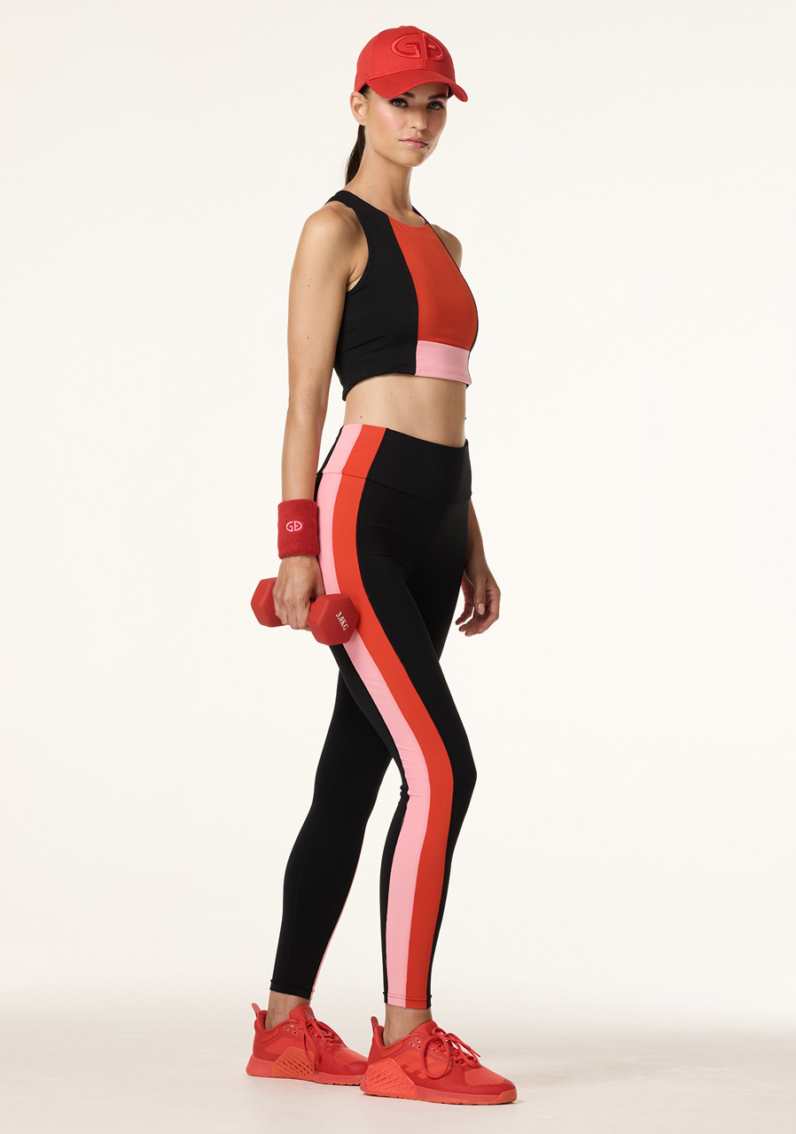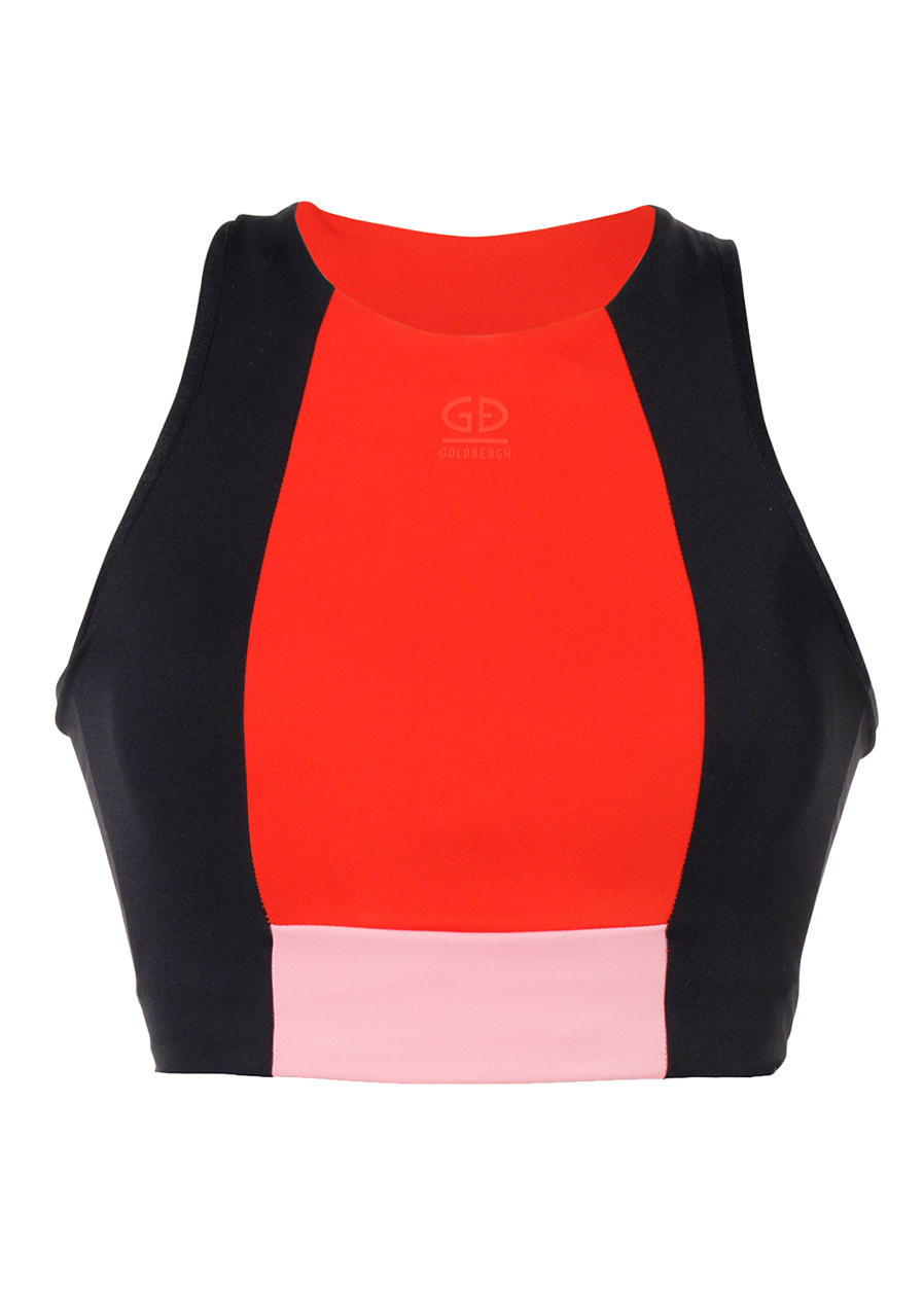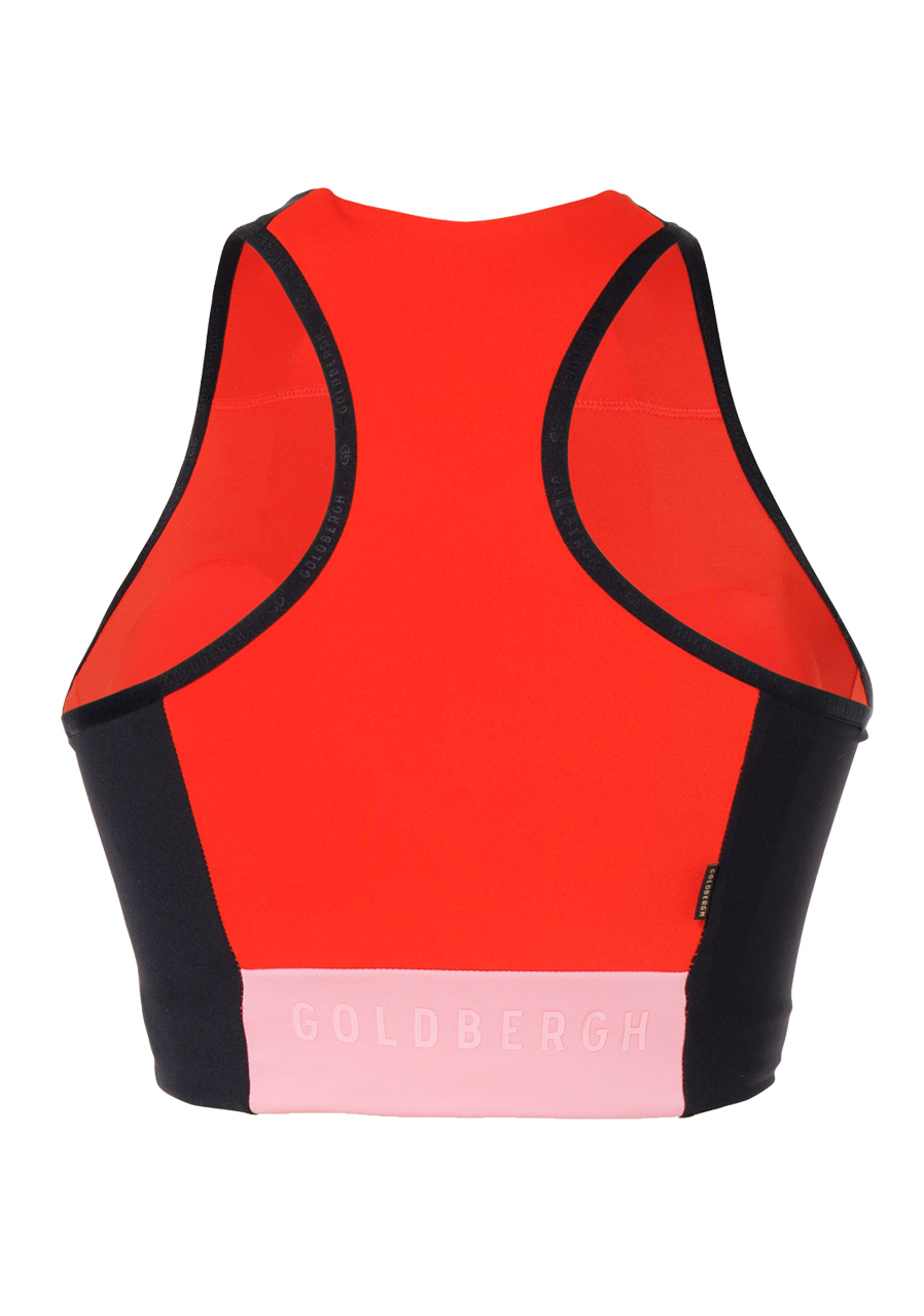 Biustonosz Goldbergh Facade w nowoczesnym sportowym stylu, ozdobiony kolorowymi panelami po bokach w stylu color-blocking. Biustonosz zapewnia średnie wsparcie podczas aktywnych dni. Atrakcyjny wygląd, który przyciąga uwagę. Szybkoschnący, elastyczny materiał PowerStretch skutecznie odprowadza wilgoć i zapachy. Dzięki właściwościom antybakteryjnym zapewnia uczucie świeżości przez cały czas. Ramiączka z tyłu mają zwężony krój typu bokserka. Biustonosz posiada również usztywniane miseczki oraz pas pod biustem z miękką siateczkową podszewką. Z tyłu znajduje się logo marki Goldbergh.