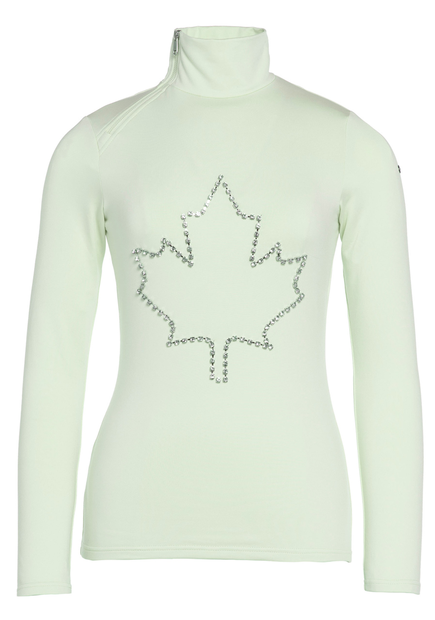 Damski golf Goldbergh Gemstone to elegancki model o stylowym kroju. Dzięki wewnętrznej warstwie z czesanego polaru zapewnia ciepło przez cały dzień i świetnie sprawdza się jako pierwsza lub druga warstwa pod strój narciarski. Błyszczące kryształki Swarovski ® w kształcie liścia klonu na piersi nadają mu wyrafinowany wygląd. Małe logo GB na lewym rękawie dopełnia całości bez nadmiernego rzucania się w oczy. Zamek błyskawiczny umieszczony ukośnie na ramieniu.