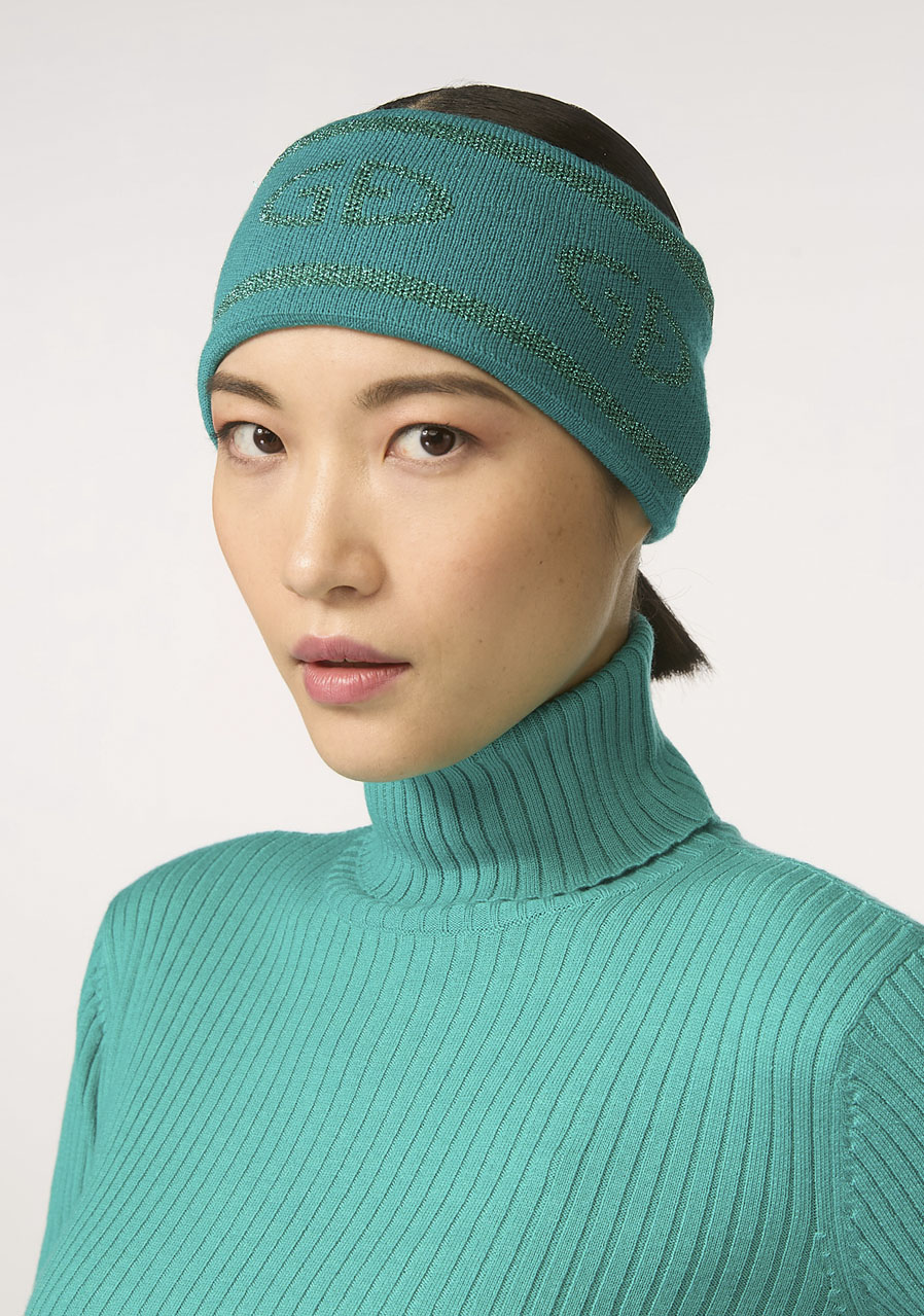 Ta elegancka opaska została wykonana z delikatnej dzianiny z 100% wełny merino i ozdobiona tonowanym żakardowym logo GB z lureksem, które dodaje subtelnego połysku i luksusowego wyglądu. Wnętrze zostało podszyte miękkim polarem, zapewniającym maksymalny komfort i ciepło w chłodne dni. Opaska ma długość 23 cm od złożonej krawędzi do złożonej krawędzi i posiada tkaną metkę marki na tylnym szwie.
