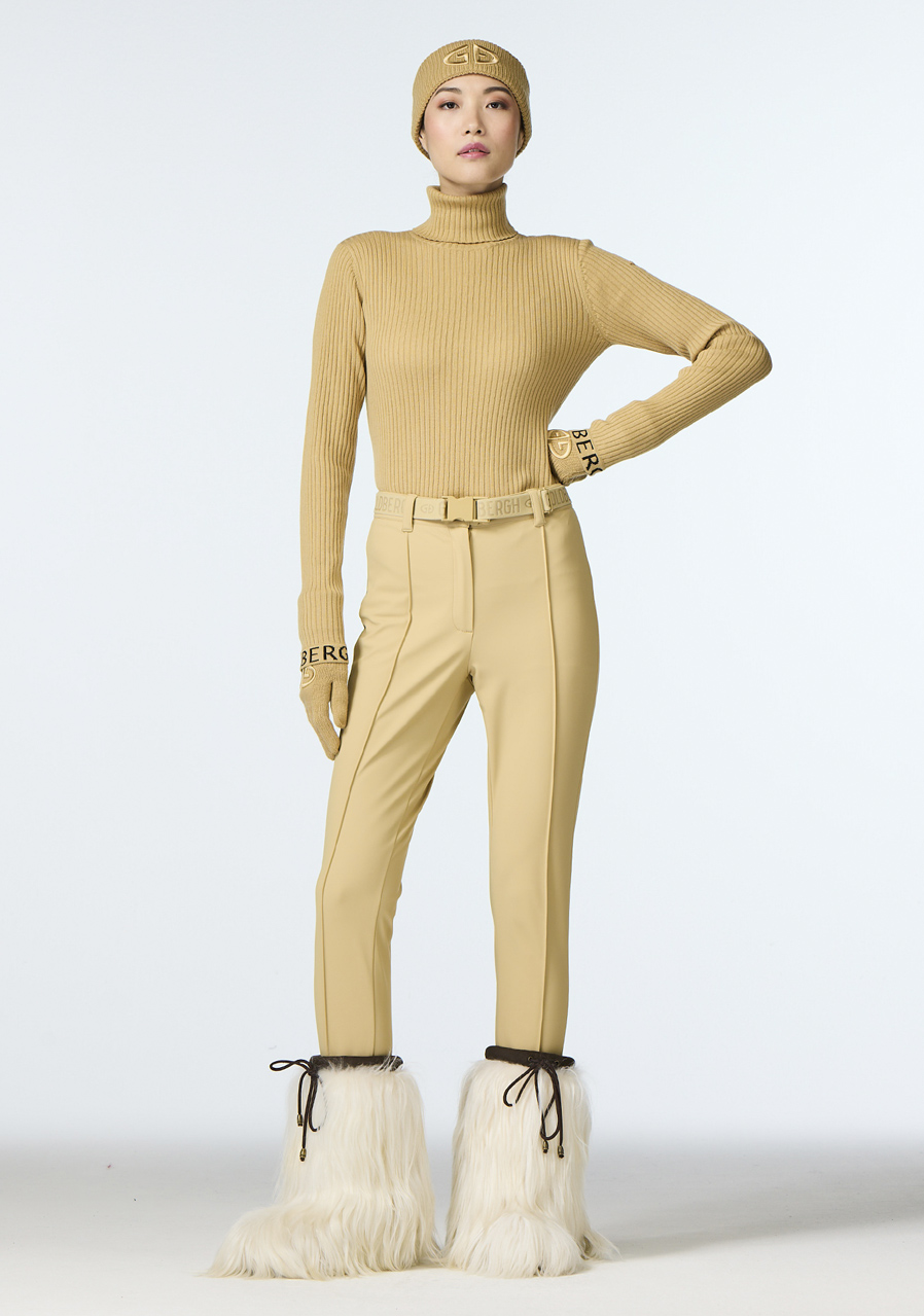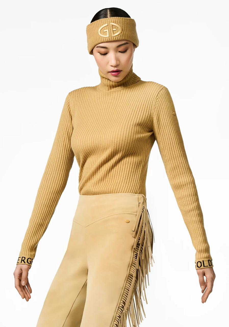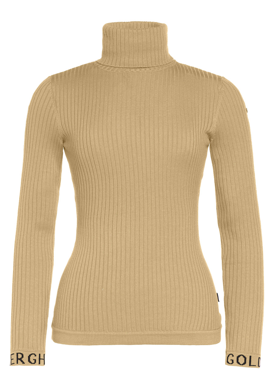 Ten dopasowany golf z delikatnej prążkowanej dzianiny oferuje obcisły krój, który pięknie podkreśla sylwetkę. Przełożony kołnierz zapewnia przyjemne ciepło, a kontrastowy napis Goldbergh na mankietach dodaje sportowego i nowoczesnego akcentu. Metalowe i tkane logo na rękawie i boku stanowią stylowy detal podkreślający wysoką jakość swetra.