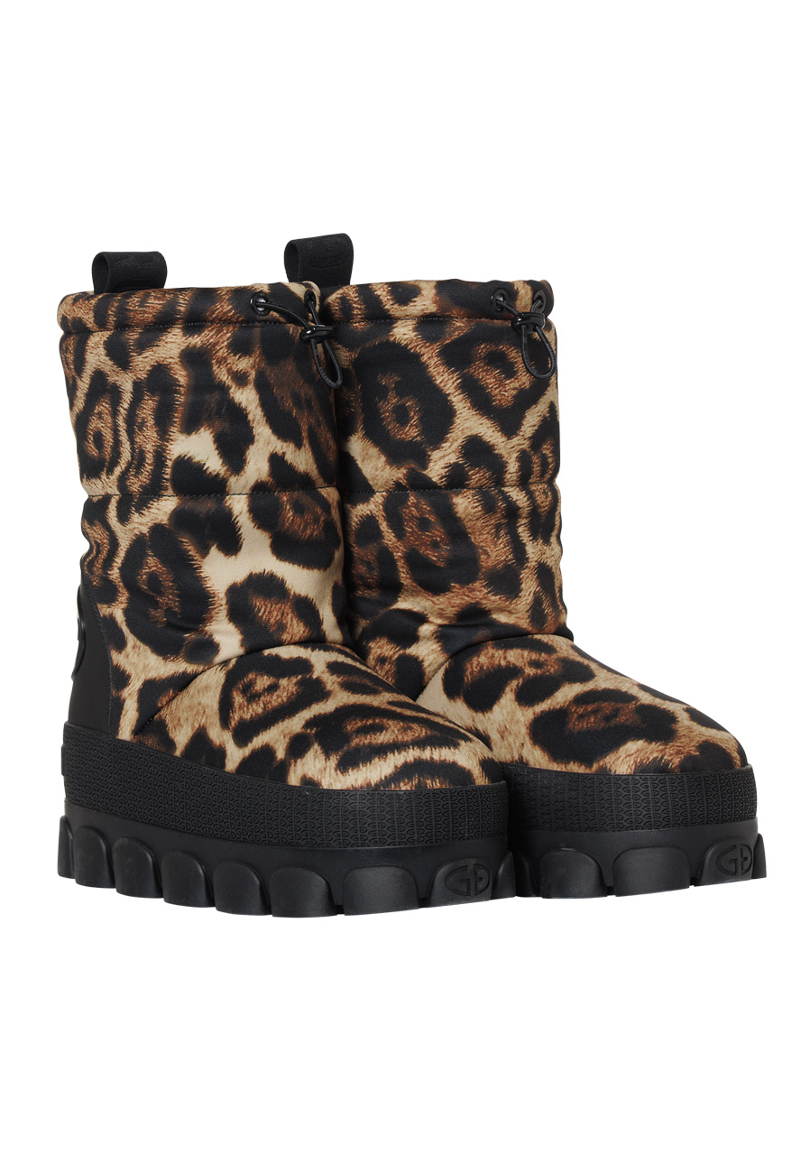 Te śniegowce za kostkę łączą odważny design z praktycznym zimowym wyposażeniem. Cholewka z softshellu ozdobiona jest wyrazistym, pełnopowierzchniowym nadrukiem w panterkę, uzupełnionym o masywną podeszwę, która nadaje całości nowoczesny i wytrzymały charakter. Wodoodporna wewnętrzna konstrukcja utrzymuje stopy w suchości, a elastyczny sznurek z logo oraz regulowany stoper zapewniają wygodne i pewne dopasowanie w górnej części. Trójwymiarowe logo GB na pięcie oraz elastyczna pętla z tyłu ułatwiają zakładanie obuwia.