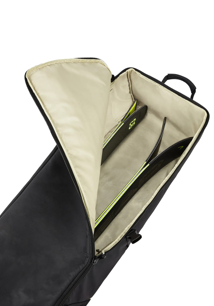 Dane techniczne: Przeznaczenie : pokrowiec na 2 pary nart i kijki Wymiary : 203 × 18 × 28 cm – zapewnia wystarczająco dużo miejsca na dłuższe narty, nawet przy geometrii freeride Pojemność : 105 l – duża pojemność na narty i akcesoria Waga : 2570 g – solidna konstrukcja bez zbędnego ciężaru Materiał (zewnętrzny) : 100% PU (poliuretan) - trwała i wodoodporna powierzchnia chroniąca zawartość Materiał (wewnętrzny) : 100% poliester – gładka, trwała powierzchnia wewnętrzna ułatwiająca czyszczenie Zapięcie : zamek błyskawiczny na całej długości zapewniający szybki dostęp i wygodne pakowanie Organizacja : dwa wewnętrzne pokrowce na kije – zapewniają stabilne przechowywanie kijów podczas transportu Wykonanie : solidna konstrukcja z uchwytami i paskami ułatwiającymi przenoszenie, kompatybilna z torbami podróżnymi HEAD.