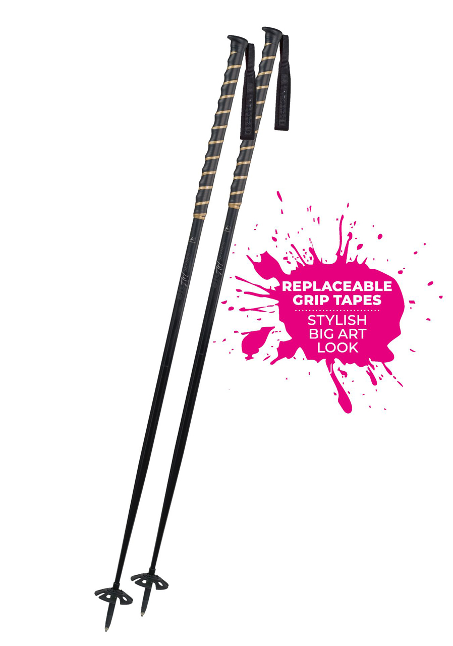 Materiał : Fat Carbon, bardzo lekka i sztywna konstrukcja z włókna węglowego Uchwyt : Ergonomiczny kształt zapewniający pewny chwyt Pasek : Regulowany, zapewniający bezpieczne prowadzenie Koszyk : Sport uniwersalny Wskazówka : Węglik spiekany zapewniający pewny chwyt na twardych powierzchniach Przeznaczone do : narciarstwa wyczynowego, jazdy carvingowej z dużą prędkością, wymagających sportów