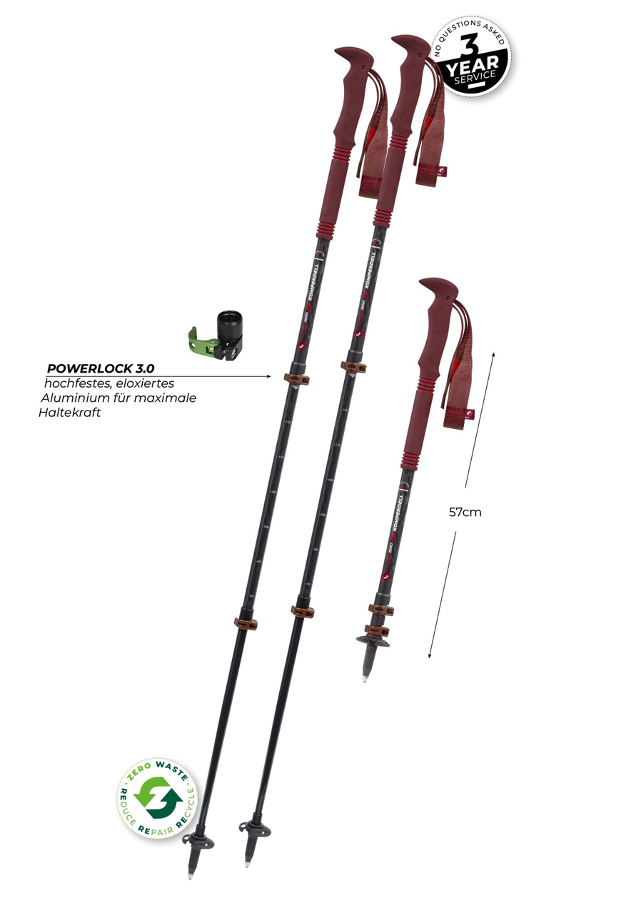 Trójsegmentowa składana konstrukcja z systemem blokady Powerlock 3.0 umożliwia szybkie i bezpieczne dopasowanie długości kijów, a ergonomiczne uchwyty z pianki EVA oraz regulowane paski gwarantują komfort nawet przy całodziennym użytkowaniu.