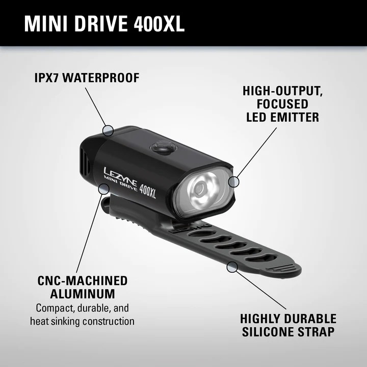 Wysokowydajna lampka Lezyne Mini Drive 400XL zapewnia do 400 lumenów z jednej diody LED, umieszczonej w solidnej aluminiowej obudowie zoptymalizowanej pod kątem odprowadzania ciepła. Wyposażona w zintegrowany akumulator ładowany przez USB. Pełne ładowanie trwa około 2,5 godziny. Lampka oferuje 8 trybów świecenia i migania. W zestawie elastyczne paski do łatwego montażu na większości kierownic.