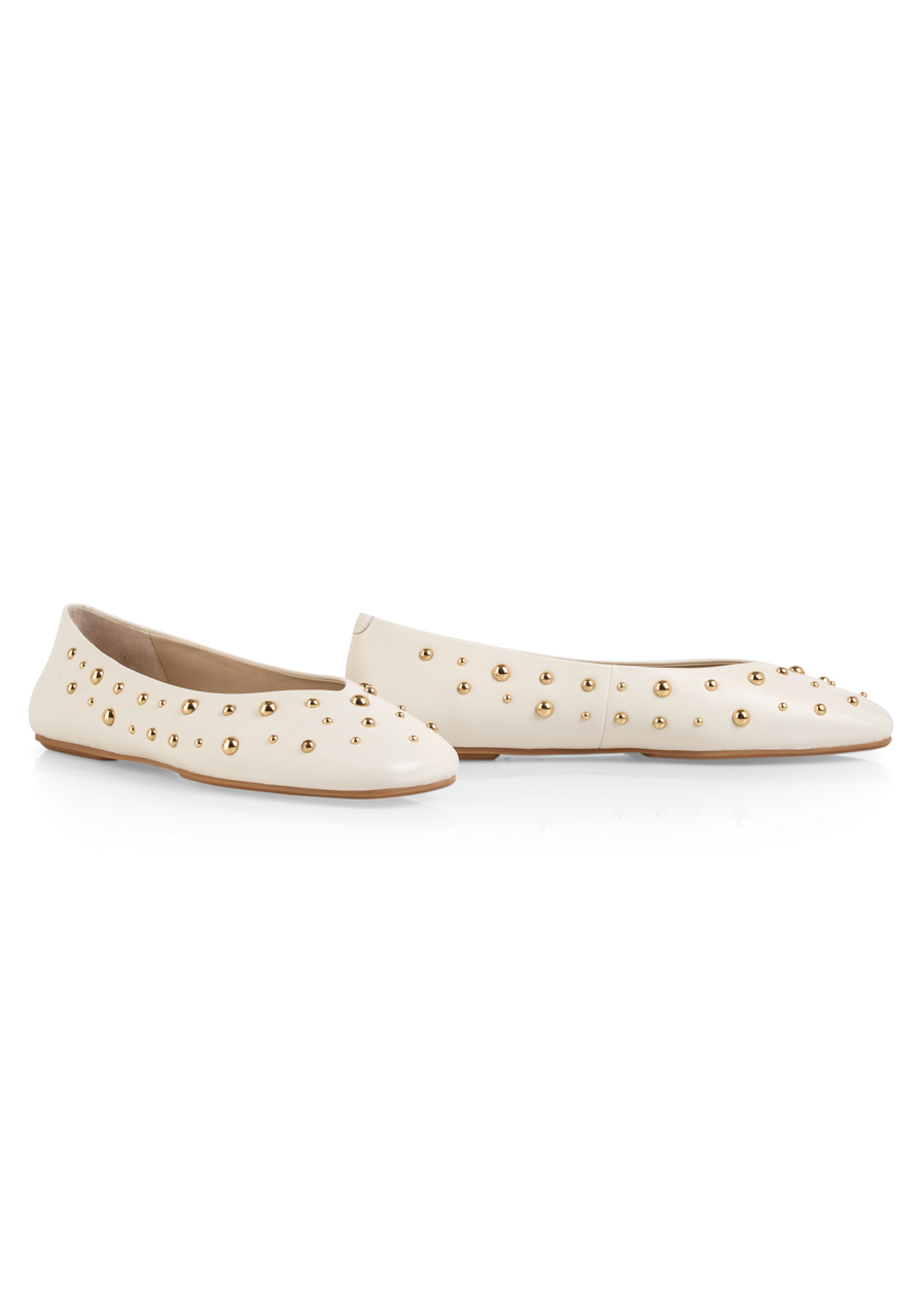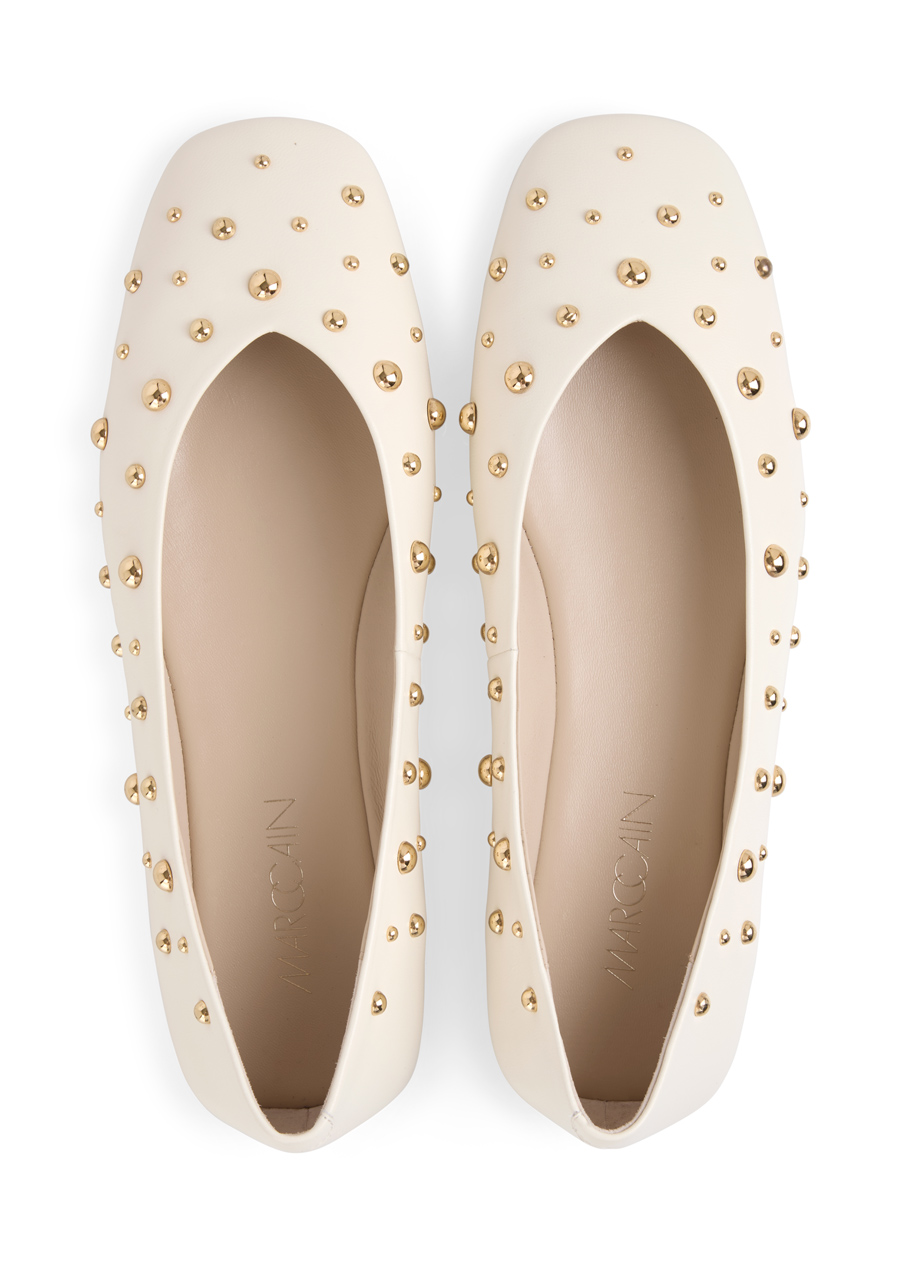 Miękka skóra naturalna i skórzana wyściółka zapewniają wyjątkowy komfort noszenia na co dzień. Nowoczesne baleriny z okrągłym noskiem uzupełnione są stylowymi, ozdobnymi ćwiekami, które nadają im niepowtarzalnego charakteru. Dzięki uniwersalnemu designowi z łatwością dopasujesz je do jeansów, spódnic i sukienek. Gumowa podeszwa zapewnia elastyczność i pewność kroku, a niski obcas gwarantuje naturalny komfort.