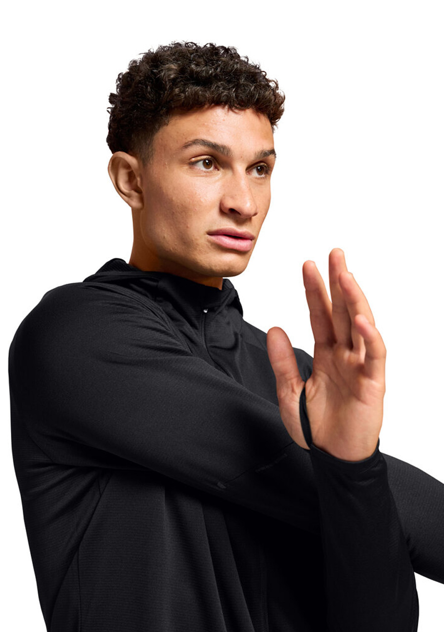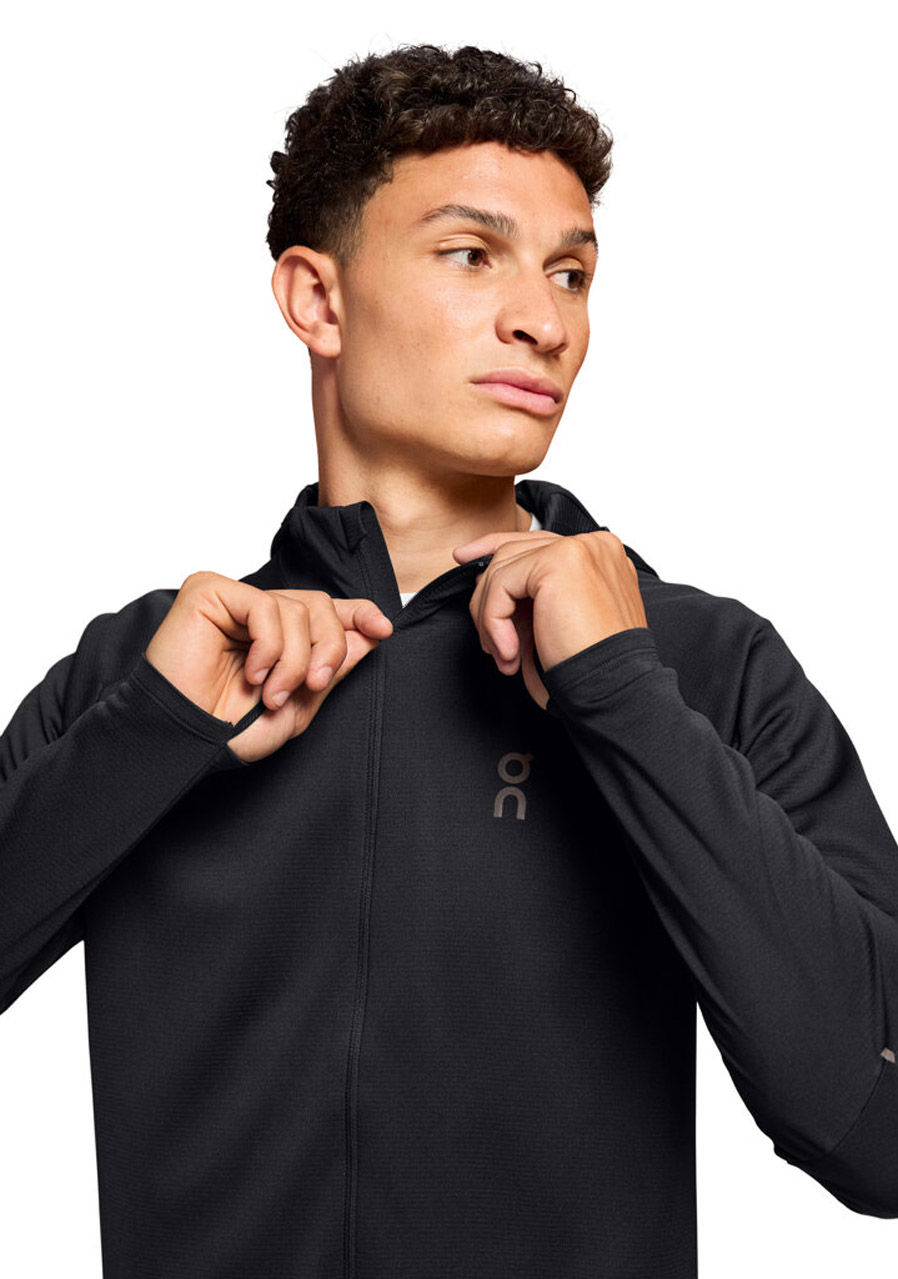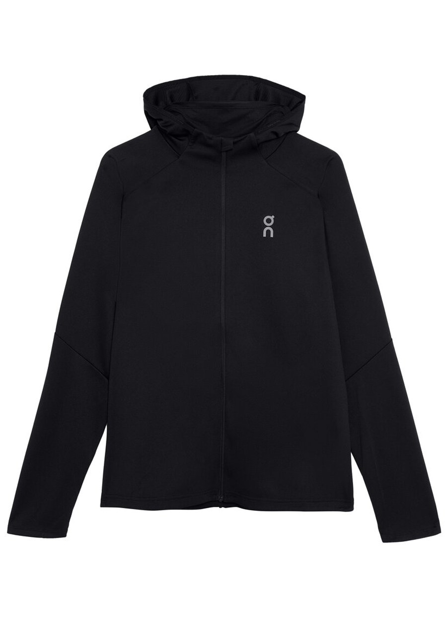 Bluza z kapturem On Running Climate Zip Hoodie w kolorze czarnym to uniwersalna warstwa wierzchnia do biegania i noszenia na co dzień w chłodniejsze dni. Dzięki technicznemu materiałowi ze strefami wentylacyjnymi utrzymuje idealną temperaturę ciała – ogrzewa w niskich temperaturach, a jednocześnie skutecznie odprowadza wilgoć podczas intensywnej aktywności. Wydłużony krój i ergonomiczny design zapewniają swobodę ruchów, a praktyczny kaptur i zamek błyskawiczny na całej długości ułatwiają zakładanie warstw.