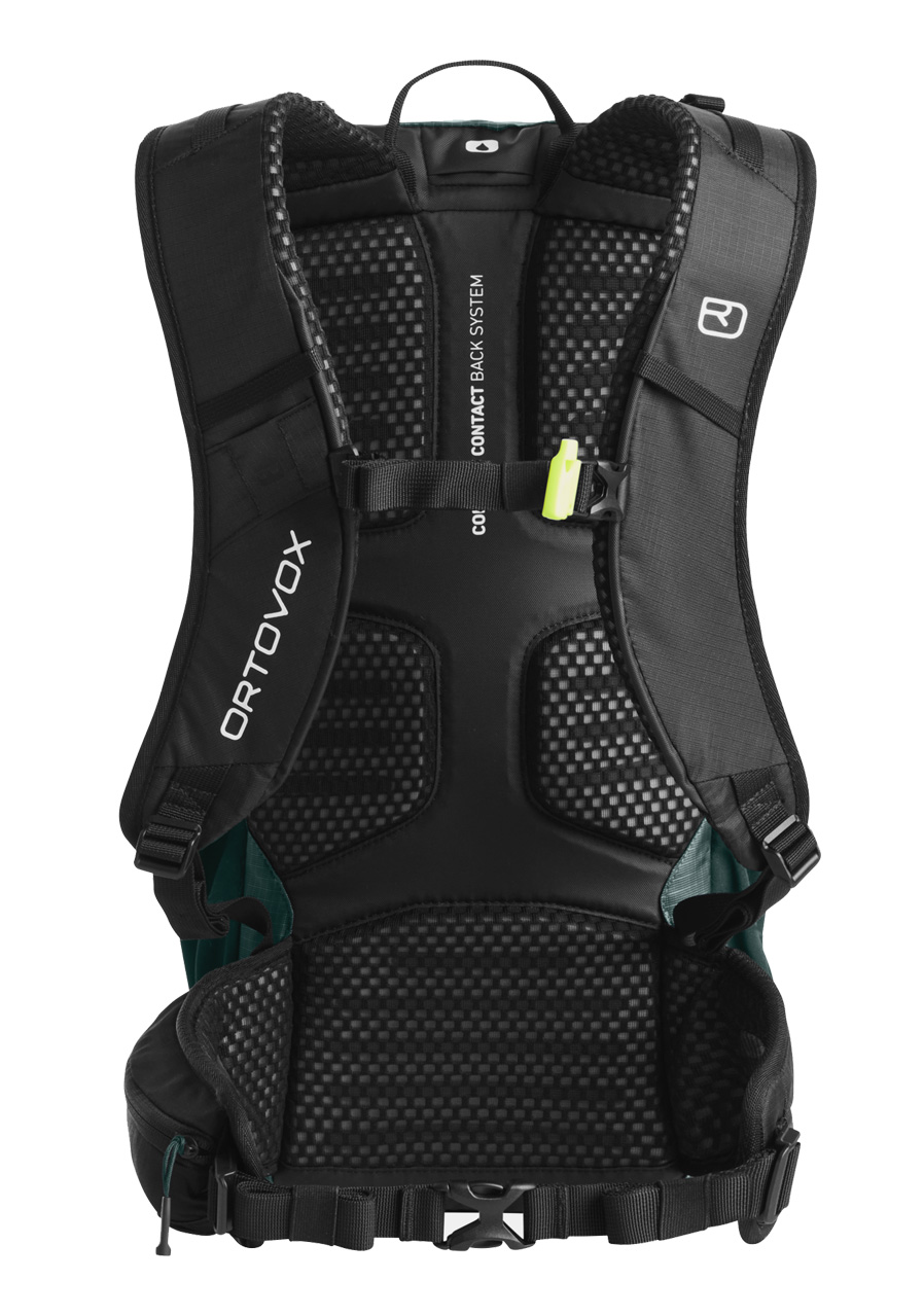 Plecak wyposażony jest w komfortowy system nośny Comfort Contact Back System z piankowymi poduszkami, które wspierają cyrkulację powietrza i równomiernie rozkładają ciężar. Ergonomiczne szelki, regulowany pas biodrowy i pasek piersiowy z gwizdkiem alarmowym zapewniają stabilne i wygodne noszenie