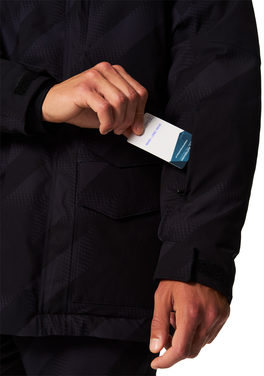 Kieszenie : dwie przednie kieszenie zapinane na zamek, zewnętrzna kieszeń na karnet narciarski, wewnętrzna kieszeń na piersi, wewnętrzna kieszeń na gogle z materiałem