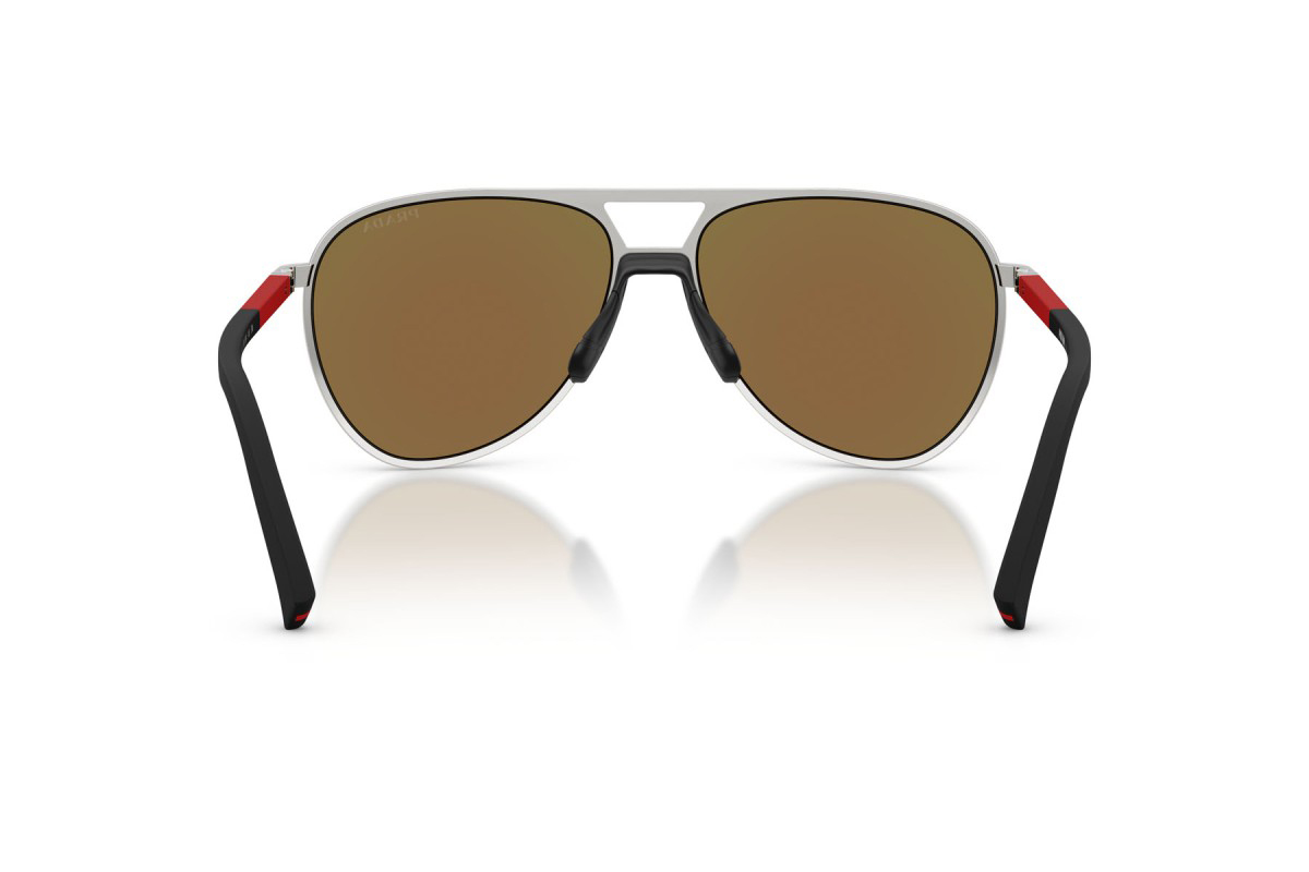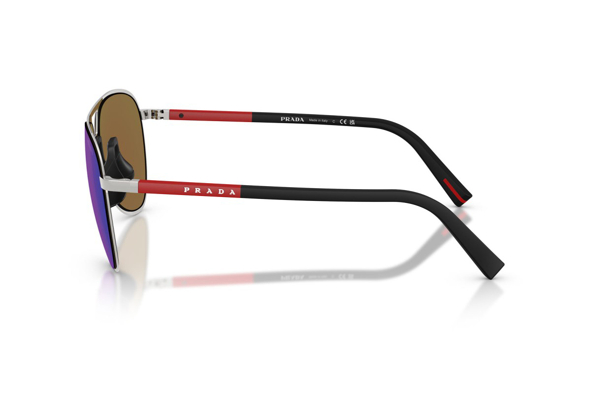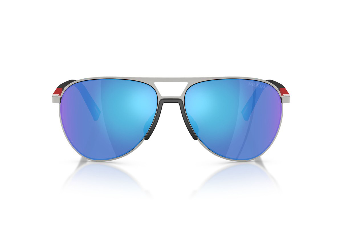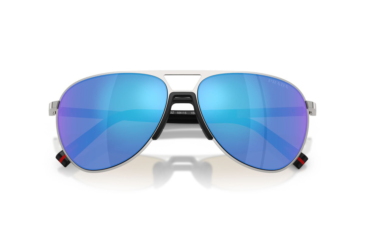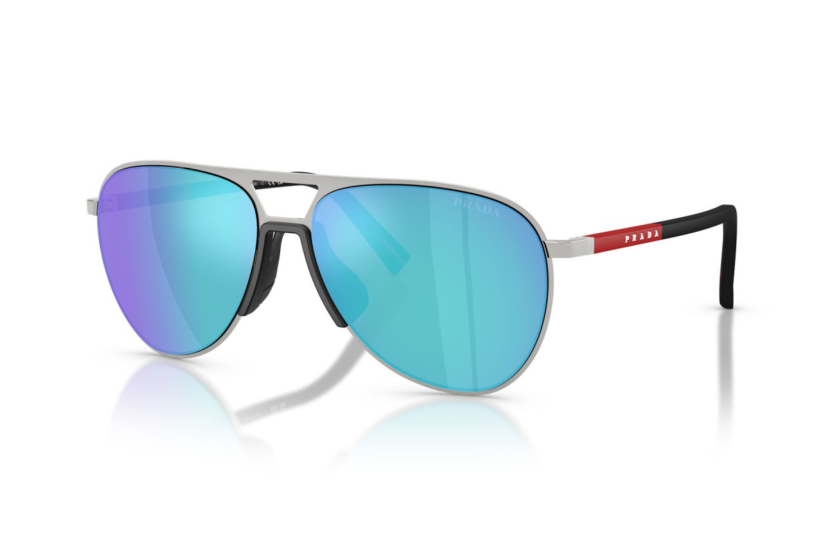 Okulary przeciwsłoneczne Prada PS 53ZS w kolorze 1BC08R59 łączą błyszczącą srebrną oprawkę z lustrzaną powłoką soczewek w kolorze jasnozielono-niebieskim. Design tego modelu jest wyrazisty i nowoczesny – idealny dla osób poszukujących stylowego dodatku o wysokim poziomie luksusu i wydajności. Soczewki zapewniają solidną ochronę przeciwsłoneczną, jednocześnie dodając stylizacji odrobinę stylu.