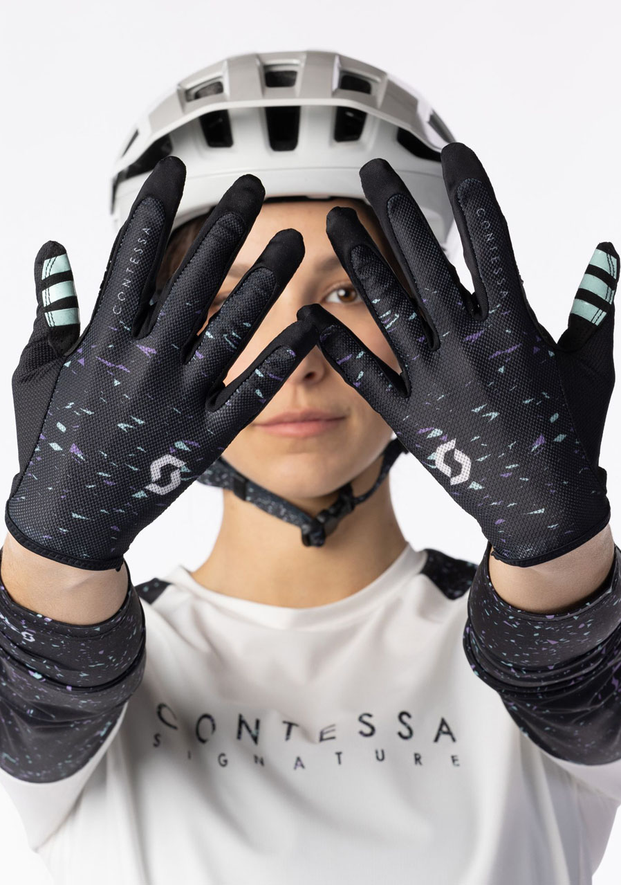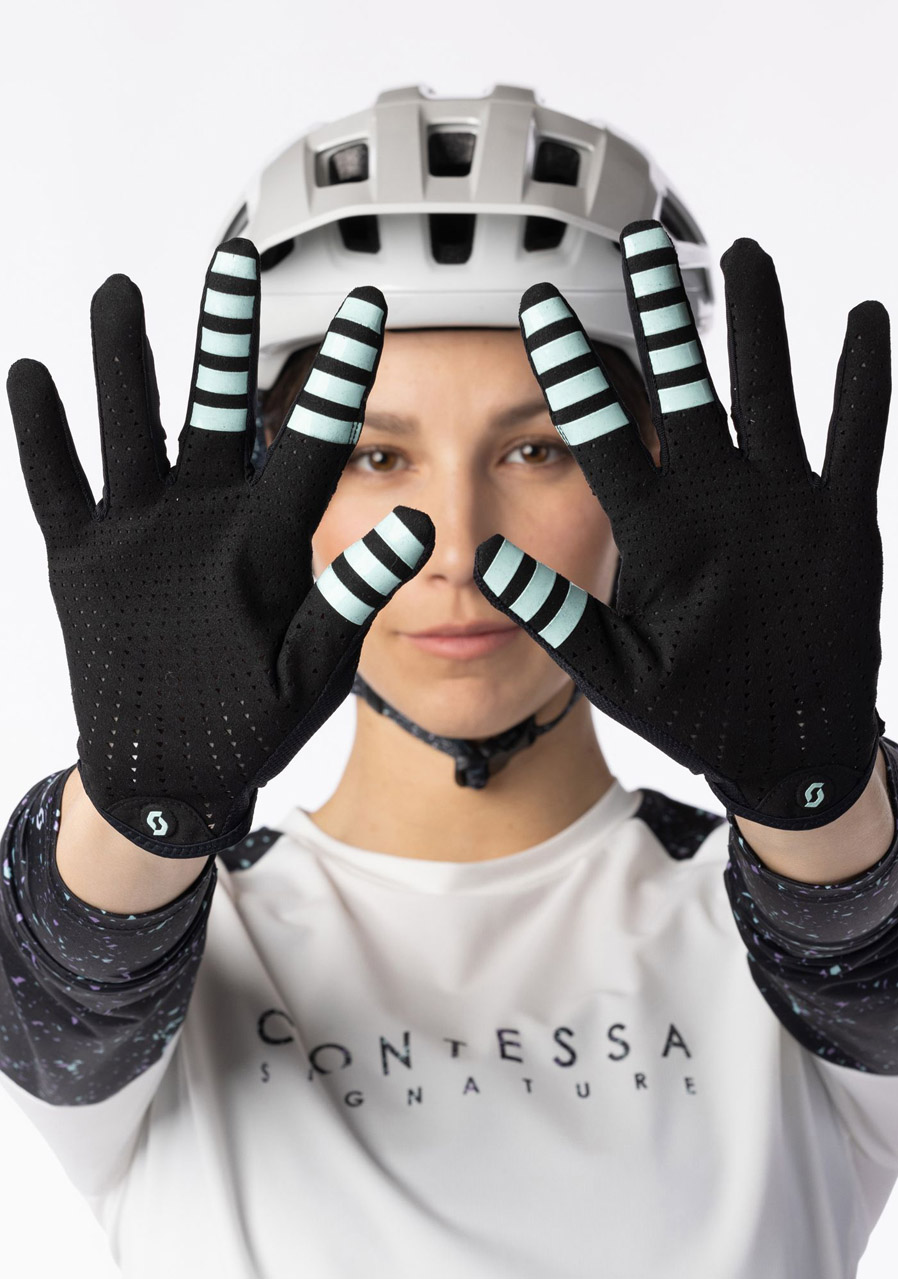 Silna, kobieca i szybka – kolekcja Contessa Signature powstała dla kobiet, które cenią sobie zarówno funkcjonalność, jak i styl swojego roweru oraz wyposażenia. Rękawiczki SCOTT Traction Contessa z długimi palcami wykonane są z oddychającej elastycznej siateczki na wierzchu i perforowanej dłoni, dzięki czemu zapewniają chłodzenie nawet podczas intensywnej jazdy. Specjalna konstrukcja palców z ograniczoną ilością szwów i silikonowym nadrukiem gwarantuje pewny chwyt i precyzję. Wierzch: 68% poliester, 20% poliamid, 12% elastan Dłoń: 65% poliamid, 35% poliuretan Cechy: specjalna konstrukcja palców z mniejszą liczbą szwów, oddychająca siateczka na wierzchu, perforowana dłoń, ekskluzywne oznaczenie Contessa Signature, ukryty magnes w mankiecie do łączenia rękawiczek