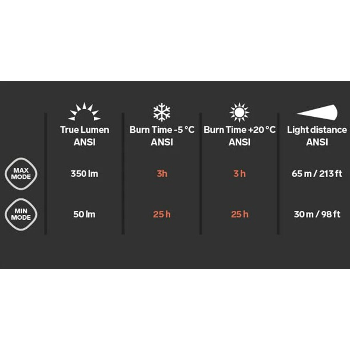 Parametry: Moc światła : 350 lm Zasięg : ok. 65 m Tryby oświetlenia : wysoka moc / niska moc Czas pracy baterii : do ok. 25 godz. (w trybie niskim) Zasilanie : System hybrydowy – akumulator litowo-jonowy 1,25 Ah lub 3× AAA Wodoodporność: IPX5 (wytrzymuje ulewny deszcz) Waga : ok. 76 g łącznie z baterią Czerwone światło do widzenia w nocy Wskaźnik stanu baterii Funkcja „blokady” zapobiegająca przypadkowemu włączeniu Elastyczny i wygodny pasek