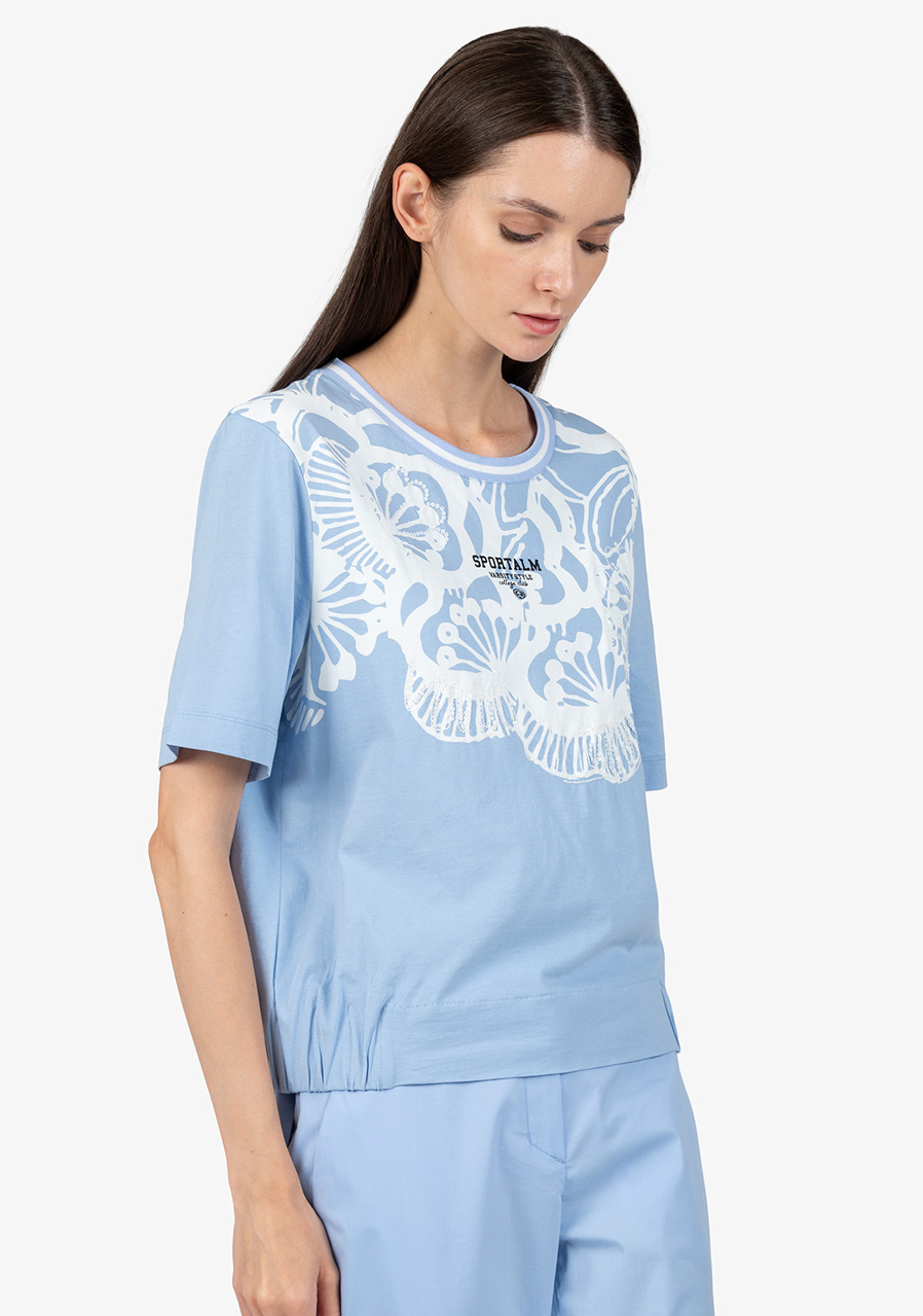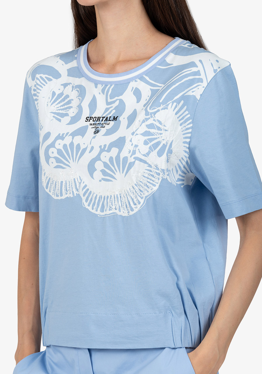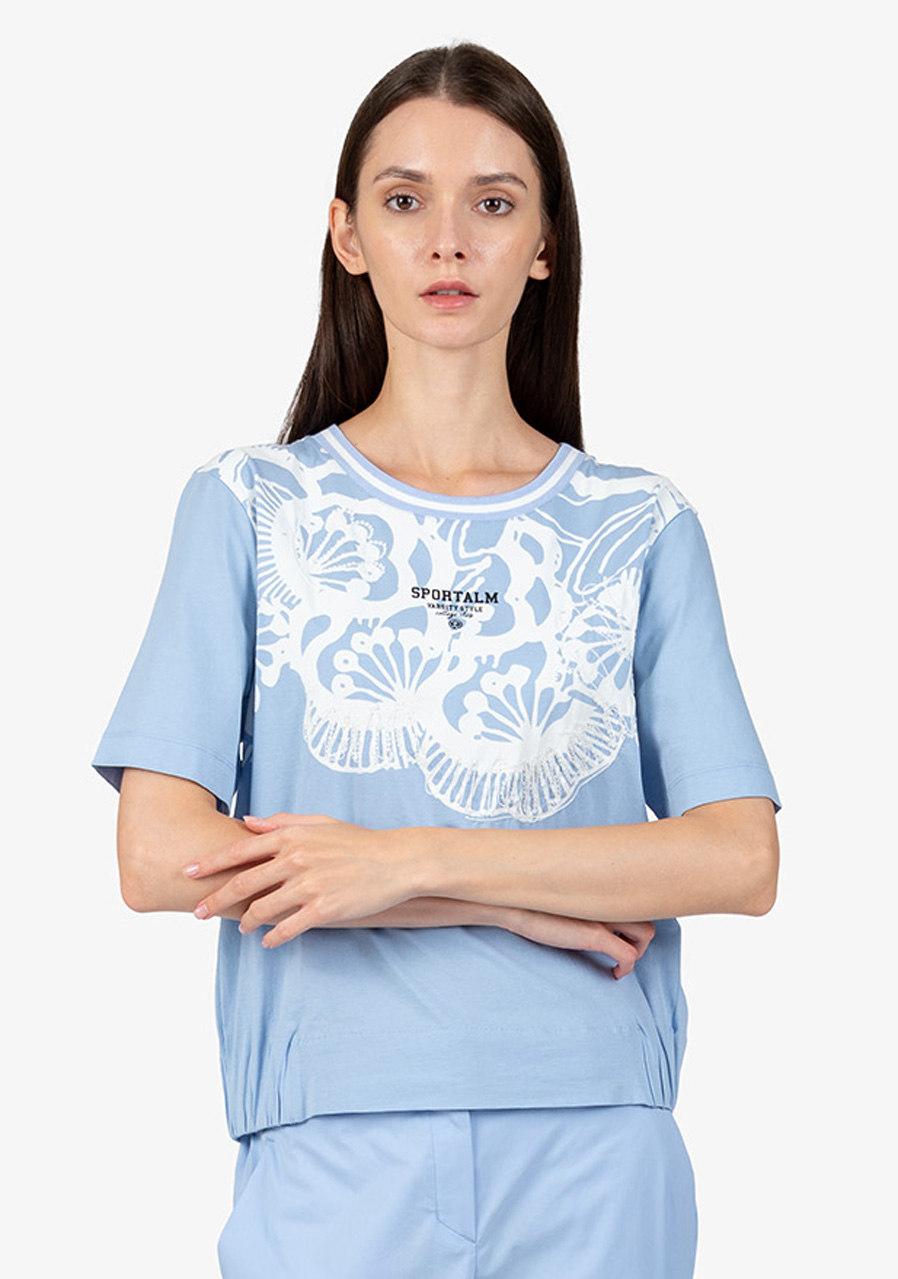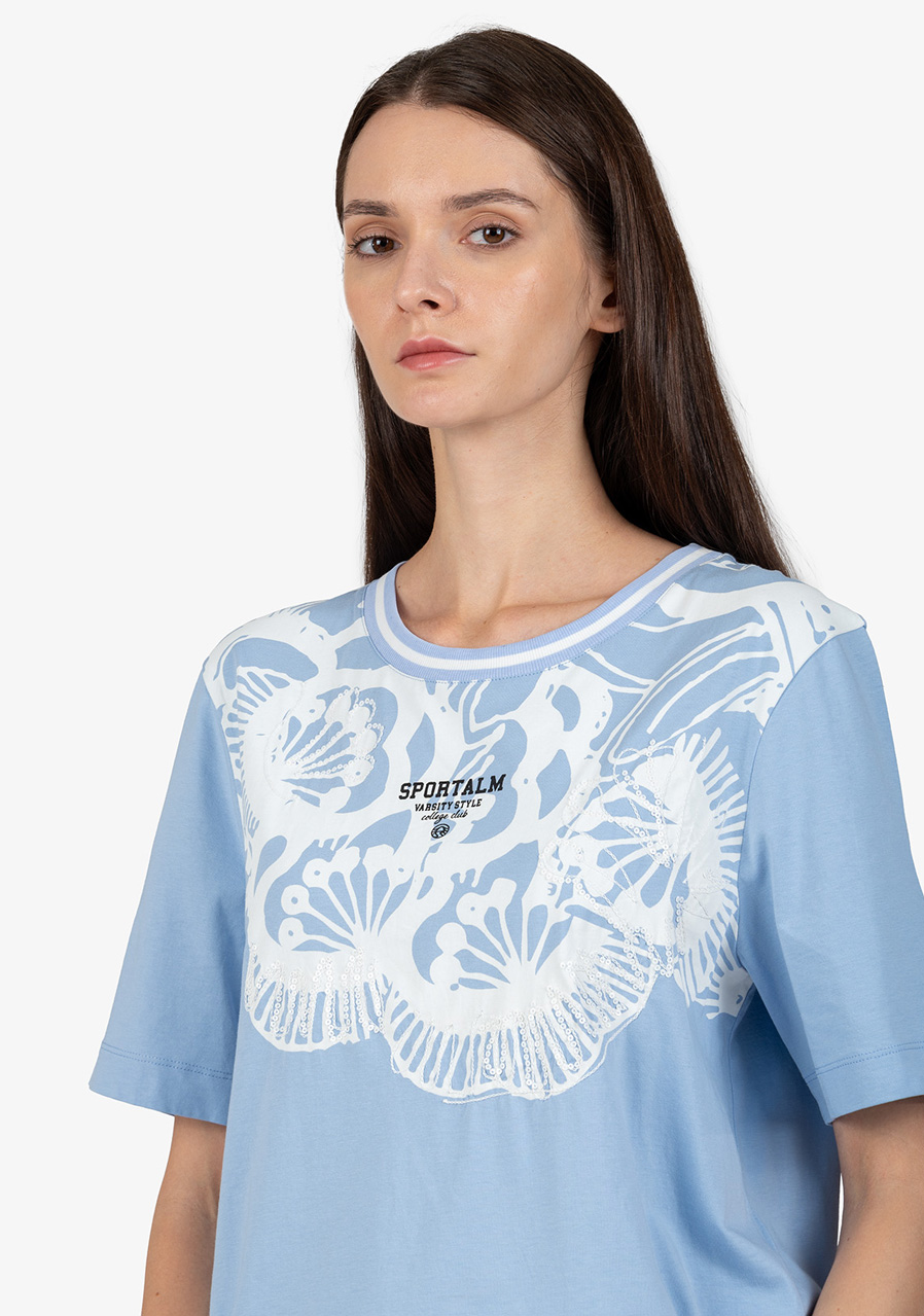 Dámské tričko Sportalm 250198 v odstínu Blue Marguerite přináší do vašeho šatníku kombinaci elegance a ležérního stylu. Tento kousek s krátkým rukávem zaujme nádherným květinovým potiskem, který je doplněn ozdobnými flitrovými výšivkami, jež dodávají tričku jiskřivý a elegantní nádech.
