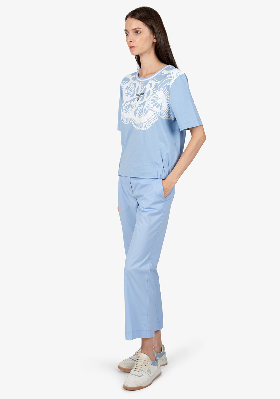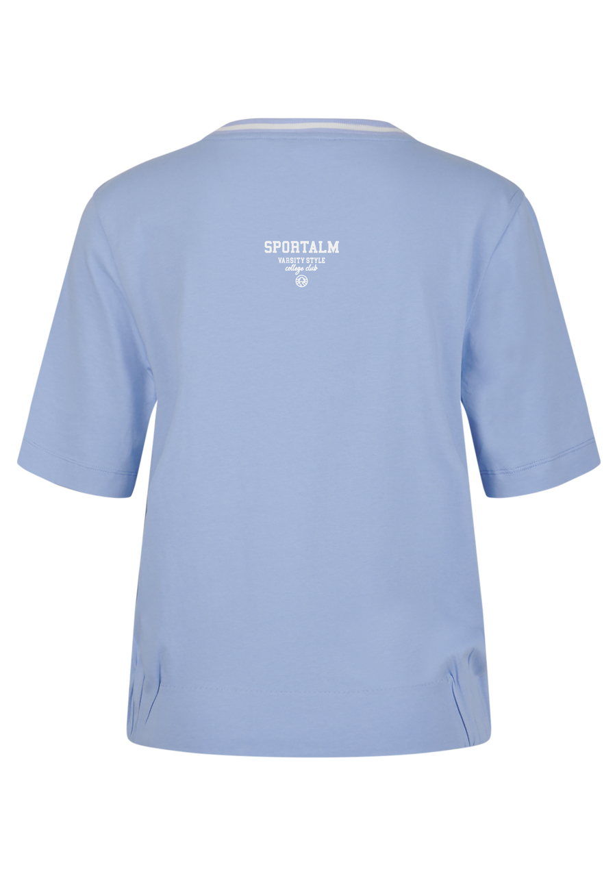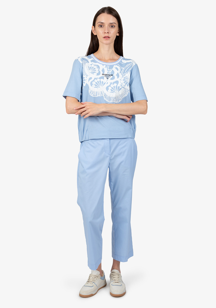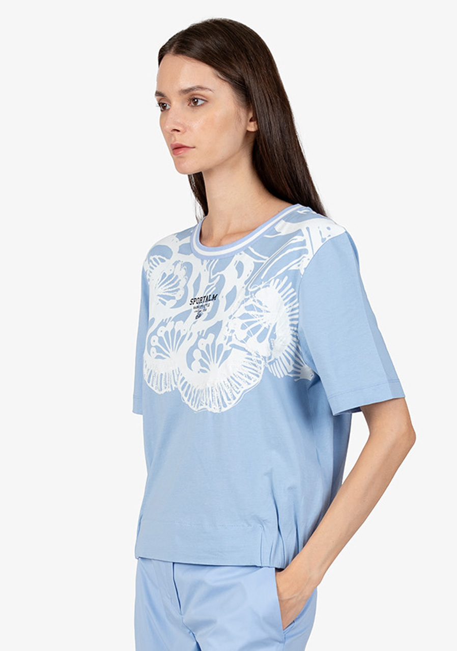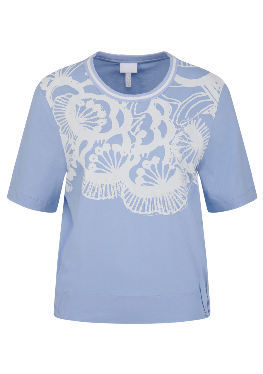 Dámské tričko Sportalm 250198 v odstínu Blue Marguerite přináší do vašeho šatníku kombinaci elegance a ležérního stylu. Tento kousek s krátkým rukávem zaujme nádherným květinovým potiskem, který je doplněn ozdobnými flitrovými výšivkami, jež dodávají tričku jiskřivý a elegantní nádech.