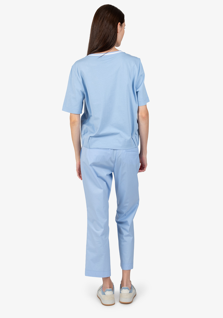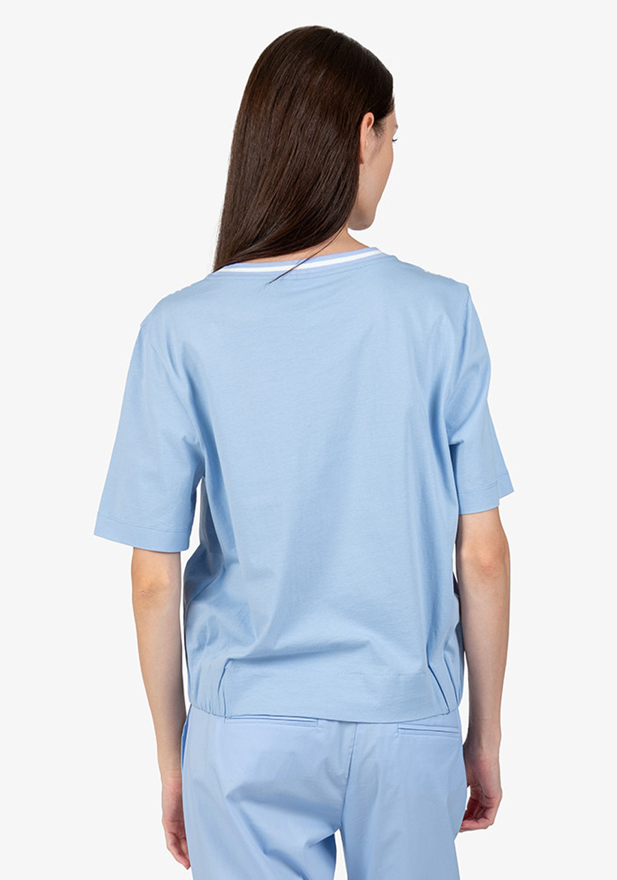 Další parametry: Vyrobeno z kvalitního žerzejového materiálu, tričko je příjemné na dotek a ideální pro pohodlné každodenní nošení. Rovný střih zajišťuje pohodlí a uvolněný vzhled, zatímco kulatý výstřih s žebrovanými manžetami přidává klasický a stylový detail. Krátké rukávy s manžetami a mírně spadlá ramena přinášejí moderní, ležérní dojem. Další předností tohoto trička jsou sofistikované záhyby na bocích lemu, které vznikají díky jemné gumě uvnitř, což dodává zajímavý detail celkovému vzhledu. Toto dámské tričko Sportalm je ideální volbou pro ženy, které hledají pohodlný, ale zároveň elegantní a trendy kousek pro každodenní nošení.
