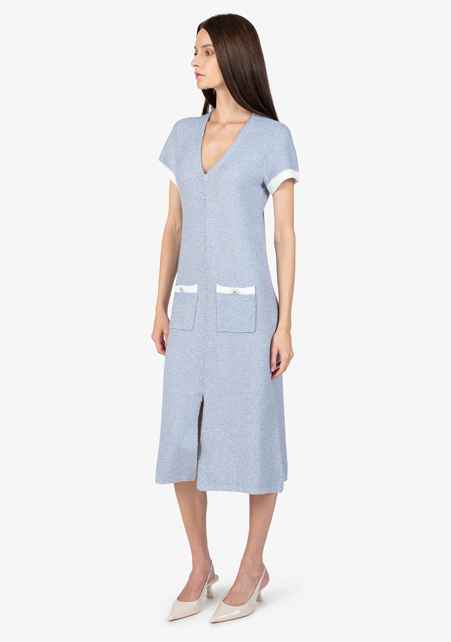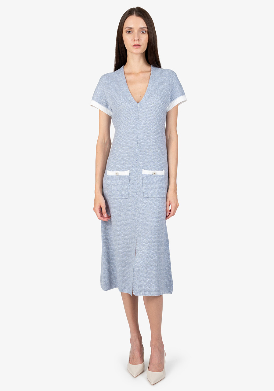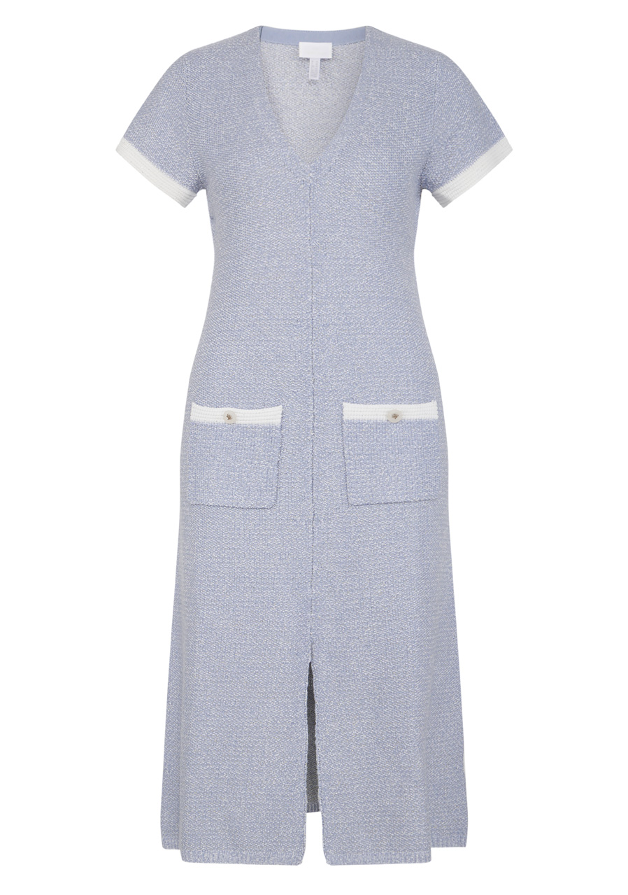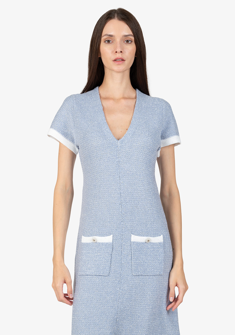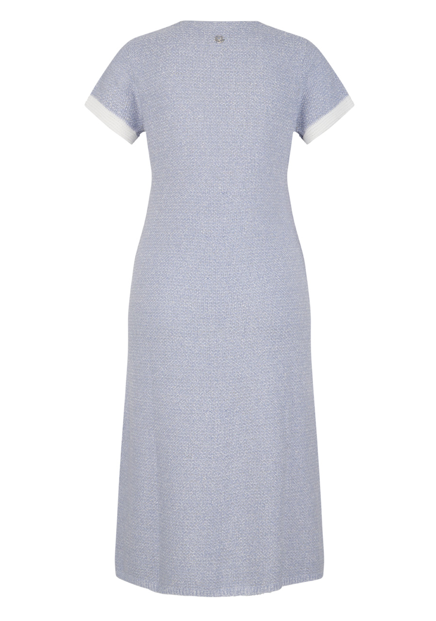 Letní pletené šaty Sportalm Björn 550196 Blue Marguerite představují perfektní kombinaci stylu a pohodlí pro teplé dny. Díky lichotícímu střihu, který se přizpůsobí postavě, a volnějšímu spodnímu lemu, tyto šaty nabízejí ležérní, ale zároveň ženský a moderní vzhled. Šaty mají výrazný sexy rozparek uprostřed přední části a jsou vyrobeny ze směsi různých pletených přízí pro unikátní texturu. Krátké rukávy zakončené flitrovou přízí přidávají na originalitě, zatímco našité kapsy se zapínáním na knoflík dodávají praktický prvek.