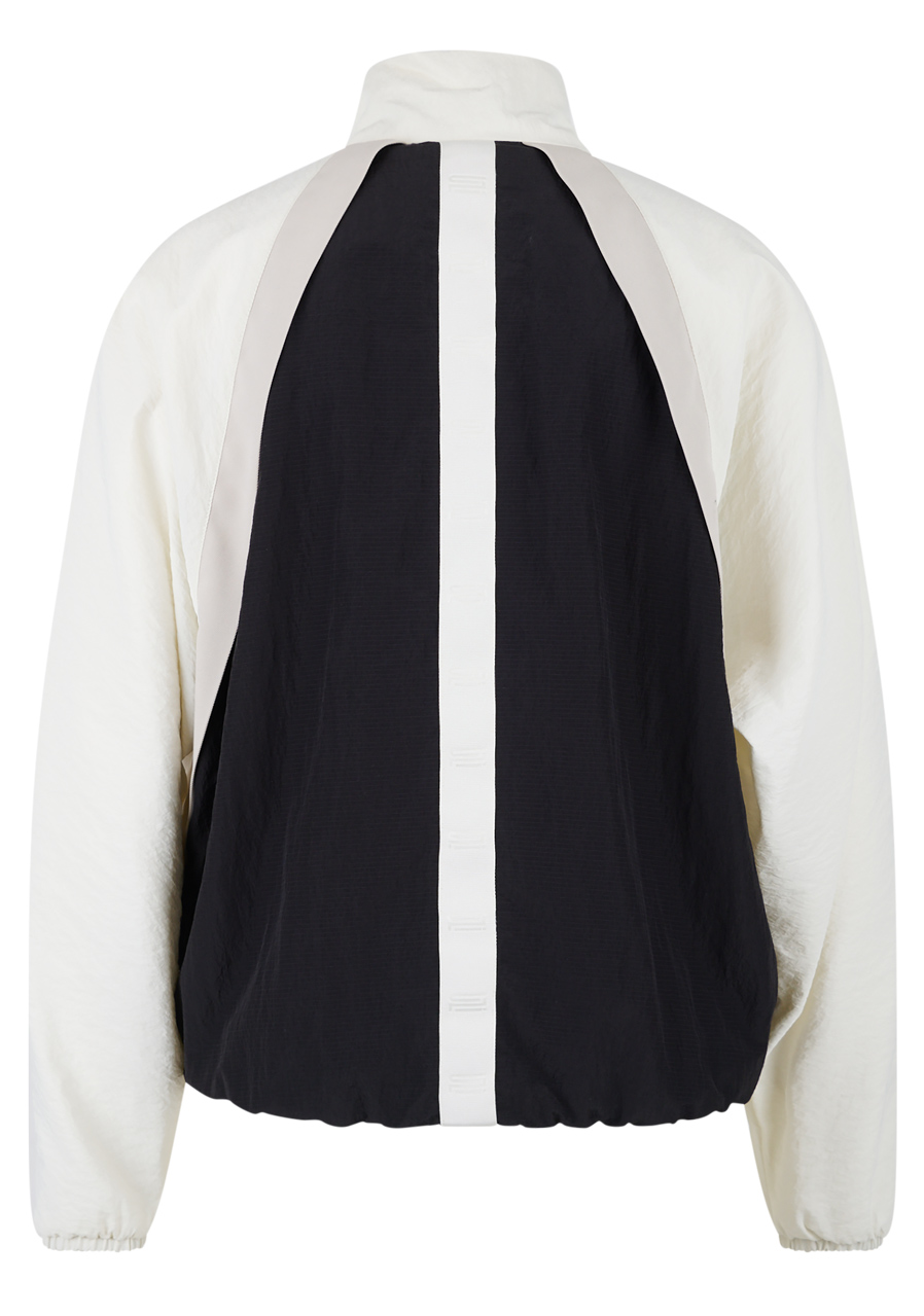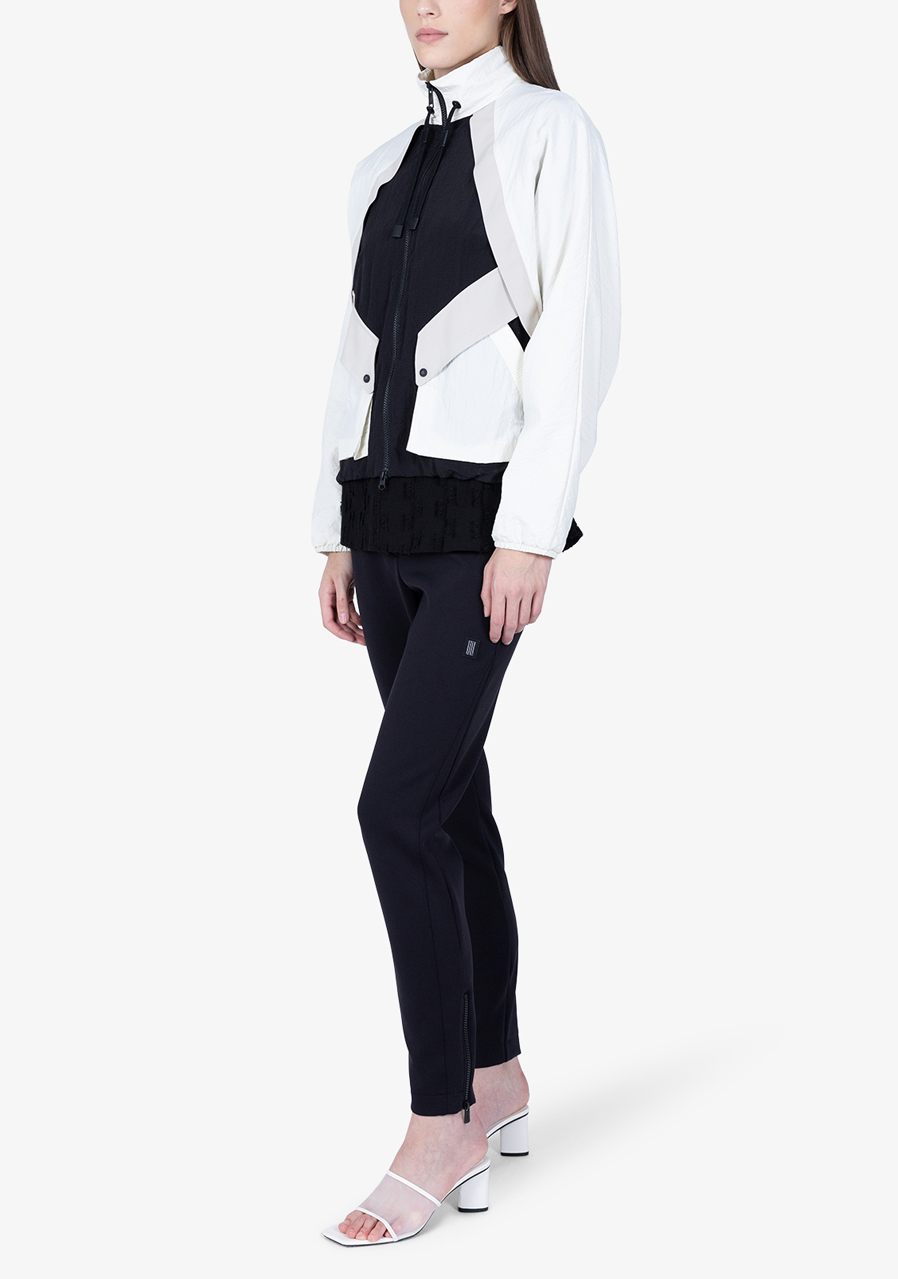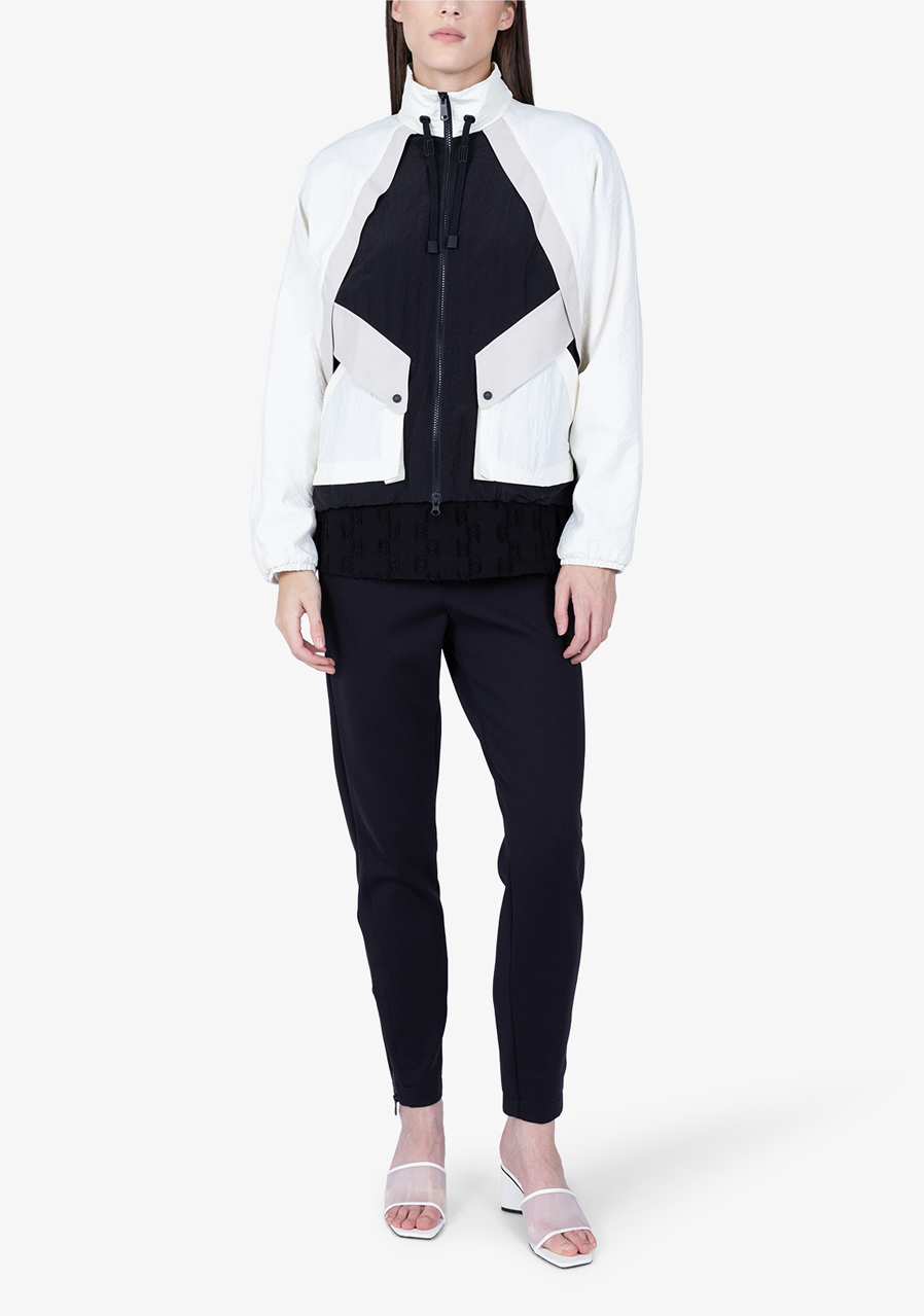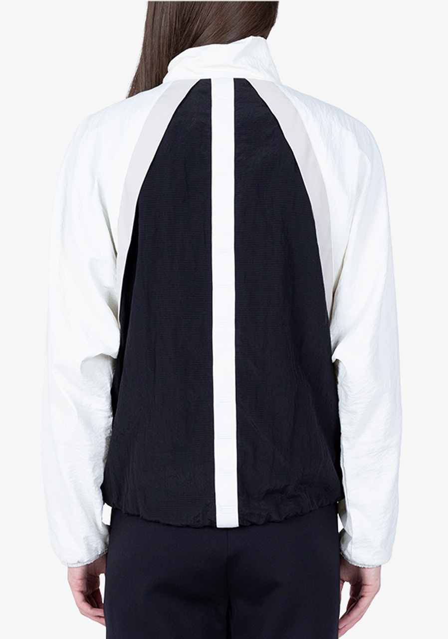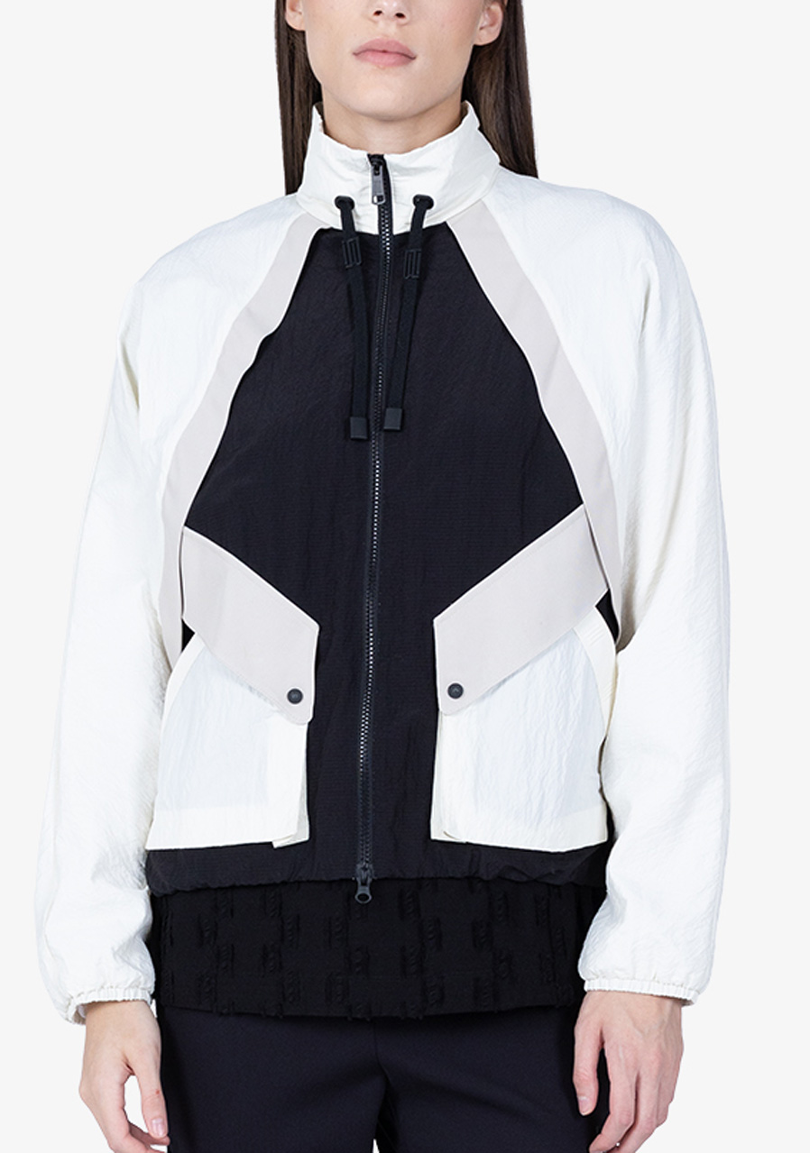Ta charakterystyczna kurtka zachwyca wyrafinowaną sylwetką i nowoczesnym, pewnym siebie stylem. Krótki, kwadratowy krój w modnym, oversize'owym kroju nadaje stylizacji awangardowy charakter. Połączenie wysokiej jakości nylonu i tkaniny twill z wstawką z gniecionego nylonu tworzy ciekawą strukturę i optyczną głębię. Rękawy typu „batwing” z wąskimi, elastycznymi mankietami, stójka ze ściągaczem i metalowymi oczkami oraz charakterystyczne kieszenie z patkami podkreślają geometryczną koncepcję modelu. Charakterystycznym detalem jest taśma z logo pośrodku pleców.