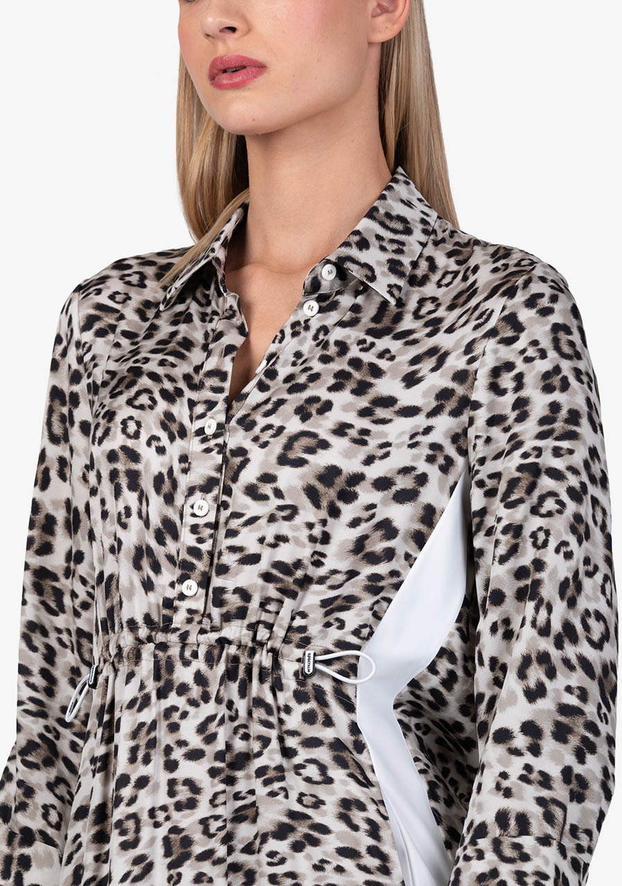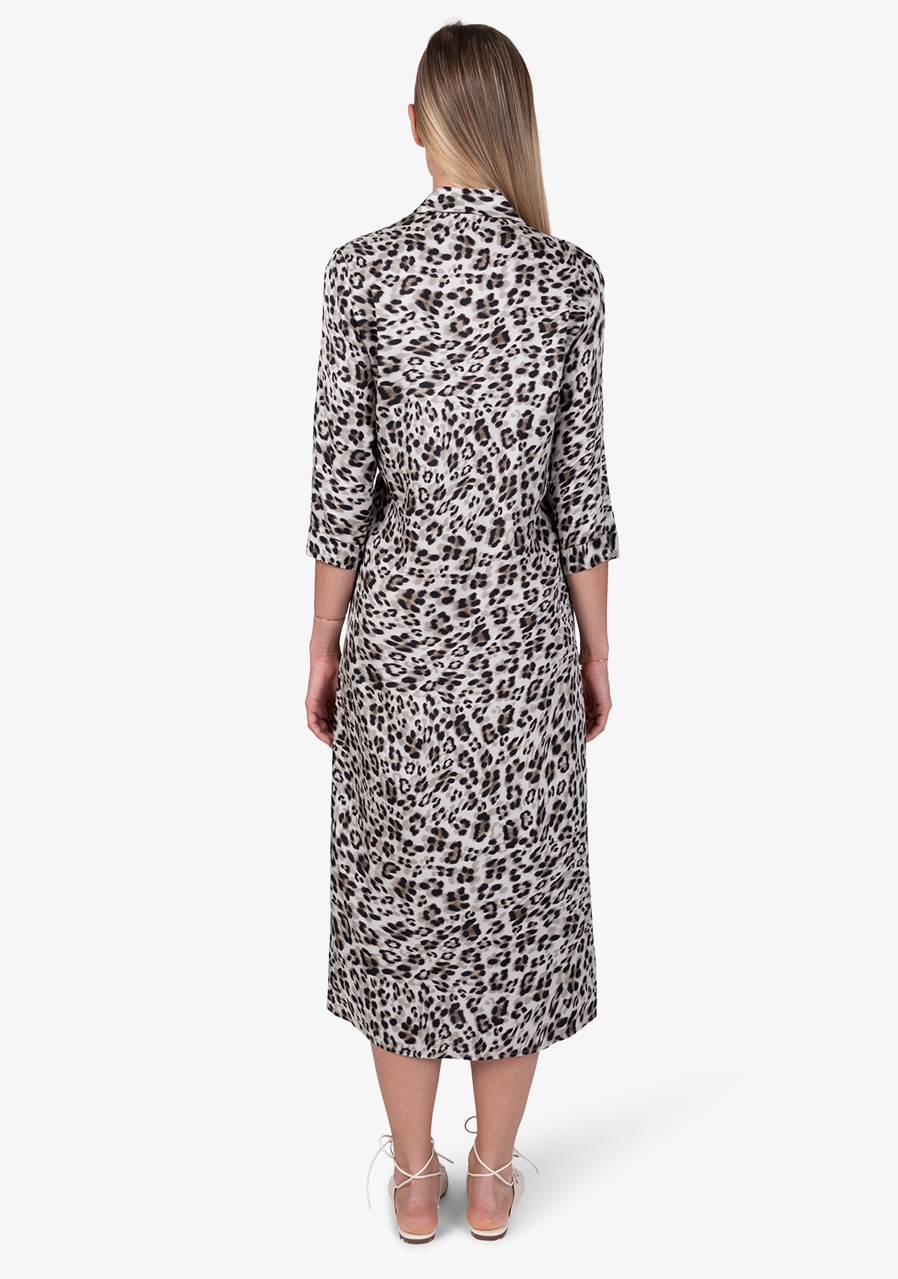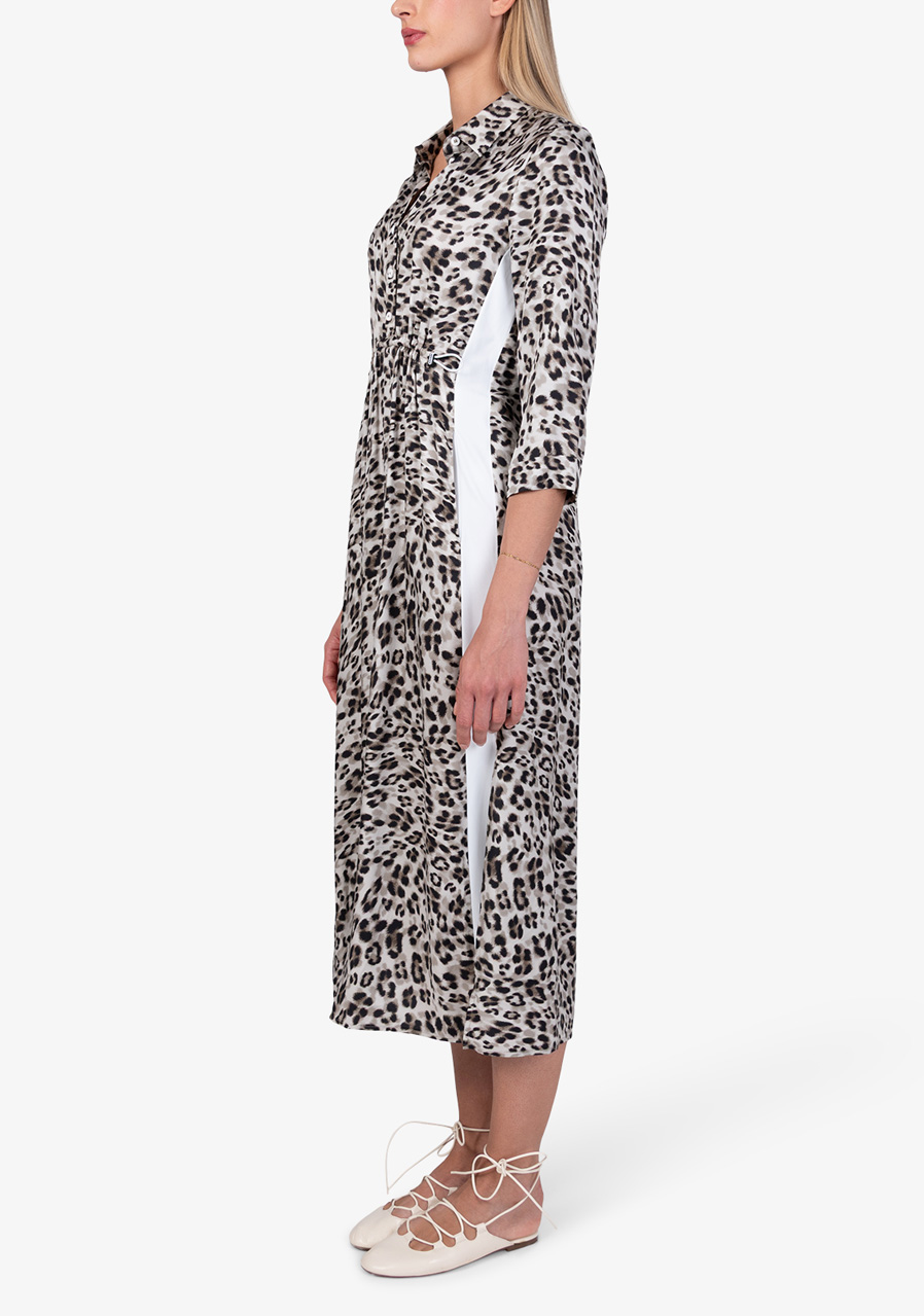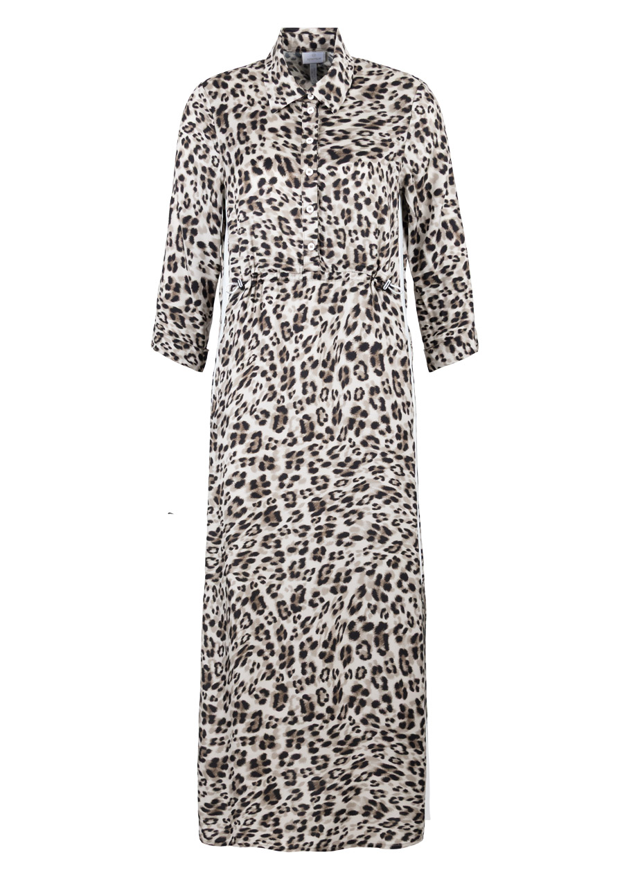 Zwiewna, maxi sukienka koszulowa to idealny wybór na letnie dni, kiedy chcesz połączyć wygodę z odważnym, modnym stylem. Lekka wiskoza ładnie się układa i w połączeniu z elementami jerseyu zapewnia komfort noszenia. Wzór w panterkę nadaje modelowi modnego charakteru, a sznurek w talii pozwala dopasować sylwetkę do indywidualnych potrzeb – kobiecą, elegancką i jednocześnie swobodną. Koszulowy kołnierzyk, rękawy 3/4 z podwinięciem i wysokie rozcięcia po bokach podkreślają nowoczesny i świeży, letni look.
