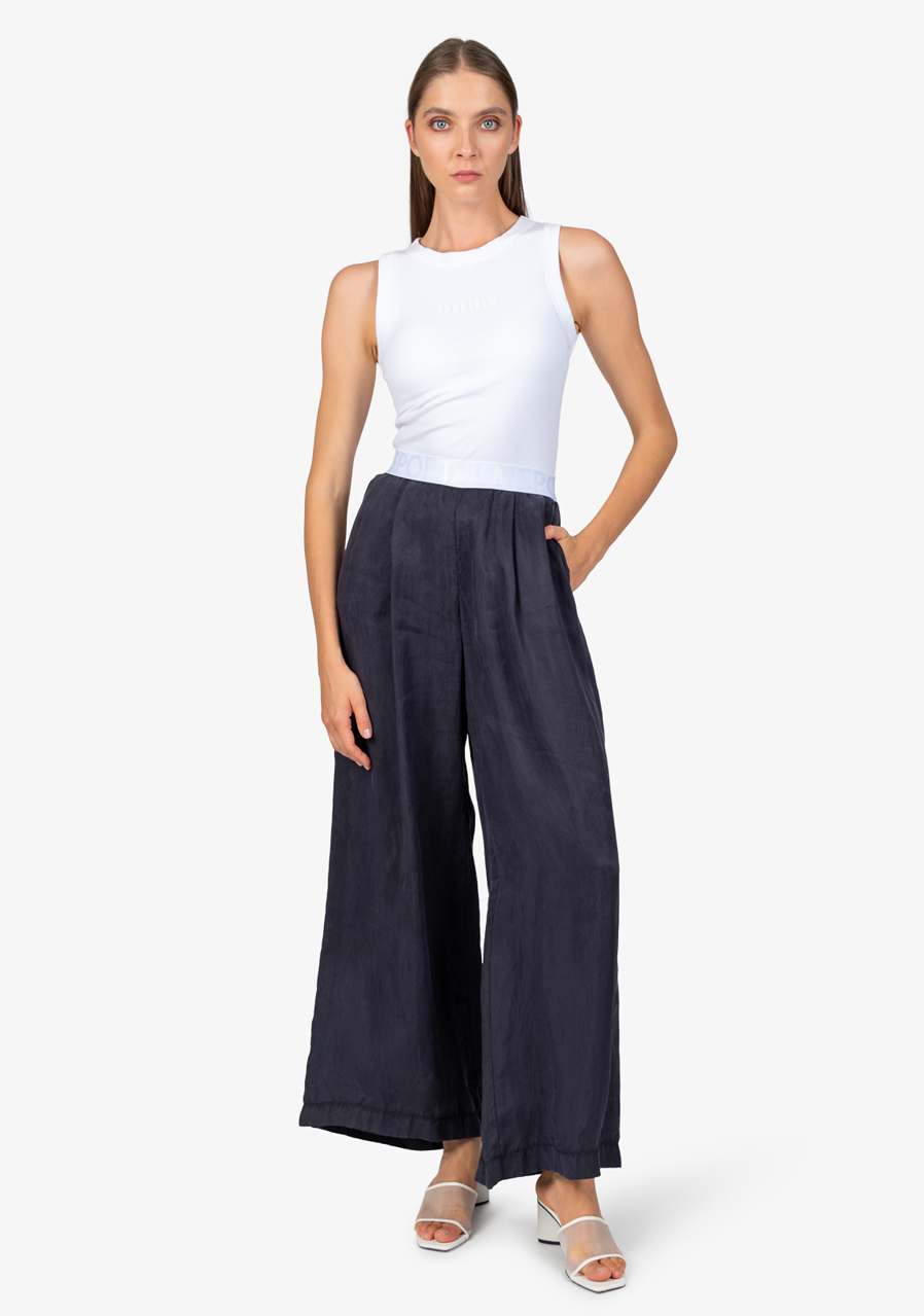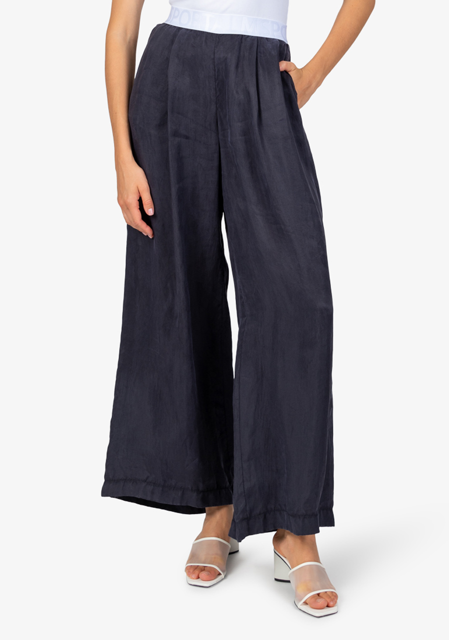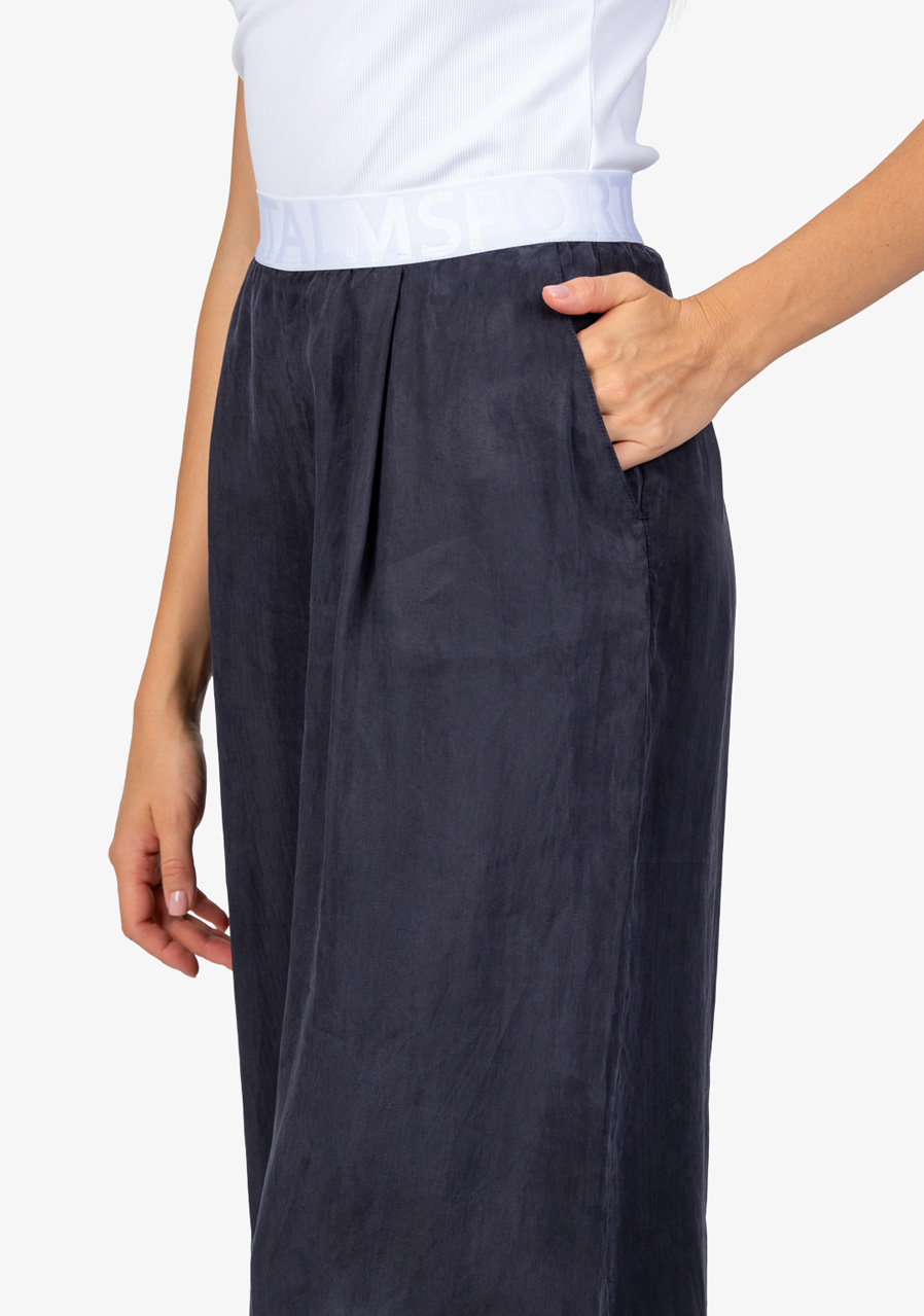Materiál: 100% viskóza Vnitřní šev pro velikost 36: 80,0 cm Další parametry: Volný střih, módní styl, elastický pas s vyraženým logem Sportalm, široký tvar nohavic, boční kapsy, lehký Tencel materiál. Sklady vpředu zajišťují pohodlné nošení.