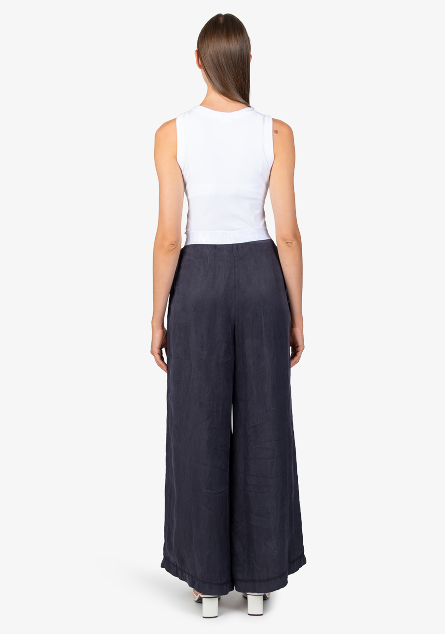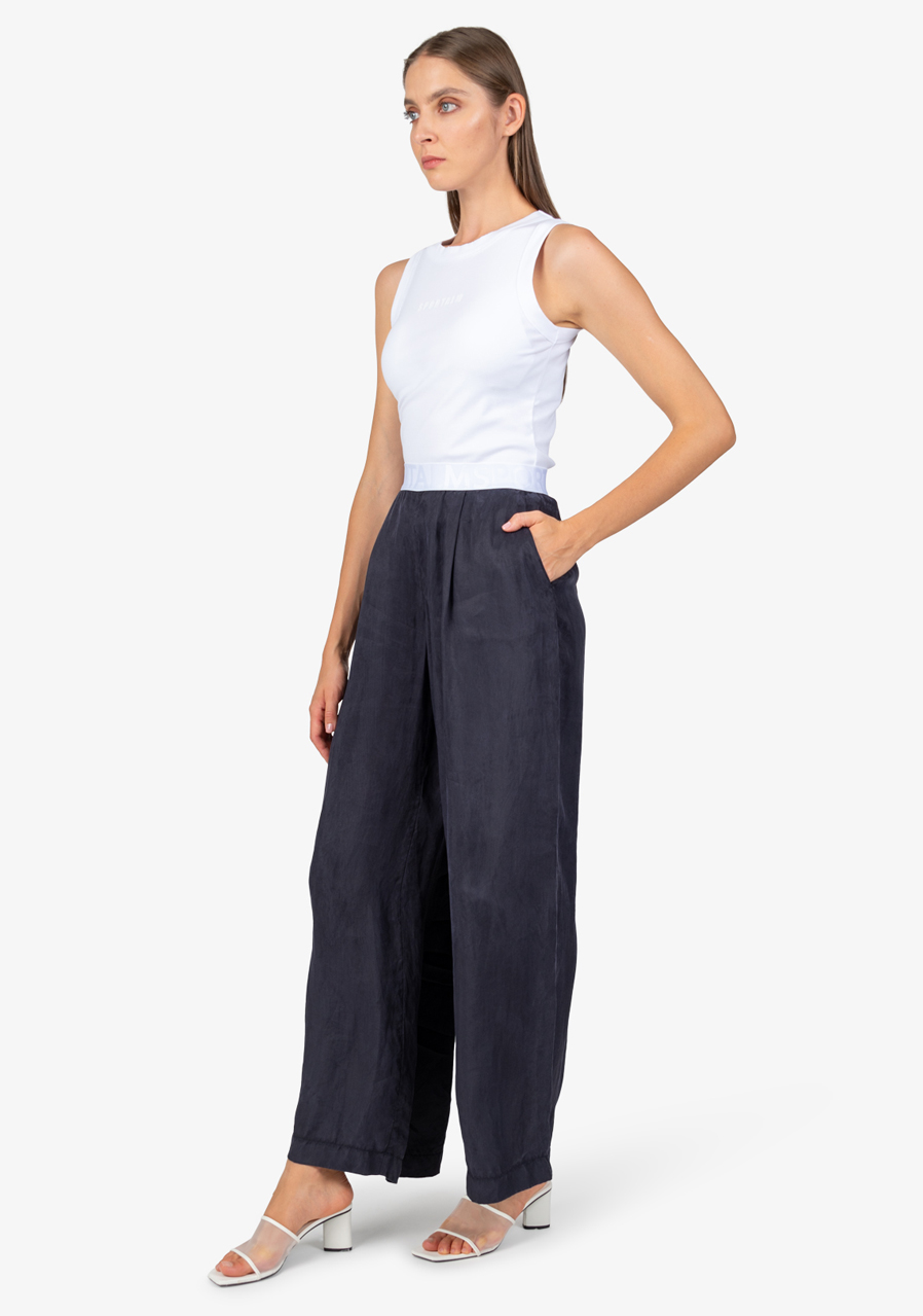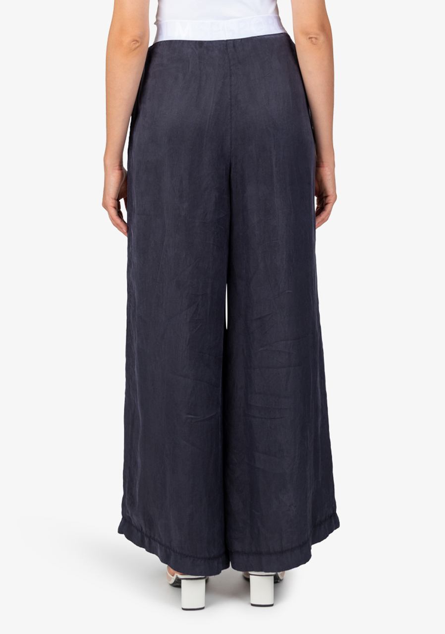 Materiál: 100% viskóza Vnitřní šev pro velikost 36: 80,0 cm Další parametry: Volný střih, módní styl, elastický pas s vyraženým logem Sportalm, široký tvar nohavic, boční kapsy, lehký Tencel materiál. Sklady vpředu zajišťují pohodlné nošení.