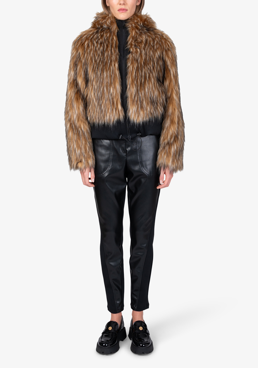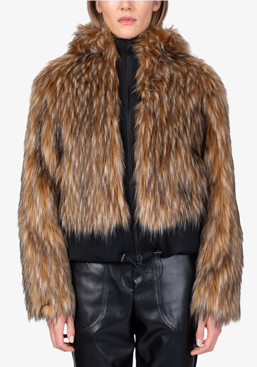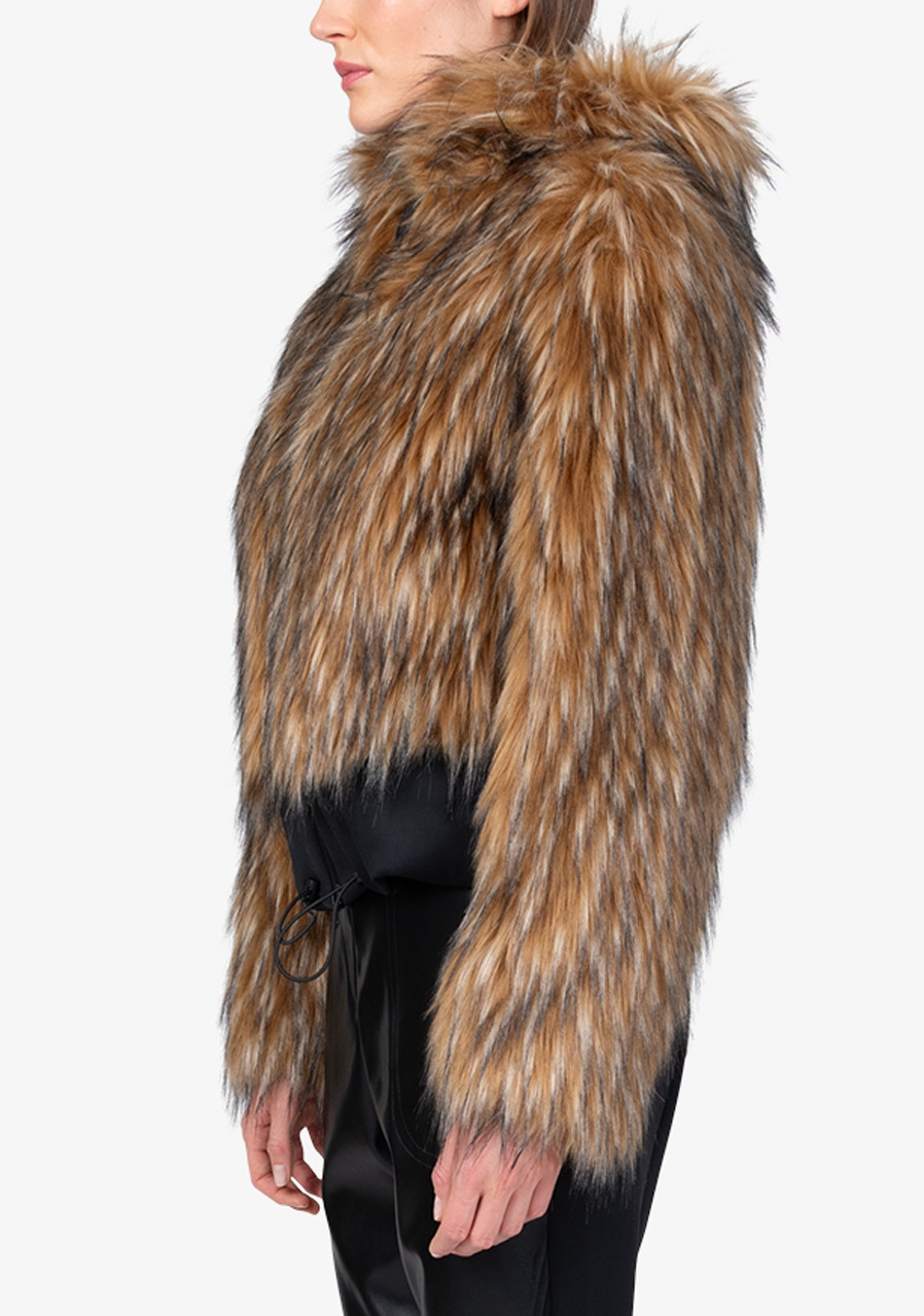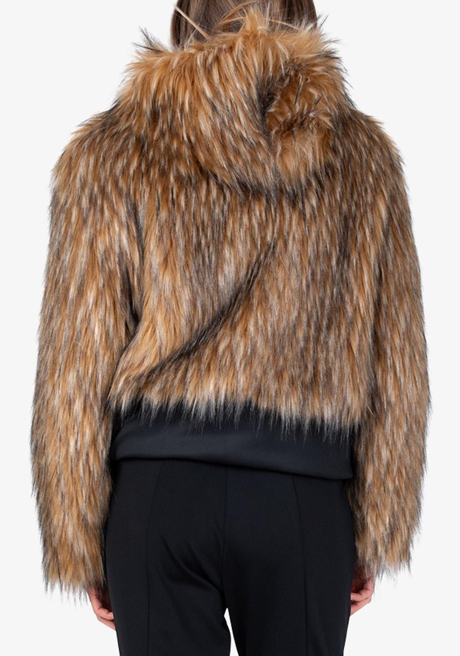 Parametry: Materiał : sztuczne futro o wyglądzie jenota połączone z tkaniną scuba Skład : 85% poliester, 10% poliamid, 5% elastan (typowe dla tego typu połączenia) Podszewka : 100% poliester Krój : regular fit Kaptur : stały Rękawy : długie, z metalowym nitem Sportalm na lewym ramieniu Zapięcie : zamek błyskawiczny dwukierunkowy Kieszenie : kieszenie wpuszczane boczne Szczegóły : szeroki dół typu scuba ze ściągaczem, połączenie materiałów strukturalnych Długość tyłu (rozmiar 36) : 58 cm Styl : elegancki, luksusowy, nowoczesny Sezon : Jesień/Zima 2025