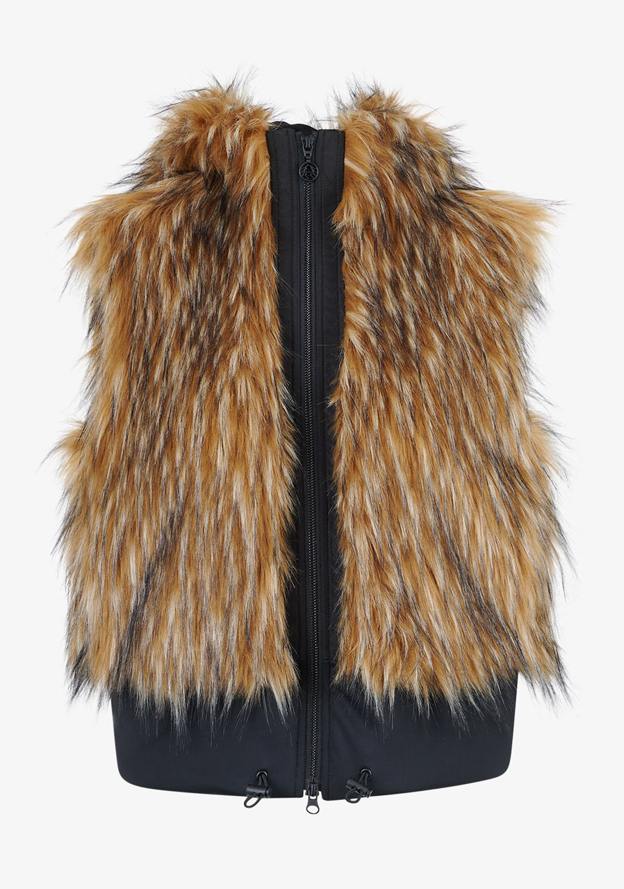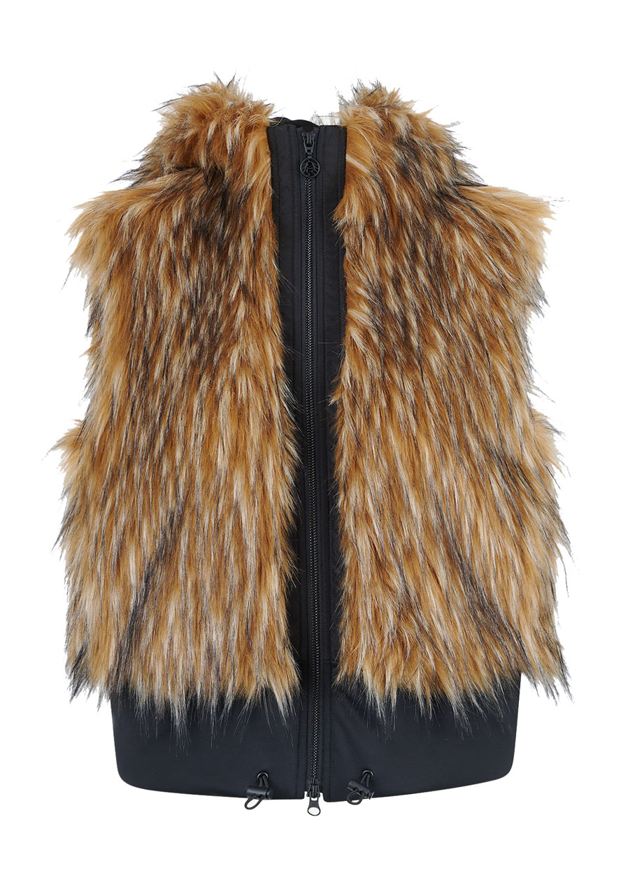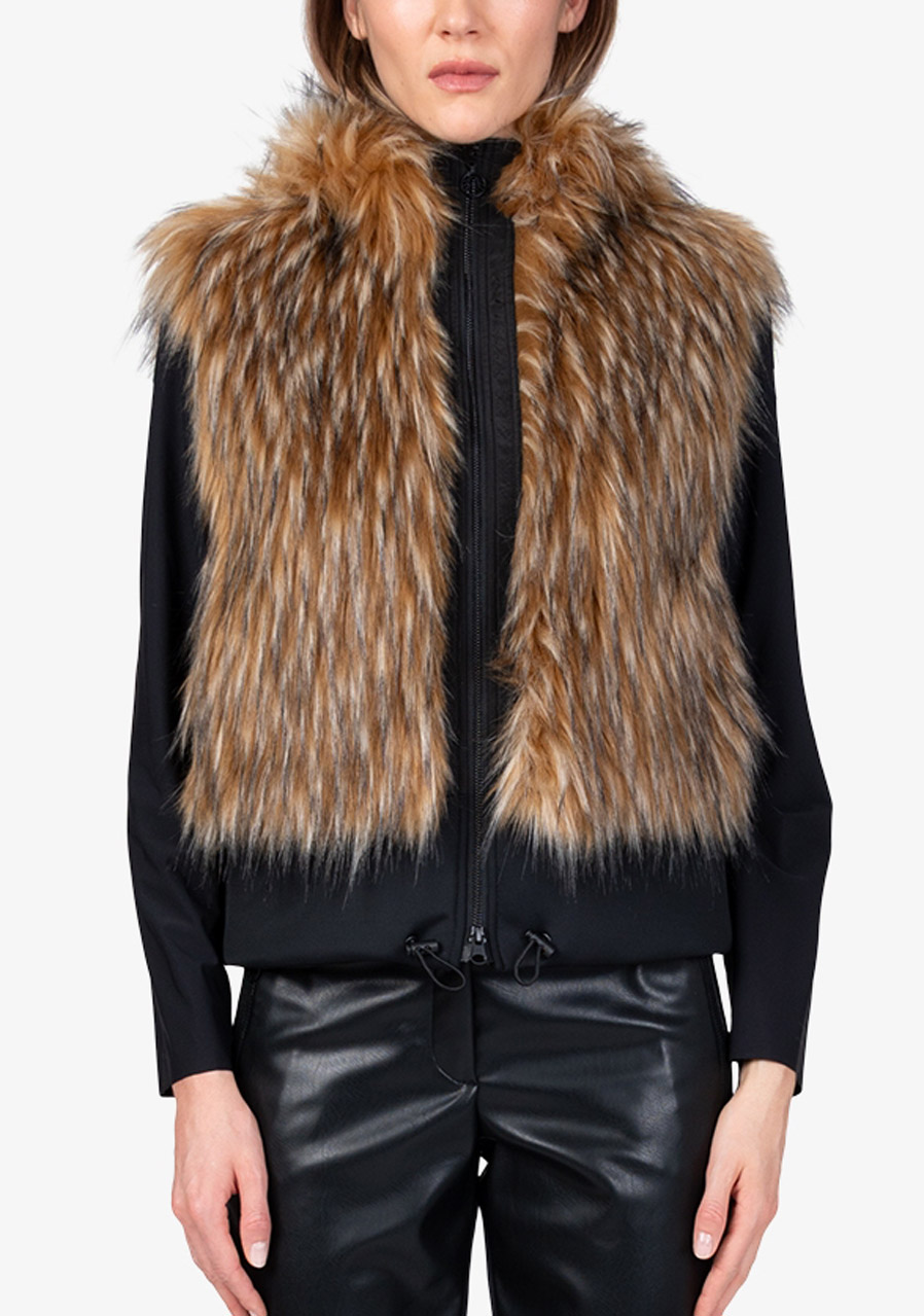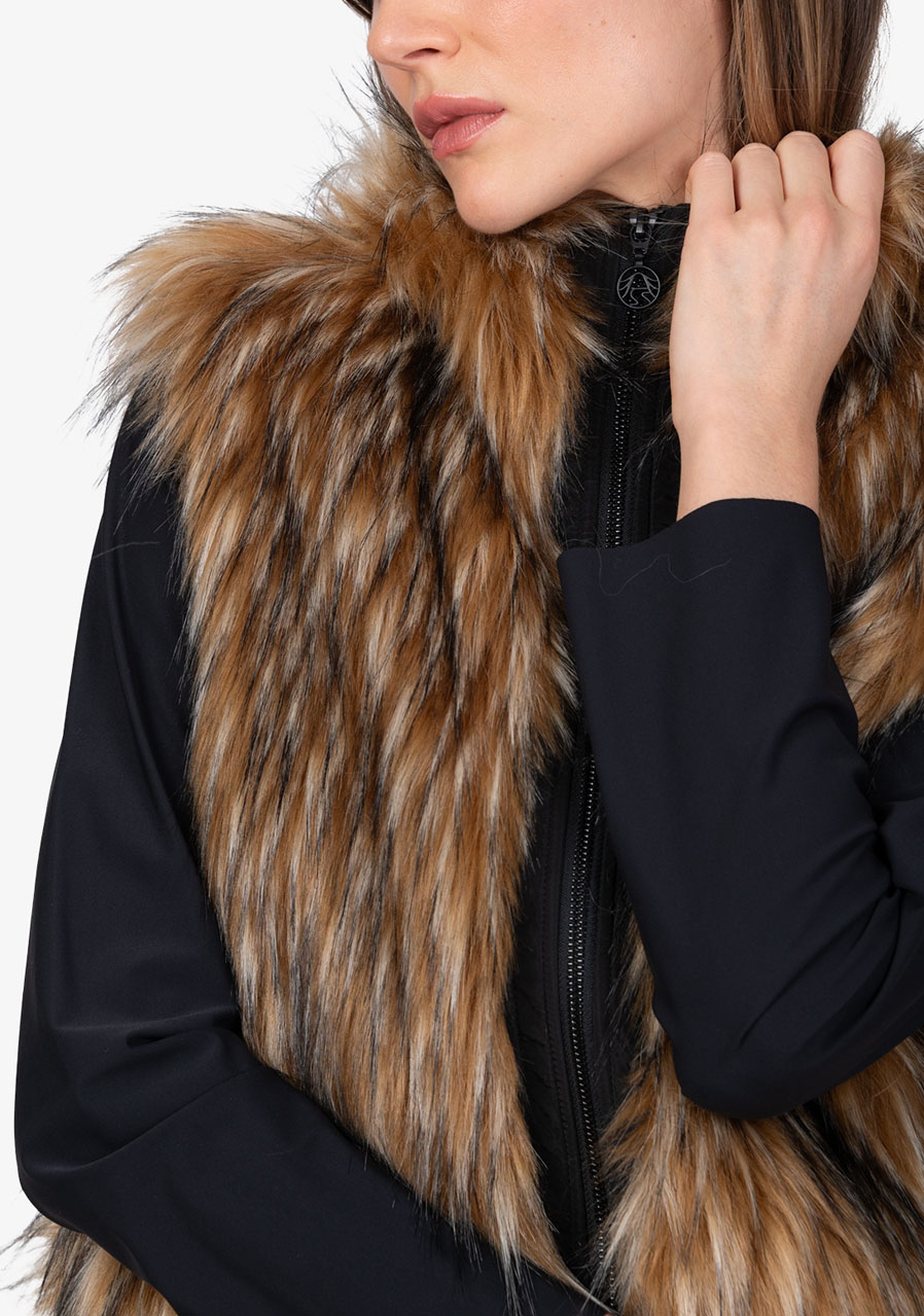 Kamizelka Sportalm ze sztucznego futra z kapturem to luksusowy dodatek, który łączy elegancję, ciepło i nowoczesny design. Wykonana z miękkiego sztucznego futra o fakturze jenota w połączeniu z elastycznym materiałem scuba, prezentuje się ekskluzywnie, a jednocześnie jest wygodna w noszeniu. Kaptur nadaje kamizelce swobodny, stylowy charakter, a dwukierunkowy zamek błyskawiczny i boczne kieszenie zwiększają jej praktyczność. Szeroki dół scuba ze ściągaczem pozwala na regulację szerokości dolnej krawędzi w razie potrzeby. Dzięki pełnej podszewce i precyzyjnemu wykonaniu, kamizelka idealnie nadaje się do noszenia warstwowego i eleganckich zimowych stylizacji.