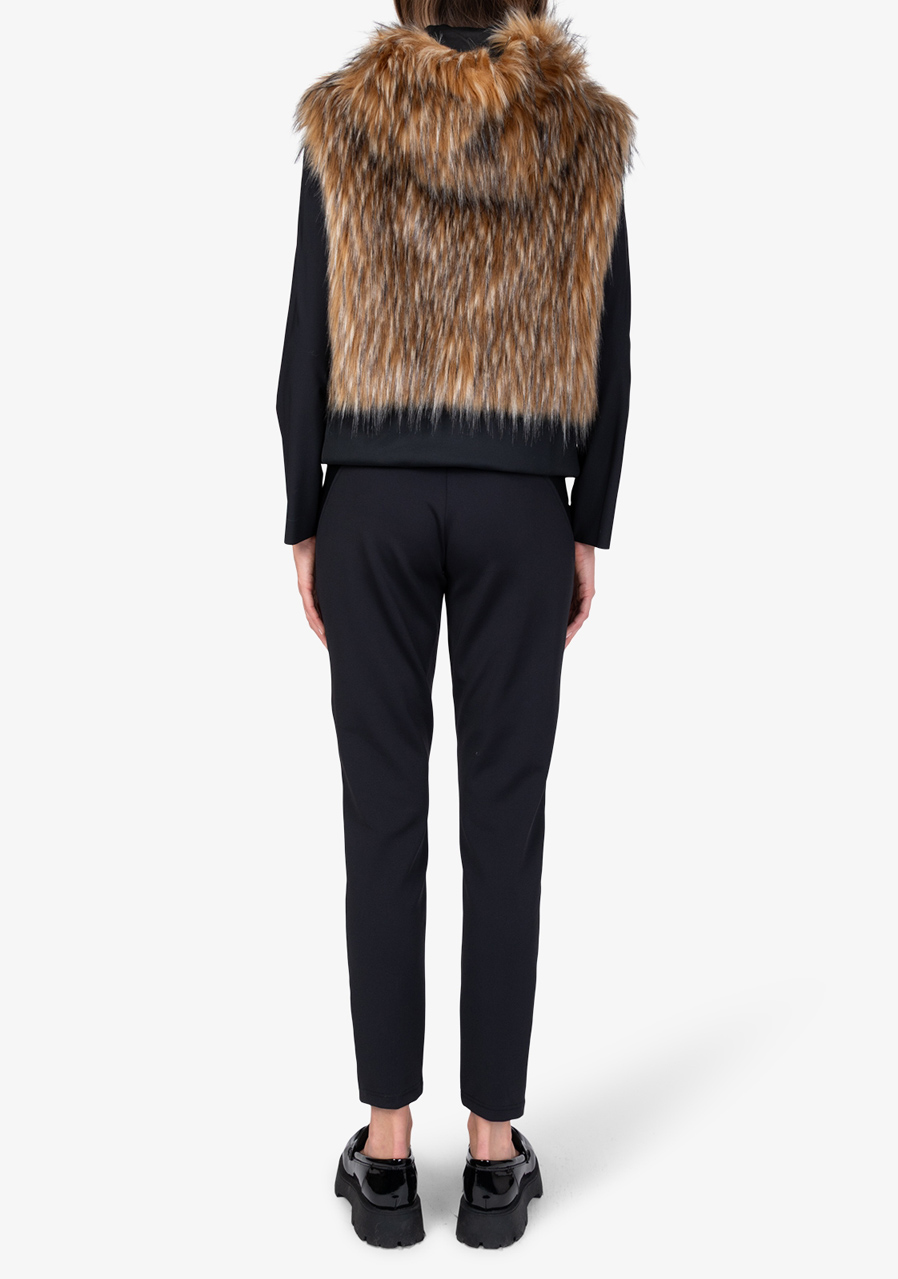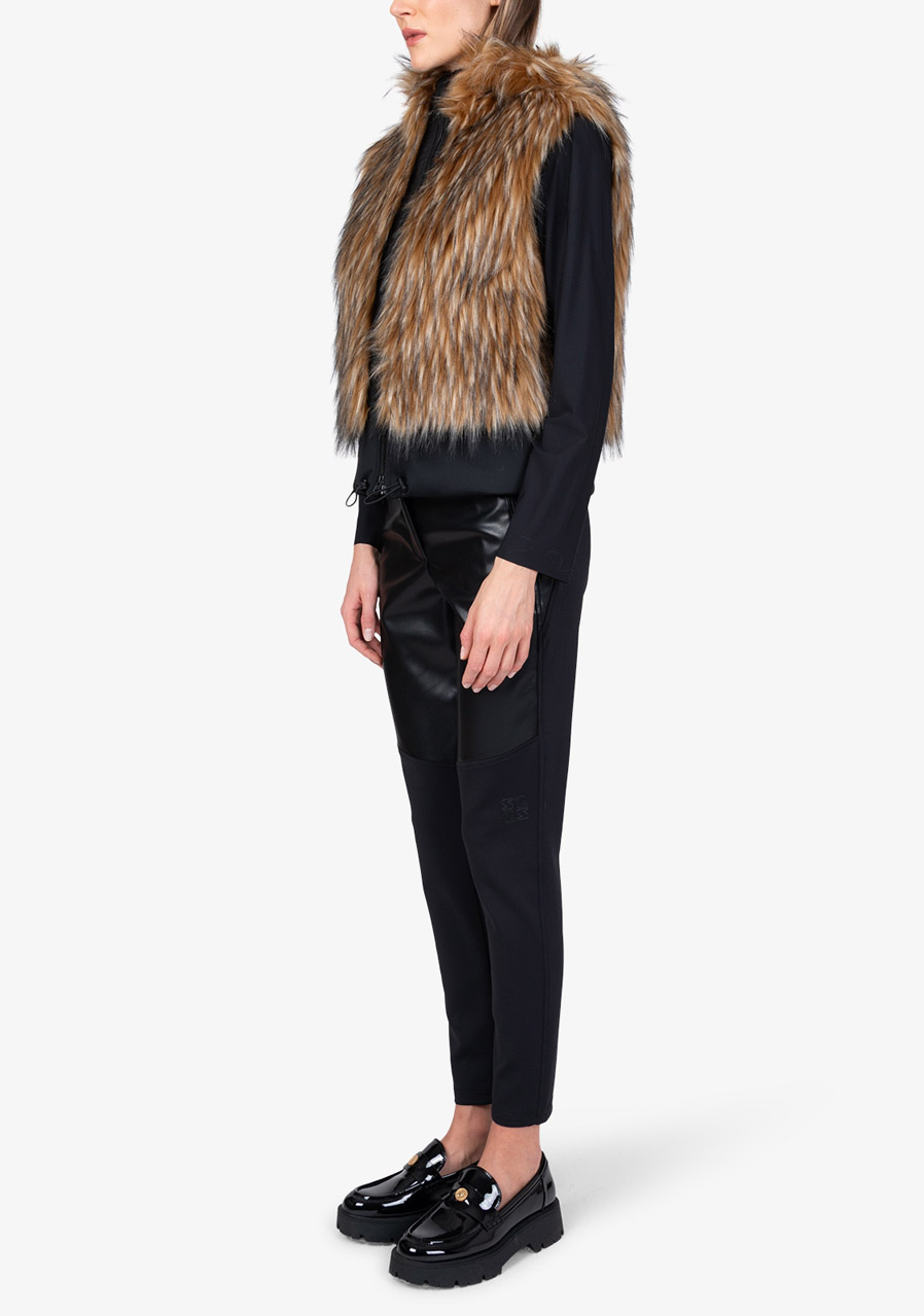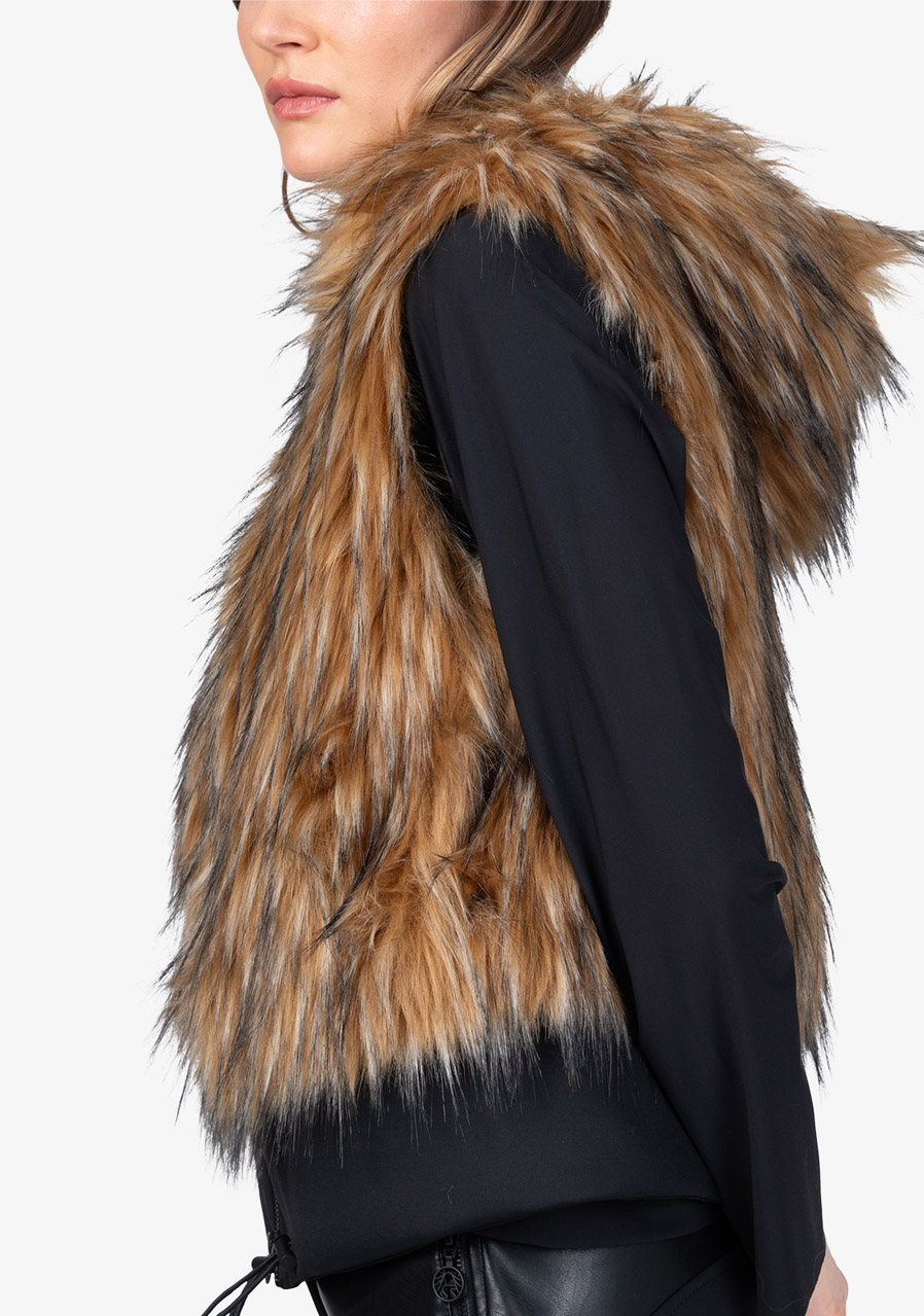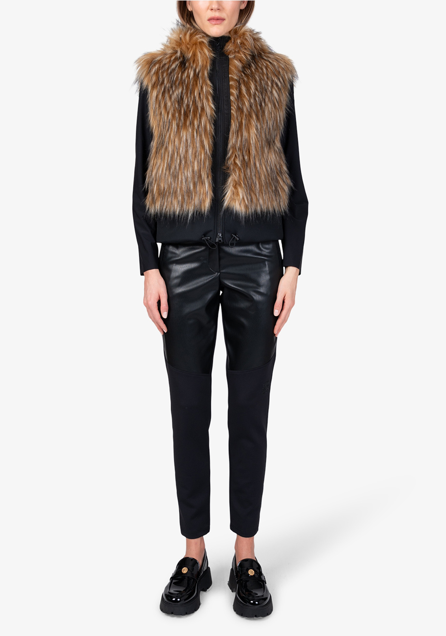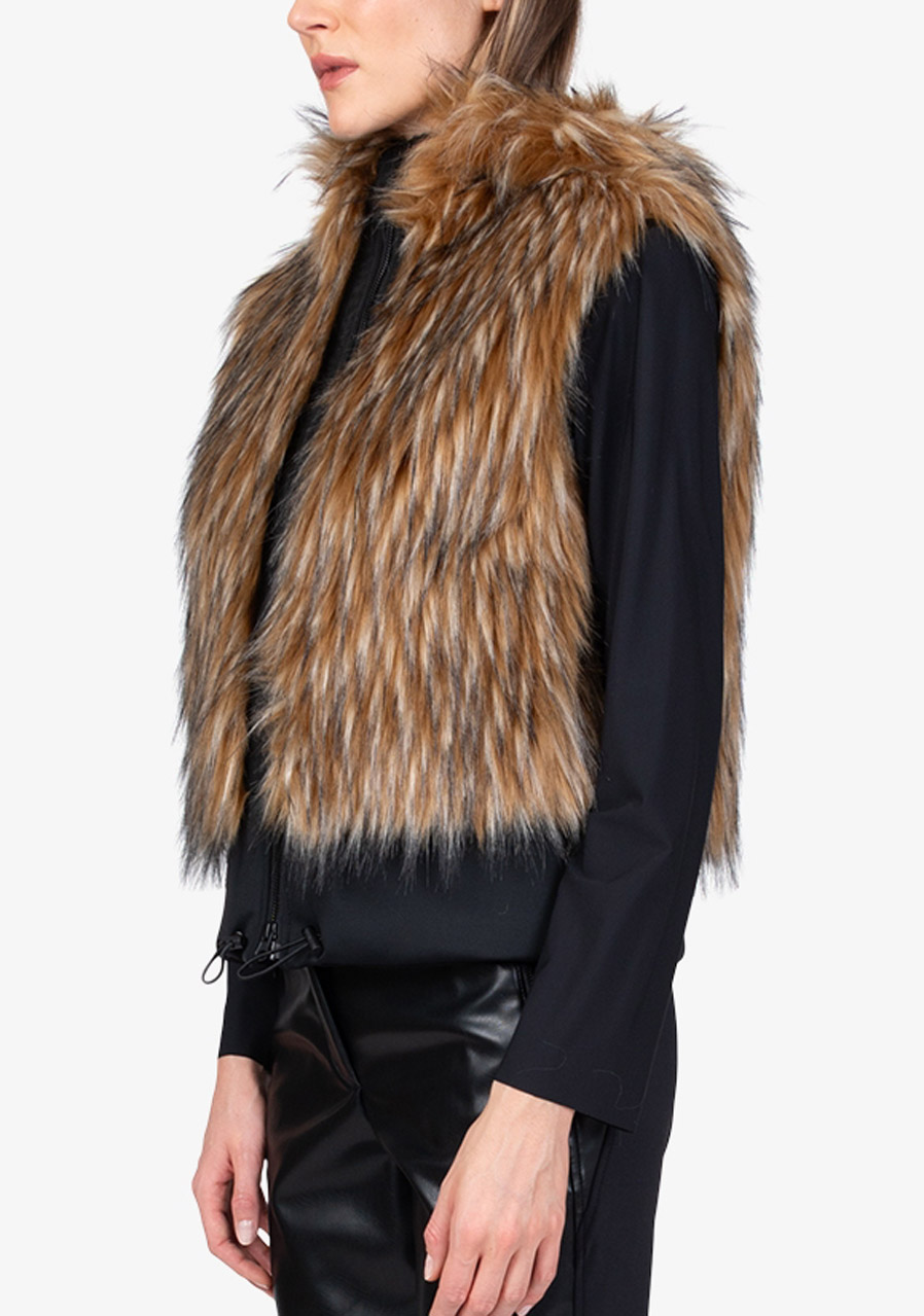 Kamizelka Sportalm ze sztucznego futra z kapturem to luksusowy dodatek, który łączy elegancję, ciepło i nowoczesny design. Wykonana z miękkiego sztucznego futra o fakturze jenota w połączeniu z elastycznym materiałem scuba, prezentuje się ekskluzywnie, a jednocześnie jest wygodna w noszeniu. Kaptur nadaje kamizelce swobodny, stylowy charakter, a dwukierunkowy zamek błyskawiczny i boczne kieszenie zwiększają jej praktyczność. Szeroki dół scuba ze ściągaczem pozwala na regulację szerokości dolnej krawędzi w razie potrzeby. Dzięki pełnej podszewce i precyzyjnemu wykonaniu, kamizelka idealnie nadaje się do noszenia warstwowego i eleganckich zimowych stylizacji.
