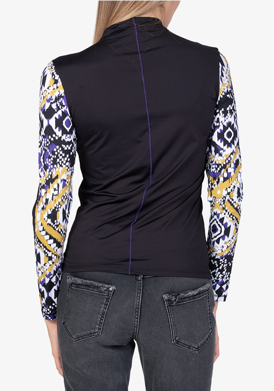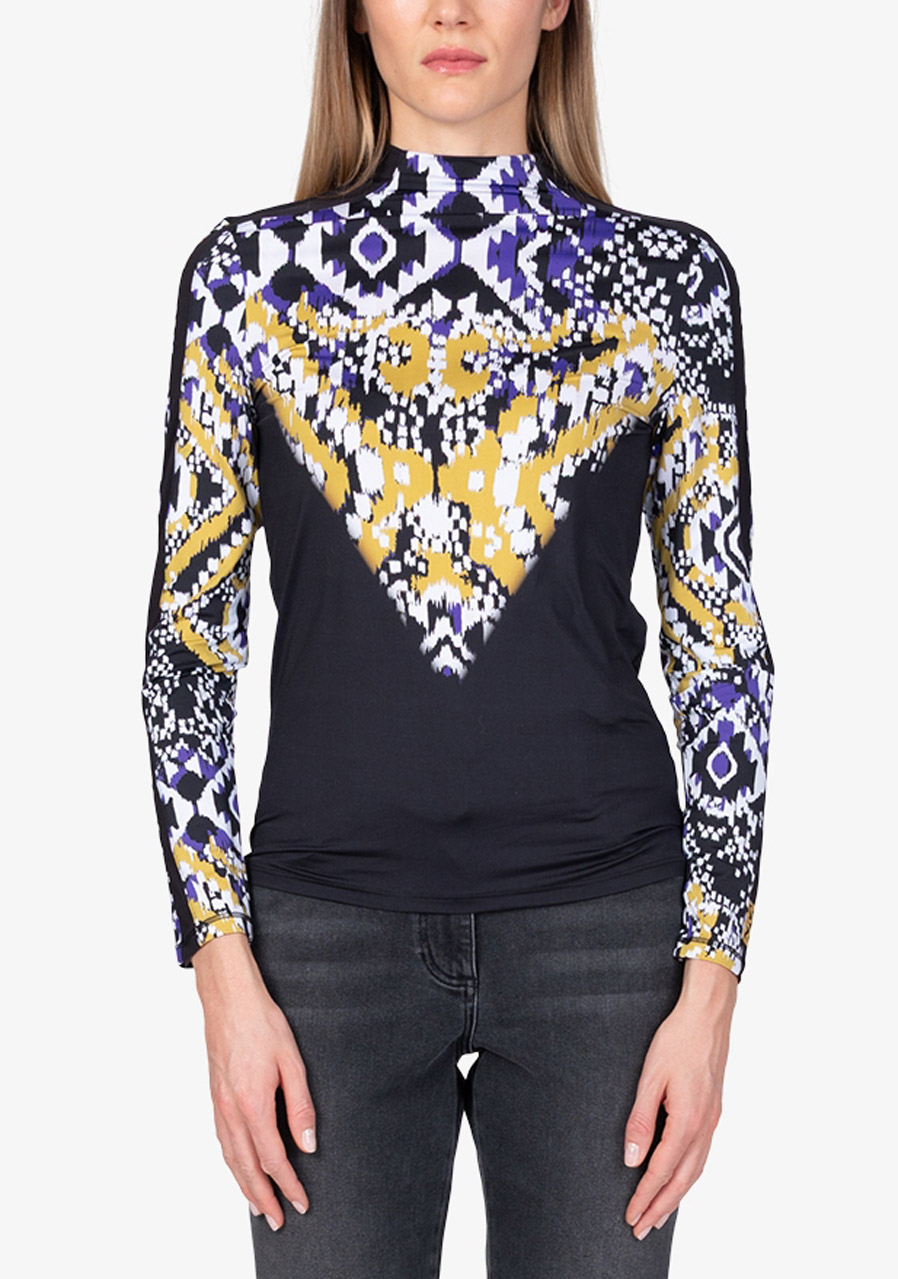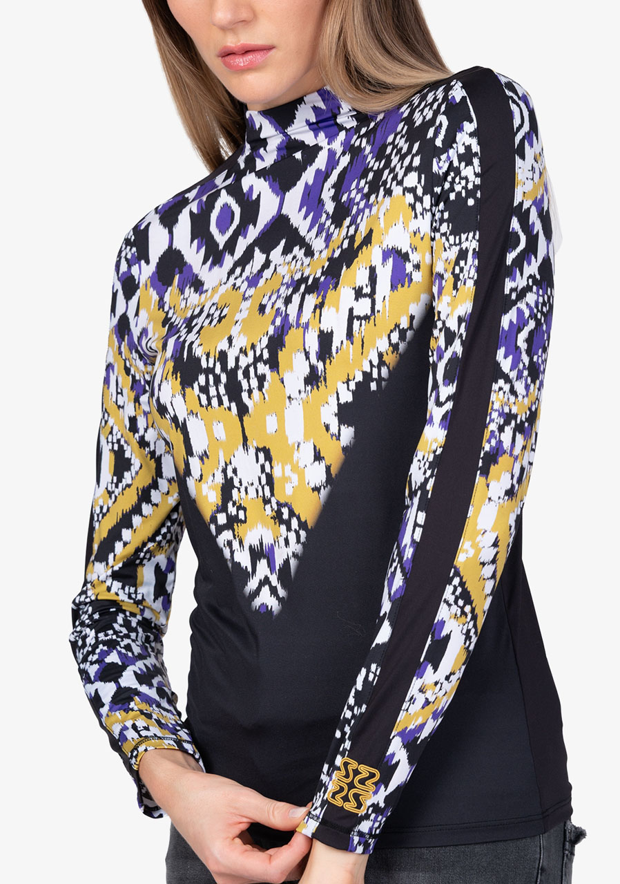 Parametry: Materiał : 85% poliester, 15% elastan Krój : dopasowany, elastyczny Kołnierz : golf, miękki krój Rękawy : długie Wzór : czarna podstawa z oryginalnym nadrukiem Sezon : jesień/zima, nadaje się jako samodzielny element garderoby lub pod kurtkę lub sweter