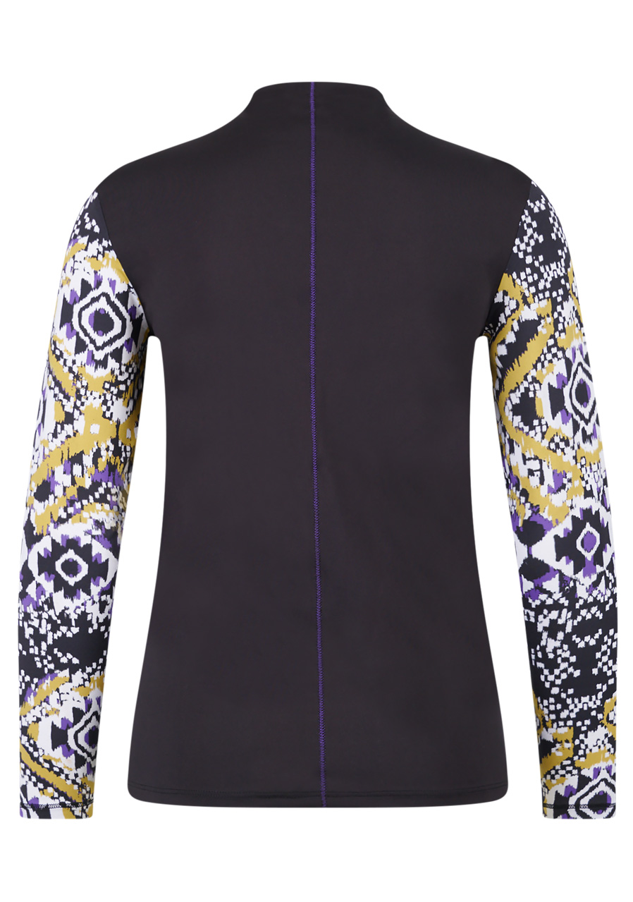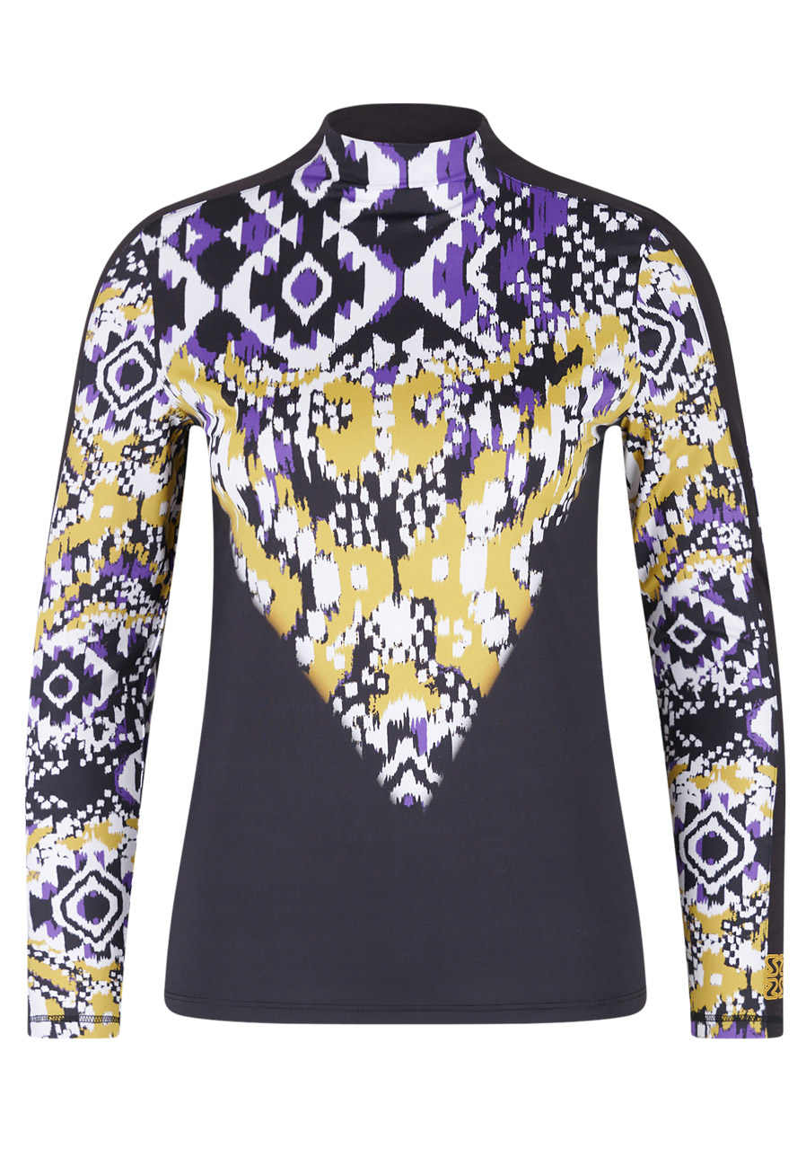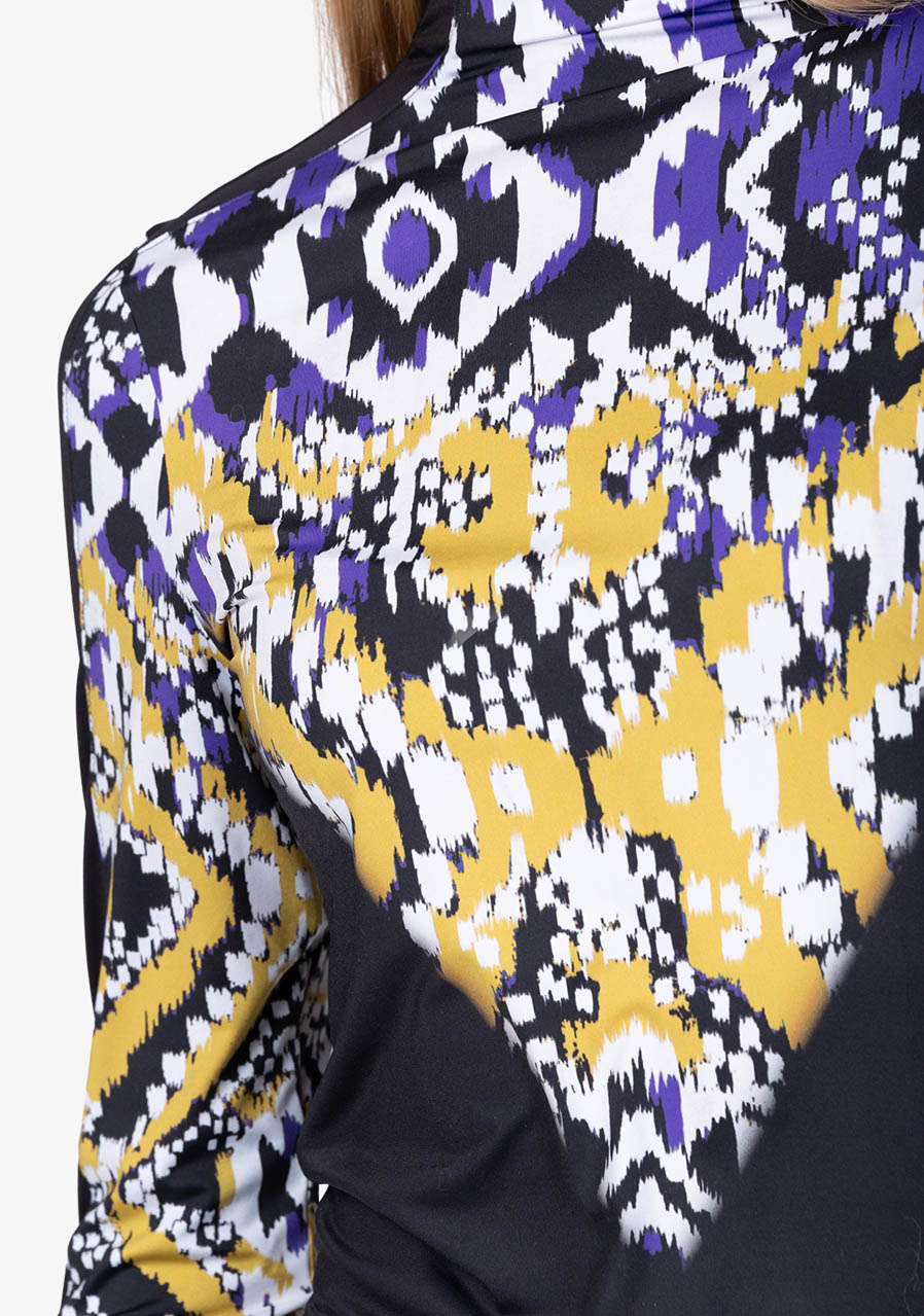 Parametry: Materiał : 85% poliester, 15% elastan Krój : dopasowany, elastyczny Kołnierz : golf, miękki krój Rękawy : długie Wzór : czarna podstawa z oryginalnym nadrukiem Sezon : jesień/zima, nadaje się jako samodzielny element garderoby lub pod kurtkę lub sweter