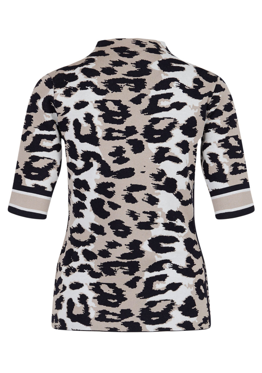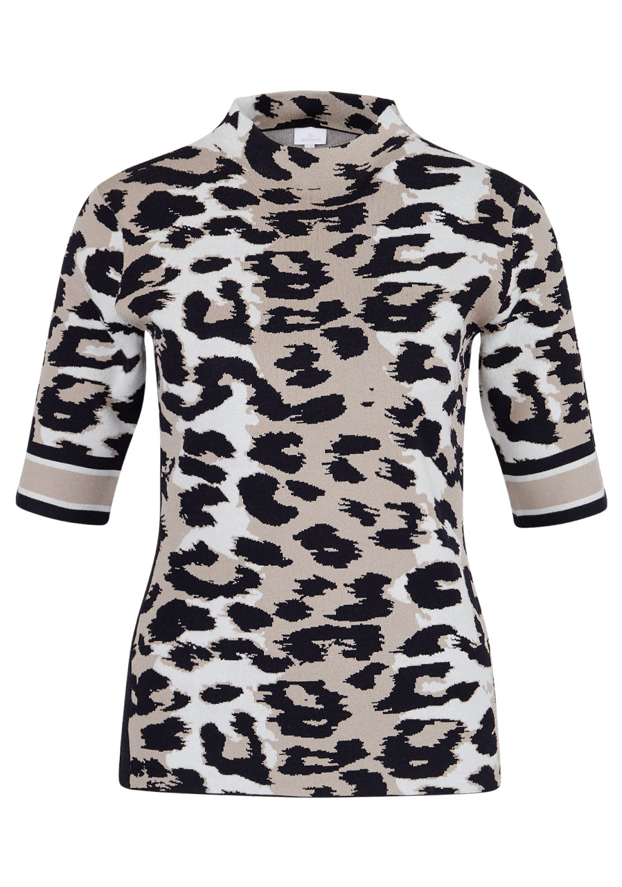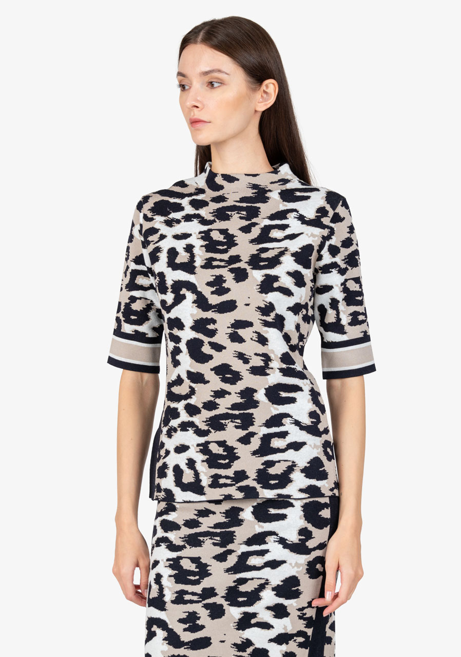 Dámský svetr Sportalm 450145 String je stylovým a moderním kouskem, který vás zaujme svým sofistikovaným leopardím žakárovým vzorem doplněným o nepravidelné svislé pruhy. Tento těsně přiléhající svetr s krátkými rukávy a malým stojatým rolákem je ideální pro ženy, které sledují módní trendy. Zvláštní pozornost si zaslouží vysoký rozparek na pravé straně s žakárovým nápisem Sportalm, který přidává modelu osobitost.