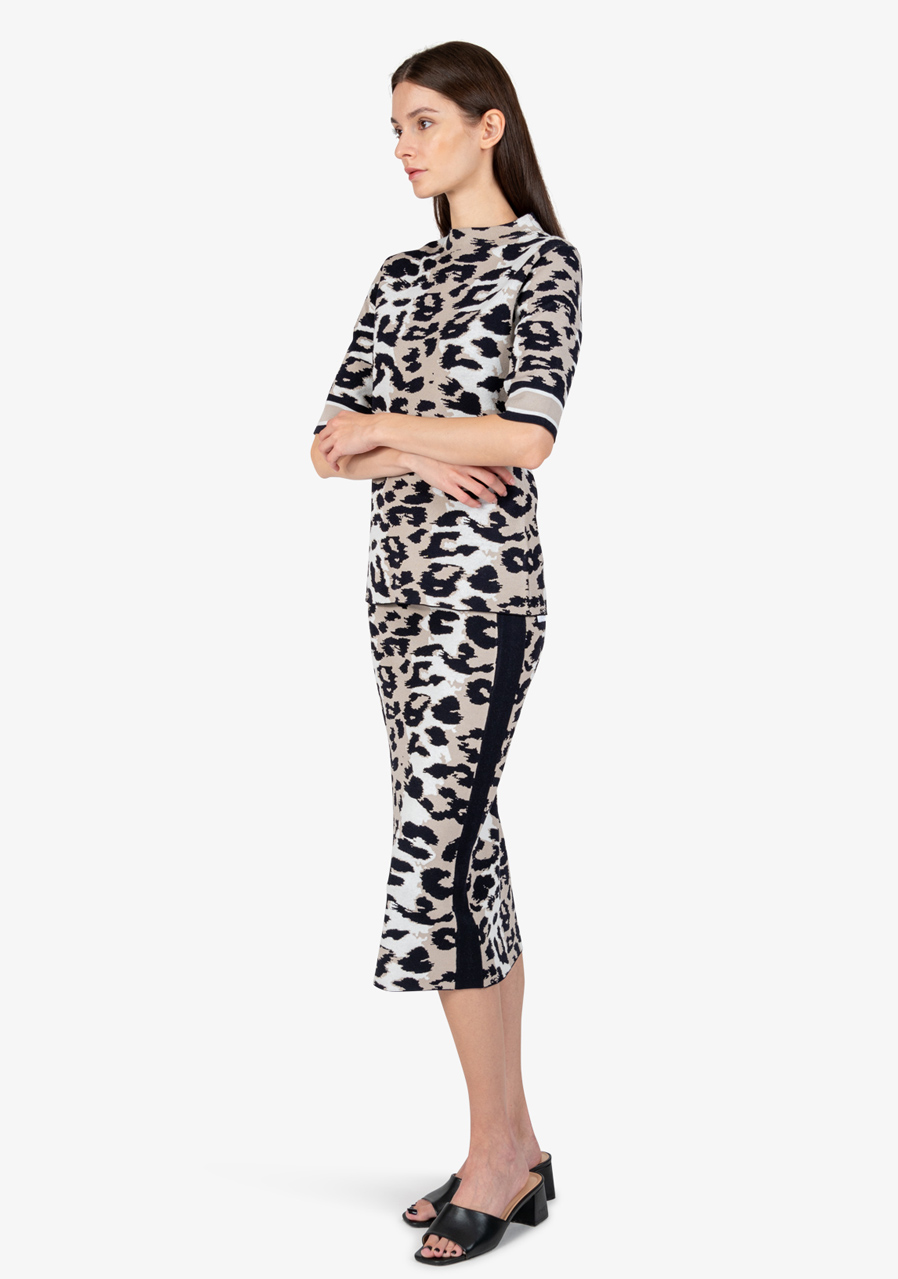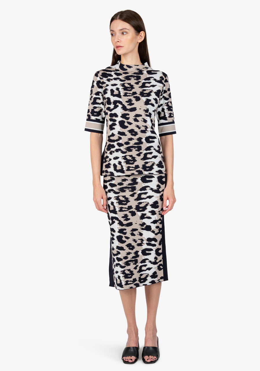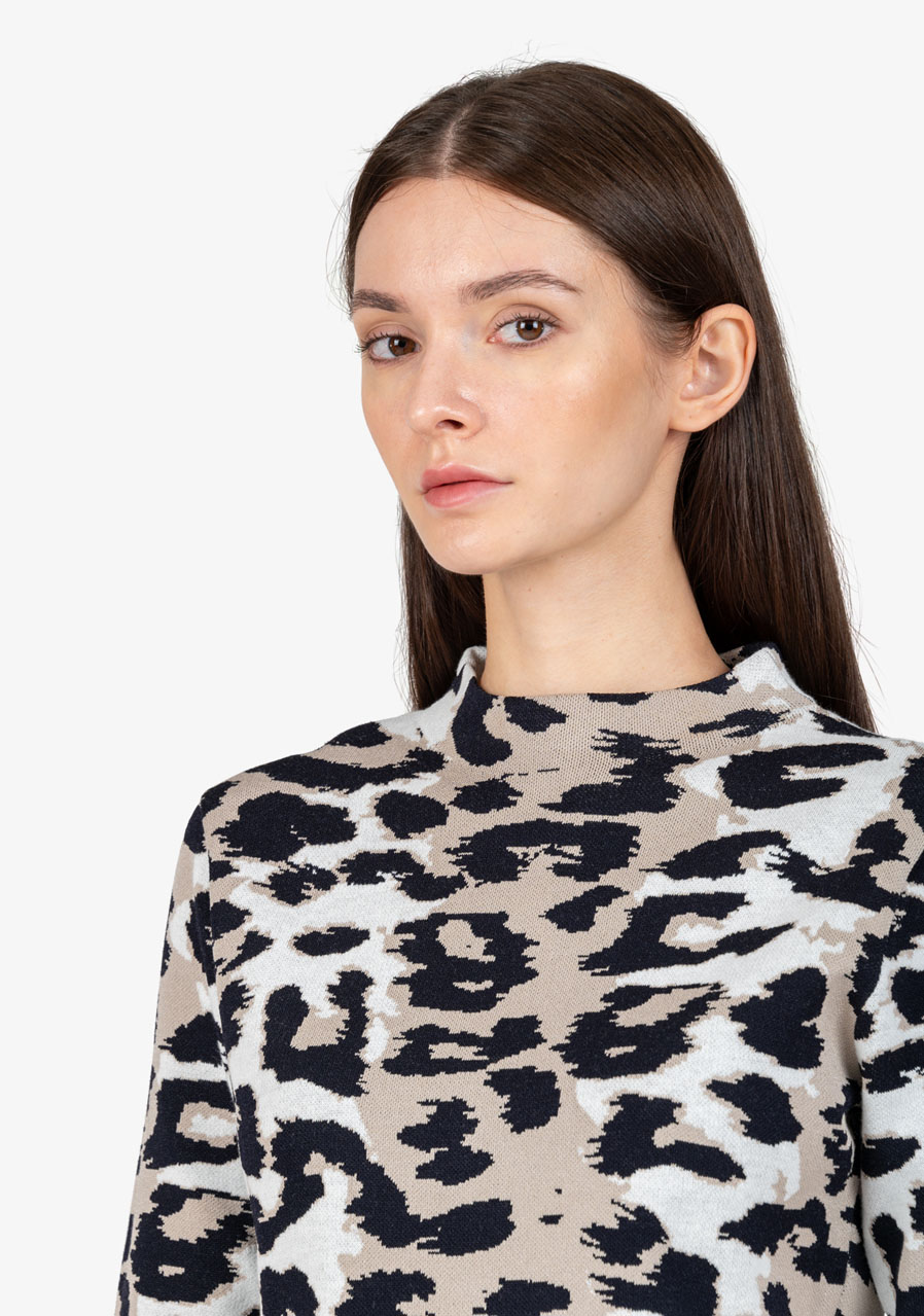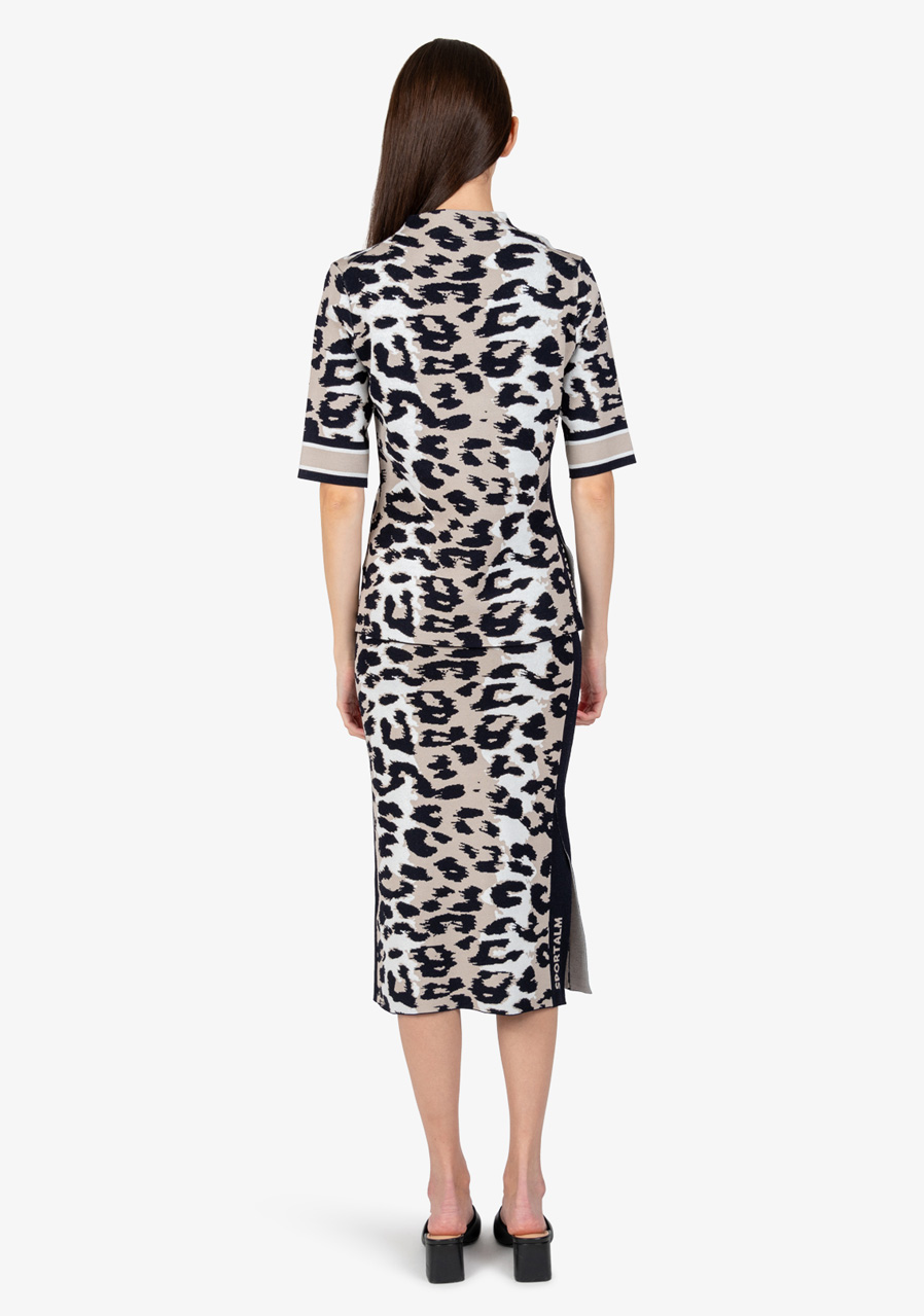 Dámský svetr Sportalm 450145 String je stylovým a moderním kouskem, který vás zaujme svým sofistikovaným leopardím žakárovým vzorem doplněným o nepravidelné svislé pruhy. Tento těsně přiléhající svetr s krátkými rukávy a malým stojatým rolákem je ideální pro ženy, které sledují módní trendy. Zvláštní pozornost si zaslouží vysoký rozparek na pravé straně s žakárovým nápisem Sportalm, který přidává modelu osobitost.