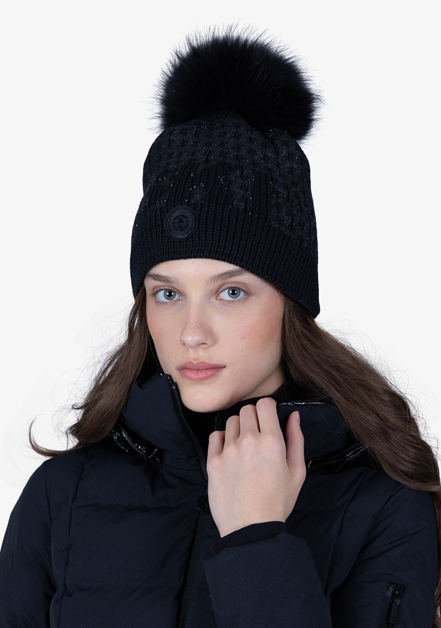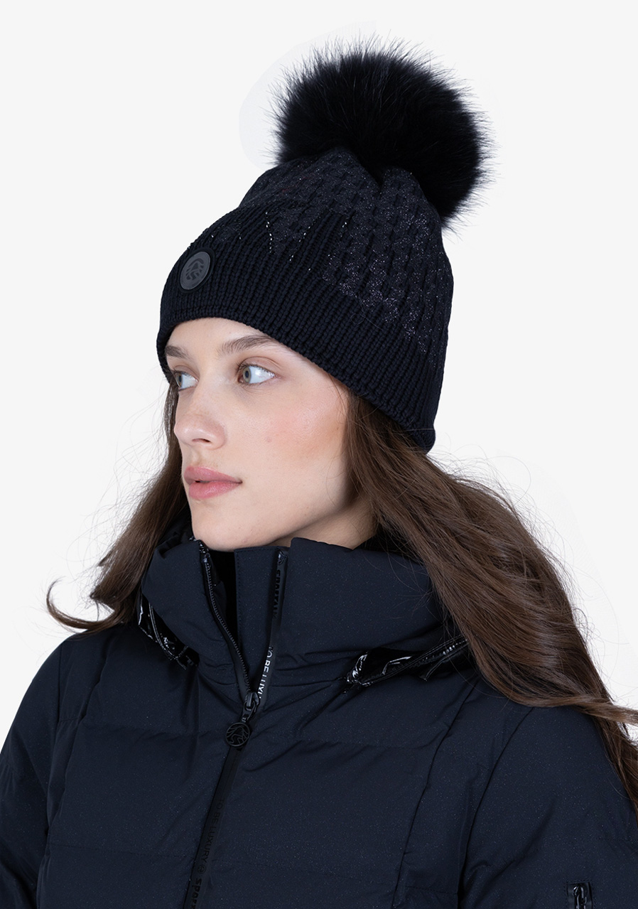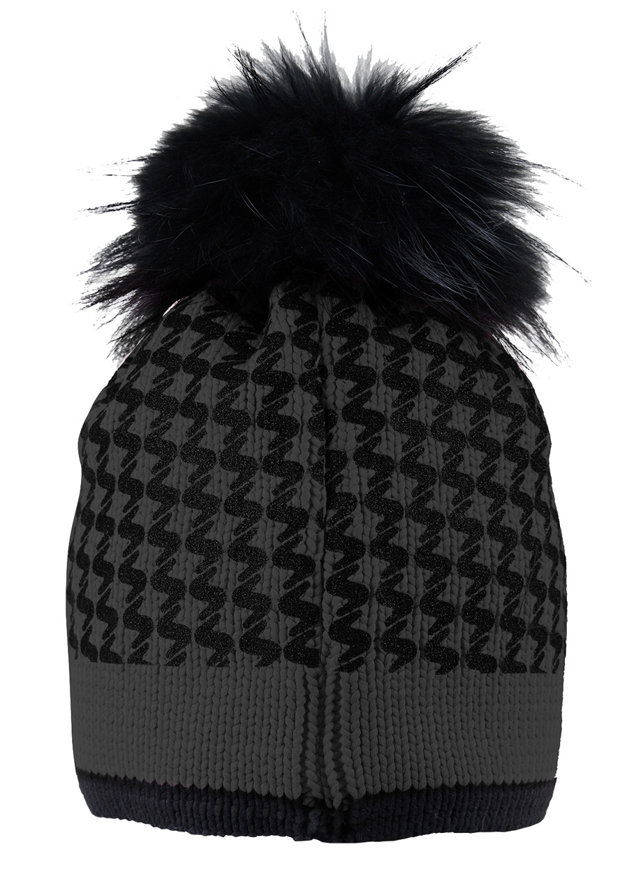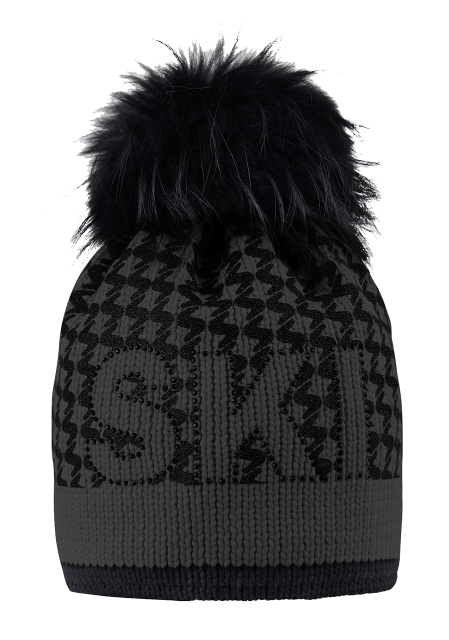 Szczegóły : napis SKI wykonany z matowych kryształków, odpinany pompon z prawdziwego futra