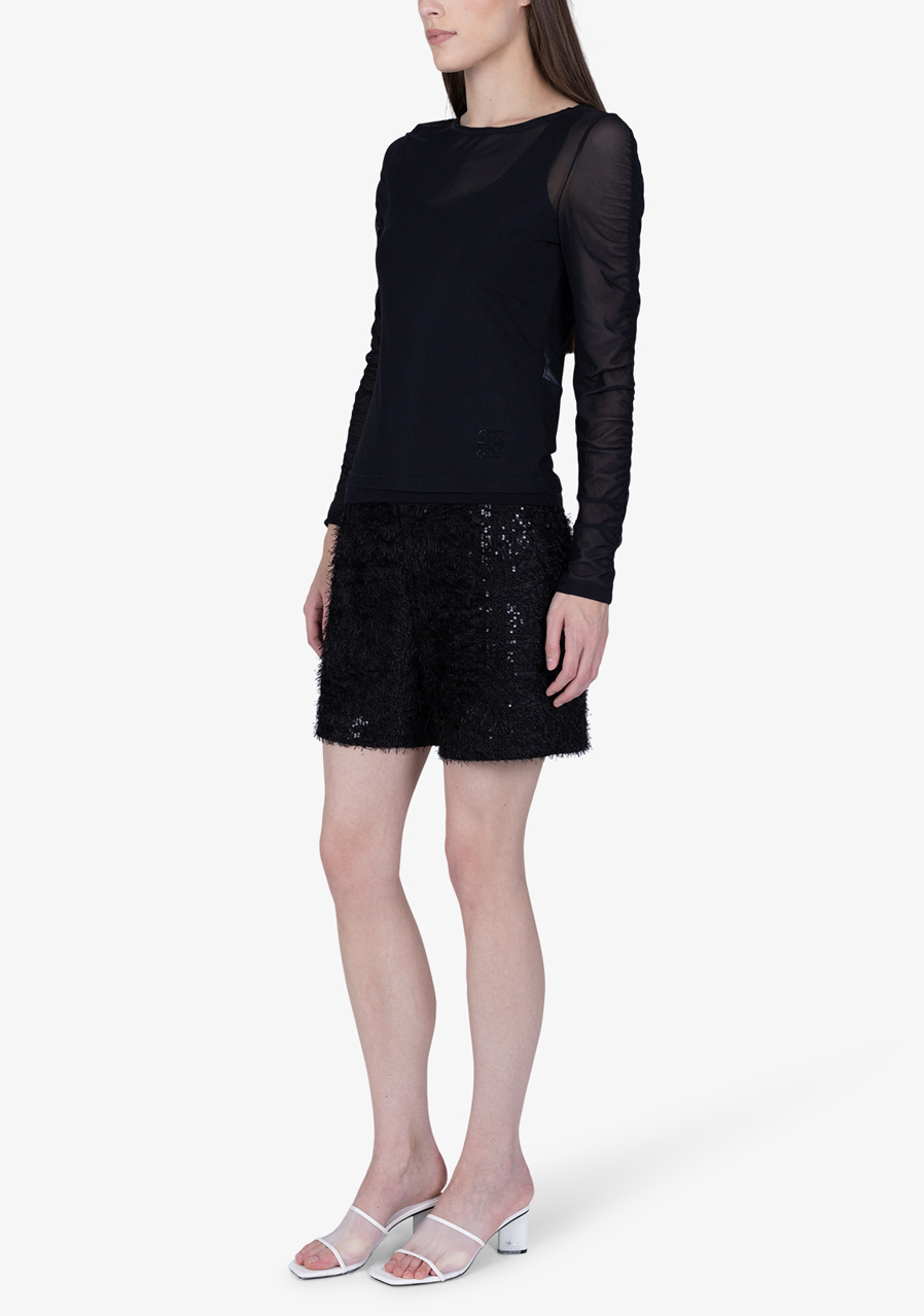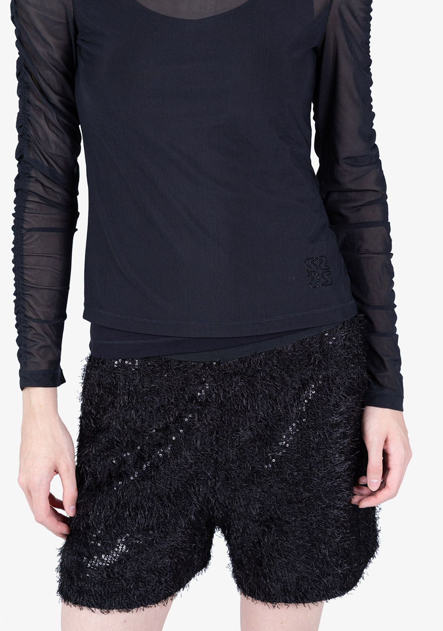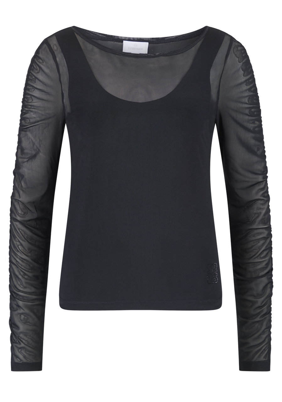 Ta damska tiulowa koszula z wszytą górą łączy w sobie wyrafinowaną lekkość i maksymalny komfort. Miękki, półprzezroczysty tiul nadaje nowoczesny, elegancki wygląd, a wszyta góra z modalu single jersey gwarantuje wygodę noszenia. Dopasowany, dopasowany krój idealnie dopasowuje się do sylwetki, a falbany wzdłuż pach nadają koszuli romantyczny akcent. Dekolt w serek z przodu, kontrastujący z okrągłym dekoltem tiulu, podkreśla wyjątkowy design. Trójwymiarowy motyw hotfix na dole i trójwymiarowy silikonowy napis Sportalm z tyłu podkreślają ekskluzywny charakter tego modelu. Idealna do nowoczesnych stylizacji kobiet, które chcą zachwycać subtelnością i detalami.