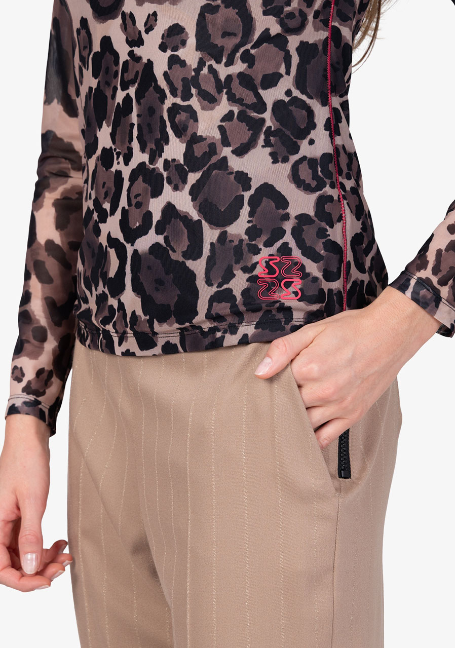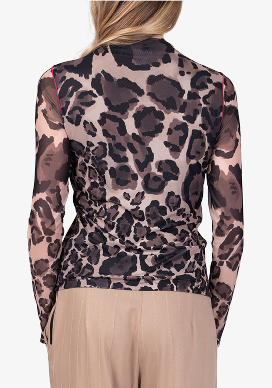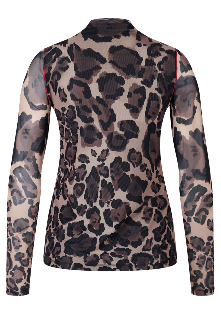 Parametry: Materiał : miękka siateczka Skład : 94% poliester, 6% elastan (typowy dla tego typu modelu) Krój : dopasowany, dwuwarstwowy Wzór : charakterystyczny nadruk na całej powierzchni Dekolt : dopasowany kołnierz stójka Rękawy : długie, wąskie Długość tyłu (rozmiar 36) : 61 cm Styl : modny, kobiecy Sezon : Jesień/Zima 2025
