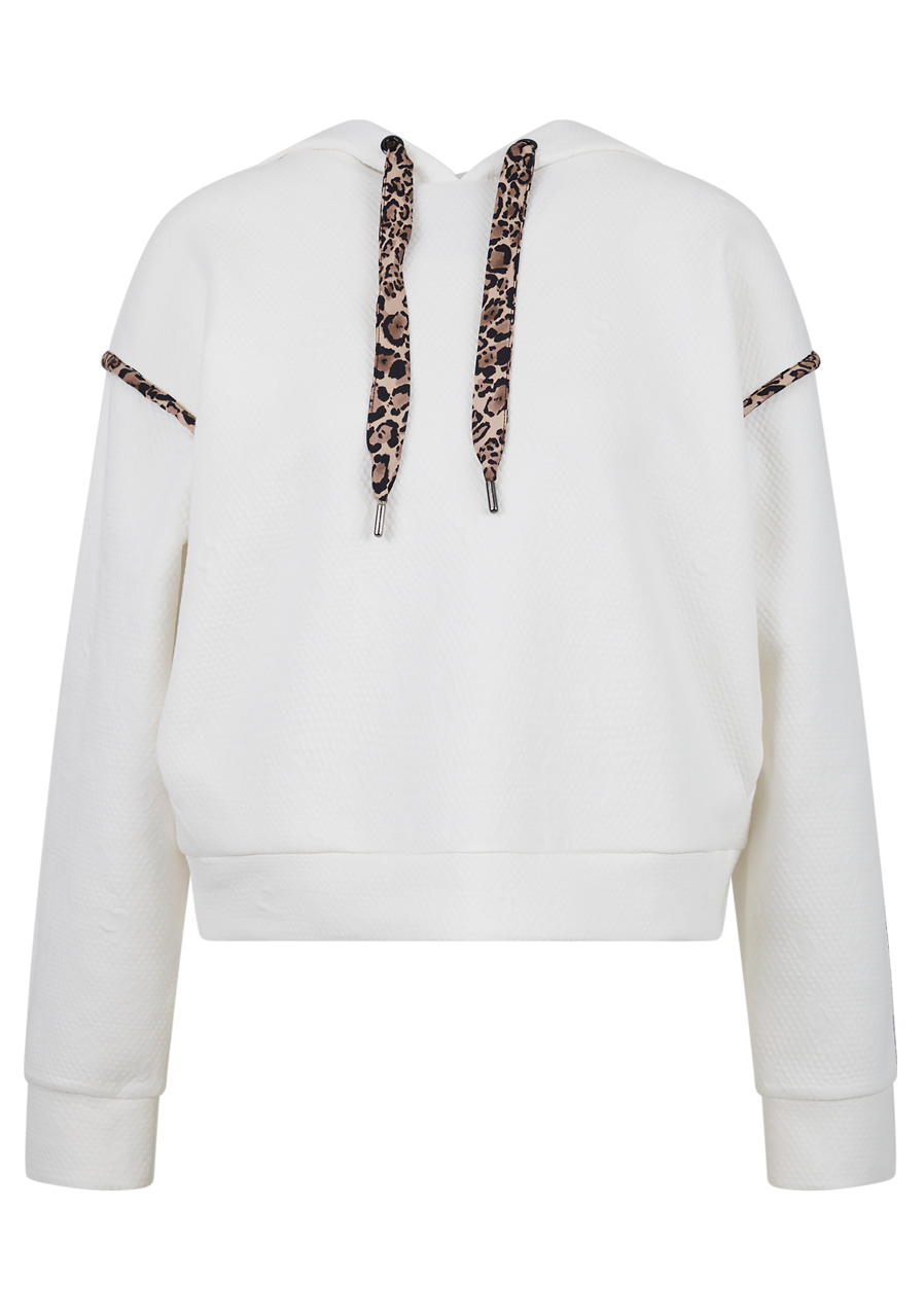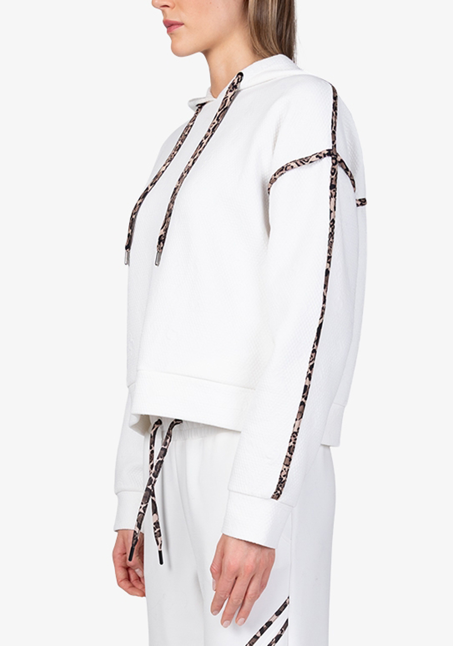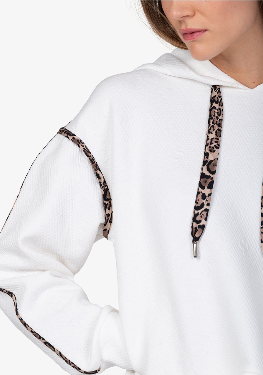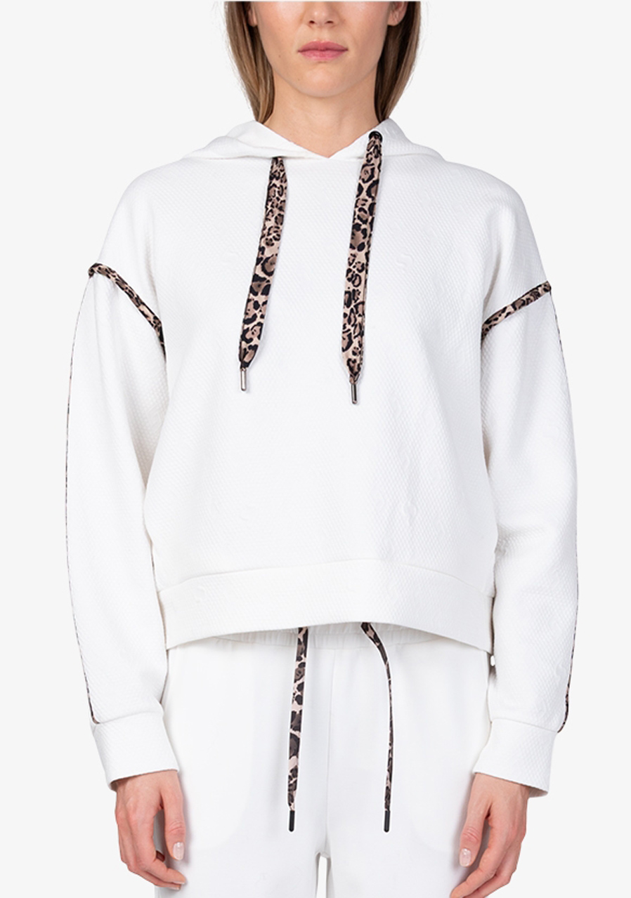 Parametry: Materiał : wysokiej jakości dzianina dresowa połączona z matową satyną Skład : 60% poliester, 35% wiskoza, 5% elastan (typowy skład dresu żakardowego) Cięcie : luźne Kaptur : z matową satynową lamówką w panterkę Rękawy : długie, ze ściągaczami i satynowymi paskami w panterkę Kieszenie : kieszenie boczne Szczegóły : satynowa lamówka z motywem panterki z tyłu, graficzny żakard Sportalm w kształcie litery „S” Długość tyłu (rozmiar 36) : 56 cm Styl : modny, sportowy, swobodny Sezon : Jesień/Zima 2025