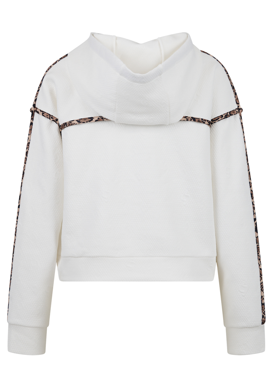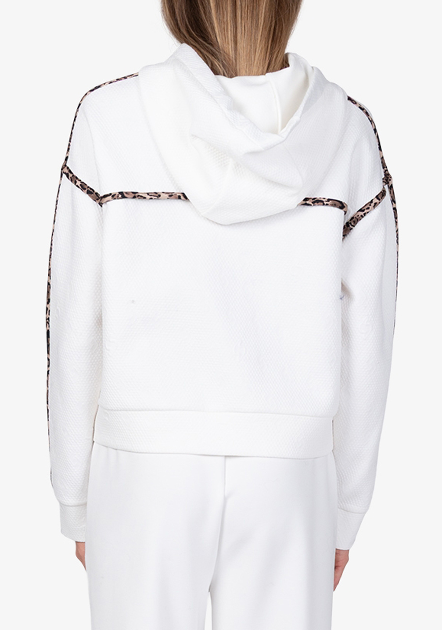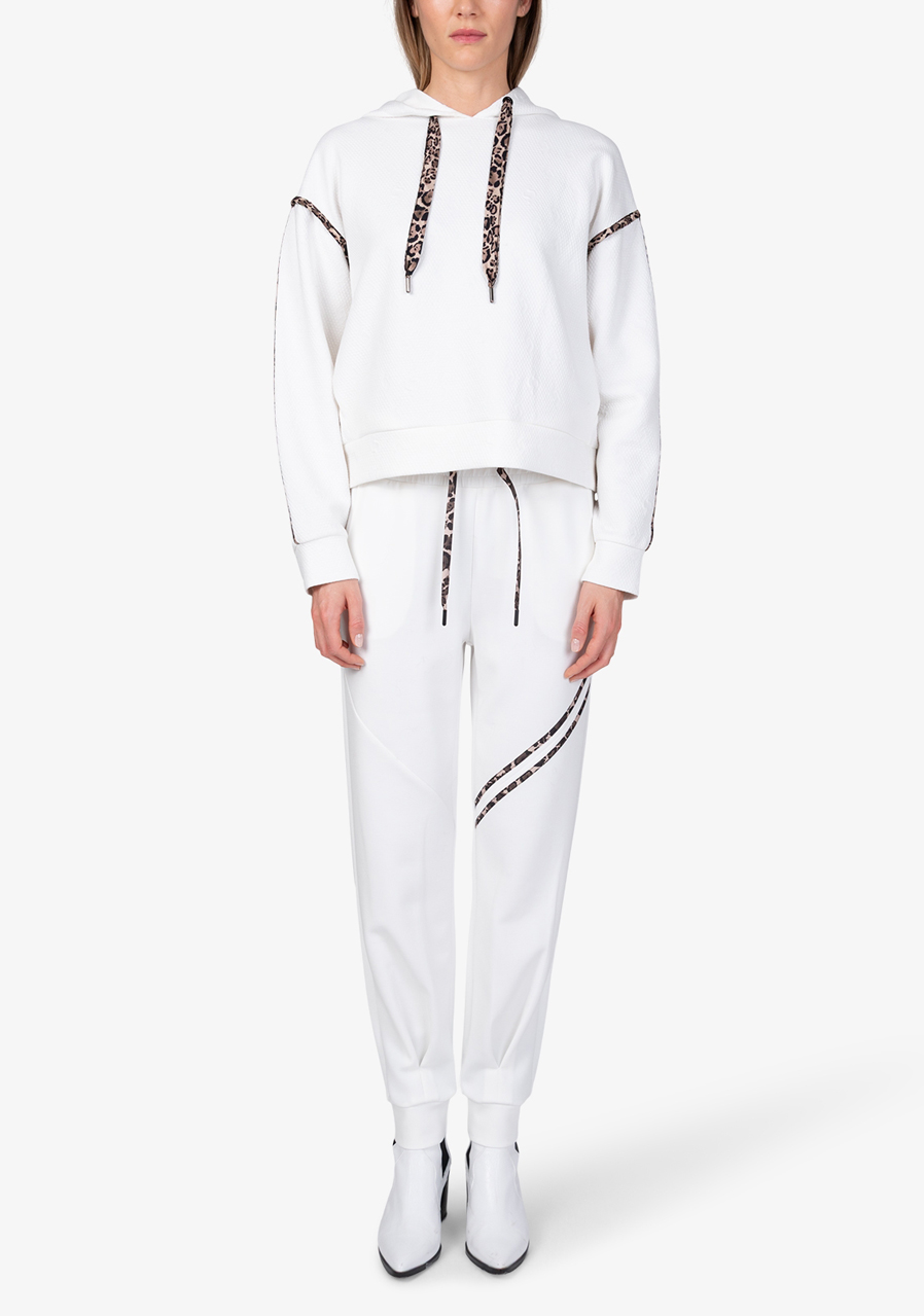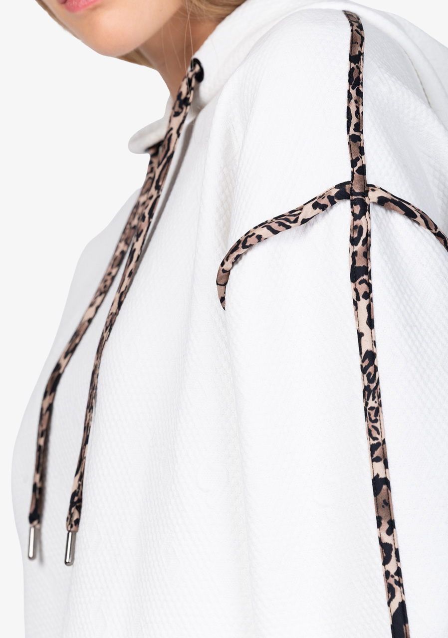 Parametry: Materiał : wysokiej jakości dzianina dresowa połączona z matową satyną Skład : 60% poliester, 35% wiskoza, 5% elastan (typowy skład dresu żakardowego) Cięcie : luźne Kaptur : z matową satynową lamówką w panterkę Rękawy : długie, ze ściągaczami i satynowymi paskami w panterkę Kieszenie : kieszenie boczne Szczegóły : satynowa lamówka z motywem panterki z tyłu, graficzny żakard Sportalm w kształcie litery „S” Długość tyłu (rozmiar 36) : 56 cm Styl : modny, sportowy, swobodny Sezon : Jesień/Zima 2025