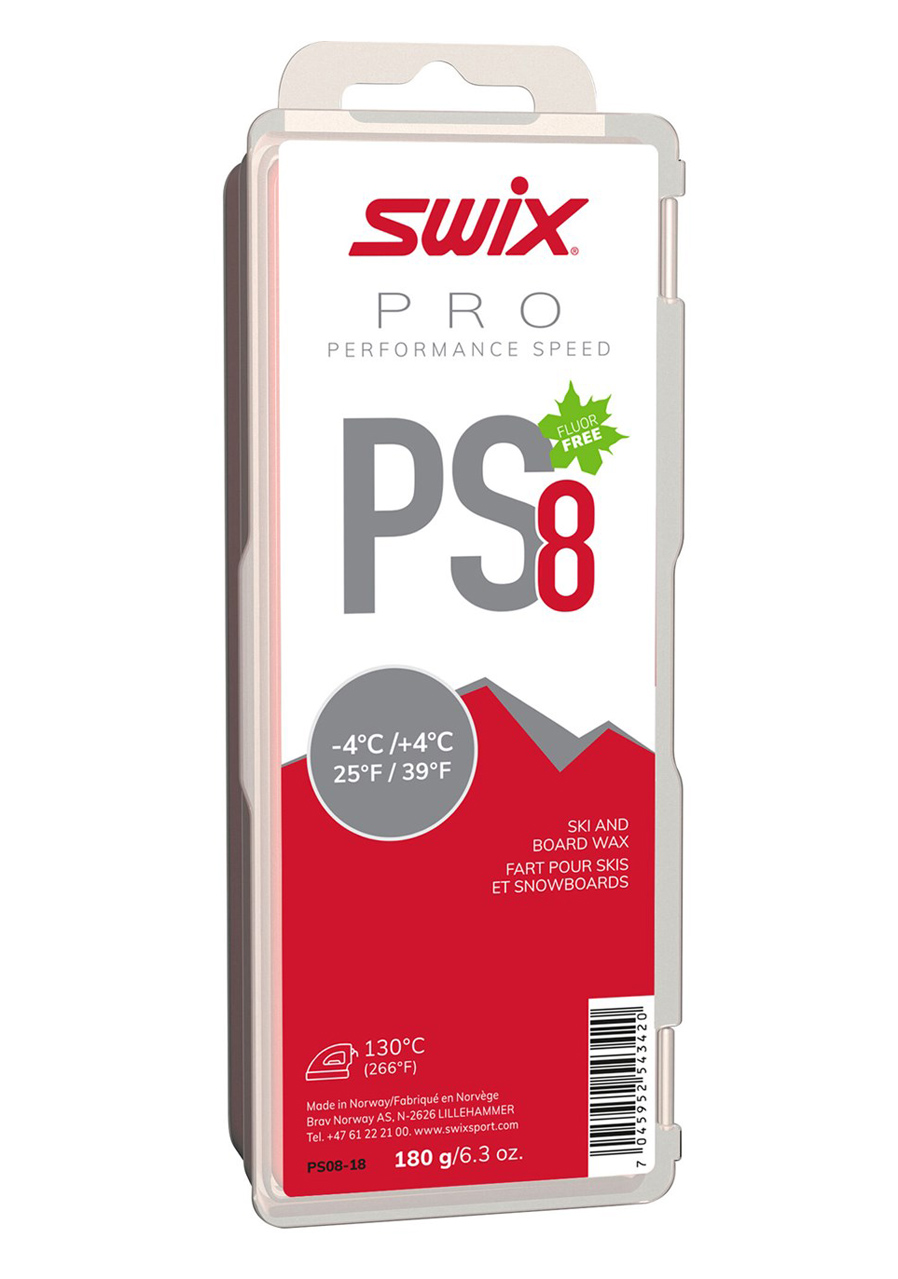PS8 ČERVENÝ -4°C až +4°C PS8 je skvělý vosk jak pro promazávání nových nebo nově nastrukturovaných lyží, tak pro trénink. Může být použit i jako závodní vosk v dětských žákovských kategoriích. Jednoduše se nanáší a dobře se s ním pracuje. Doporučená teplota zažehlování: 130°CPS8 ČERVENÝ