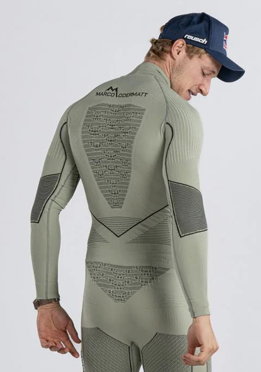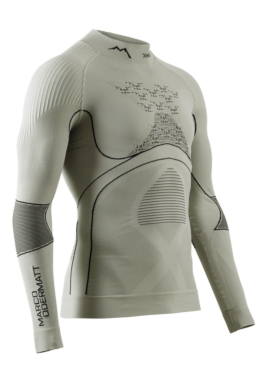 Męska koszulka termoaktywna X-BIONIC® Energy Accumulator 4.0 Marco Odermatt z wysokim kołnierzem (Turtle Neck) i długimi rękawami w eleganckiej kolorystyce Tea Grey/Black G380 powstała we współpracy ze światowym mistrzem alpejskiego narciarstwa. Oferuje najwyższą termoregulację, inteligentne odprowadzanie wilgoci i maksymalny komfort dzięki technologii 3D Bionic Sphere® System i precyzyjnie rozmieszczonym strefom funkcjonalnym. Wysoki kołnierz chroni szyję przed chłodem, co czyni ją idealnym wyborem dla wymagających sportów zimowych.